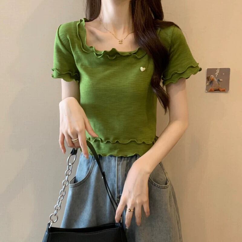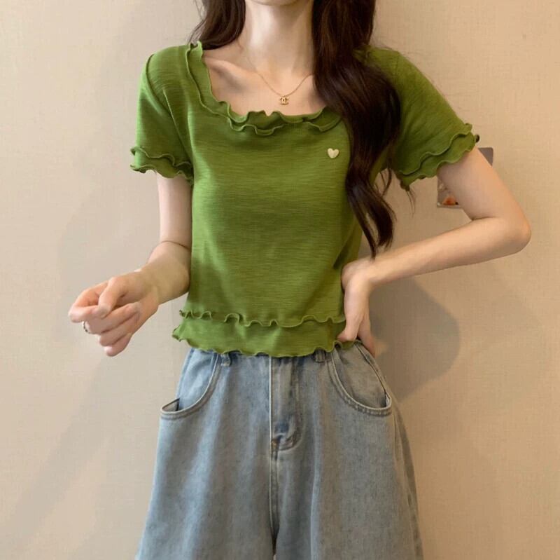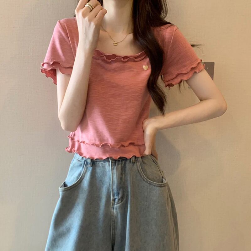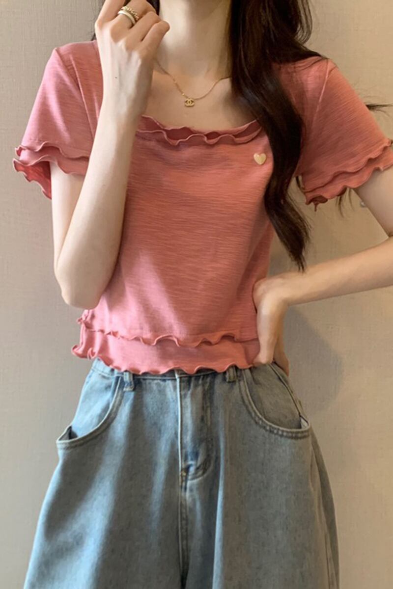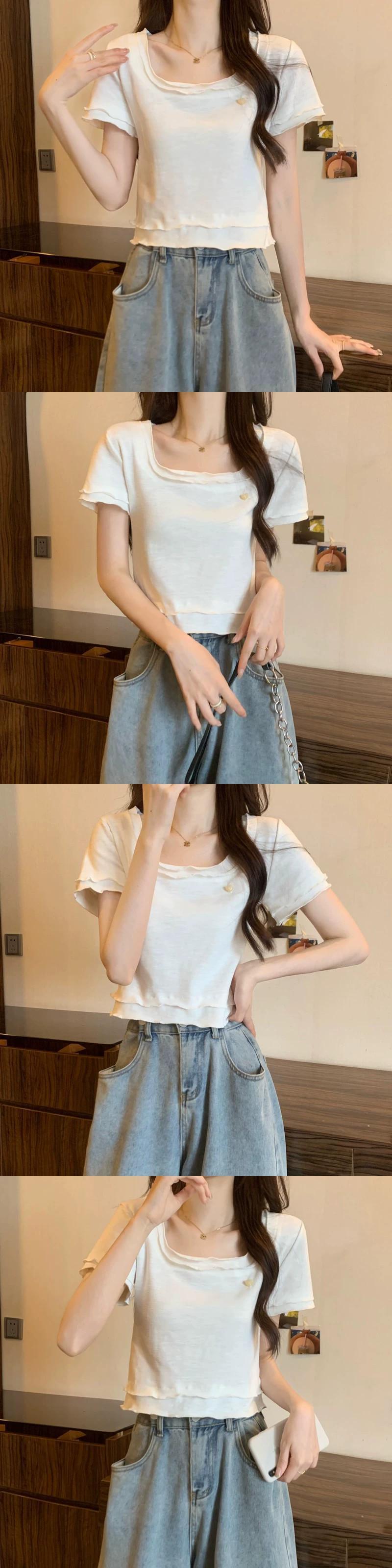 フェイクツーピースフロントショルダー半袖Tシャツレディース夏デザイン感ニッチスリムスリム木耳サイドショートスクエアカラートップス サマー 夏物 スクウェア 7460087363441352 | framboise21