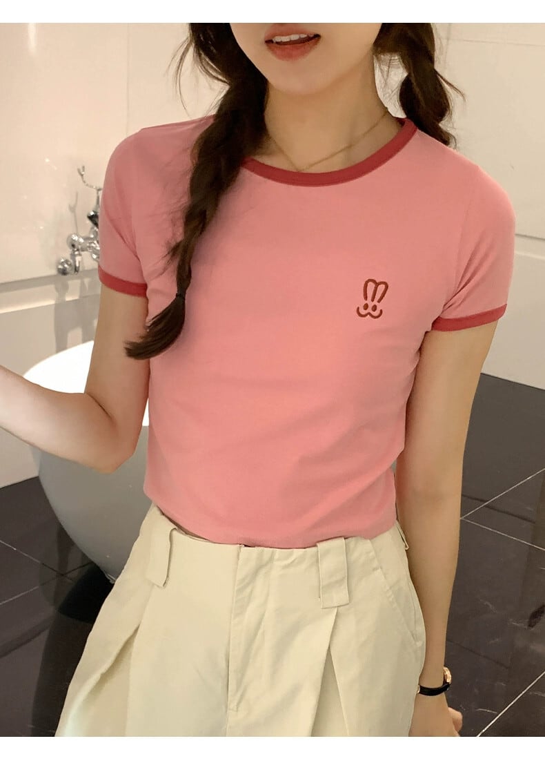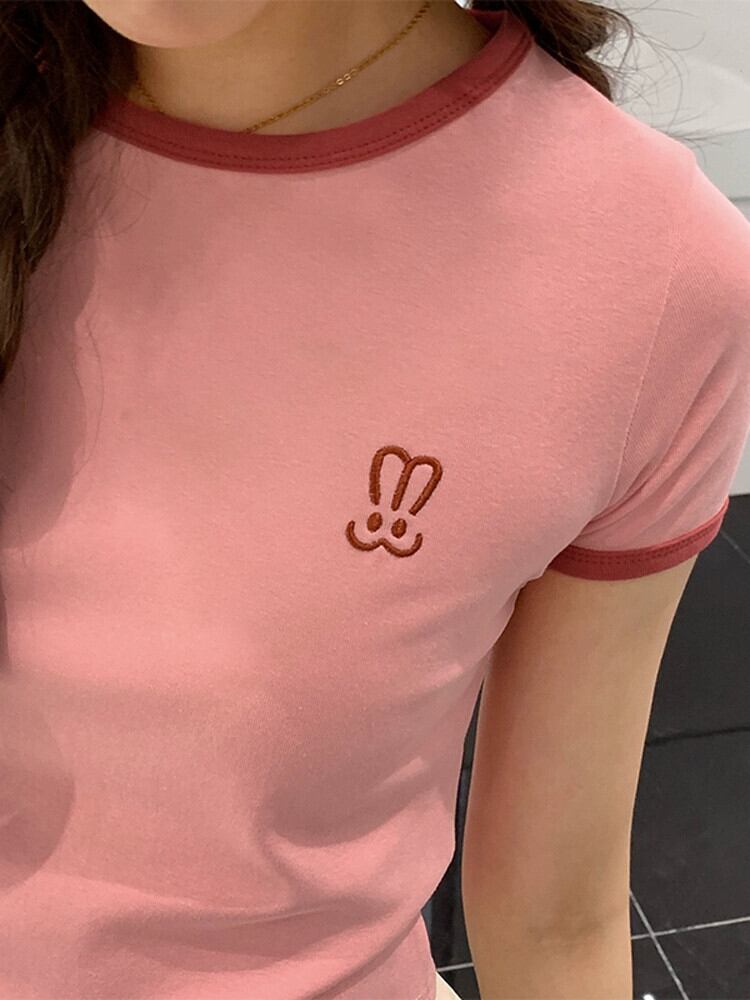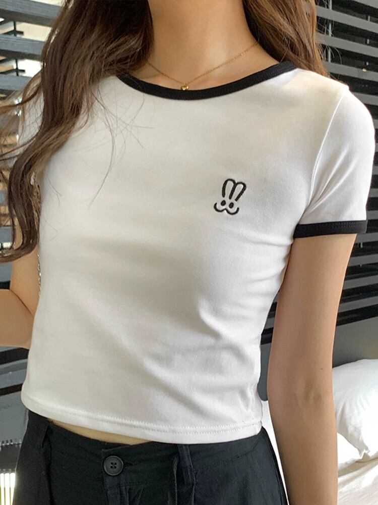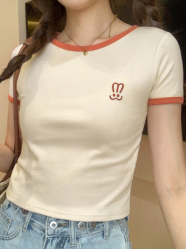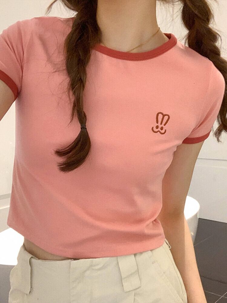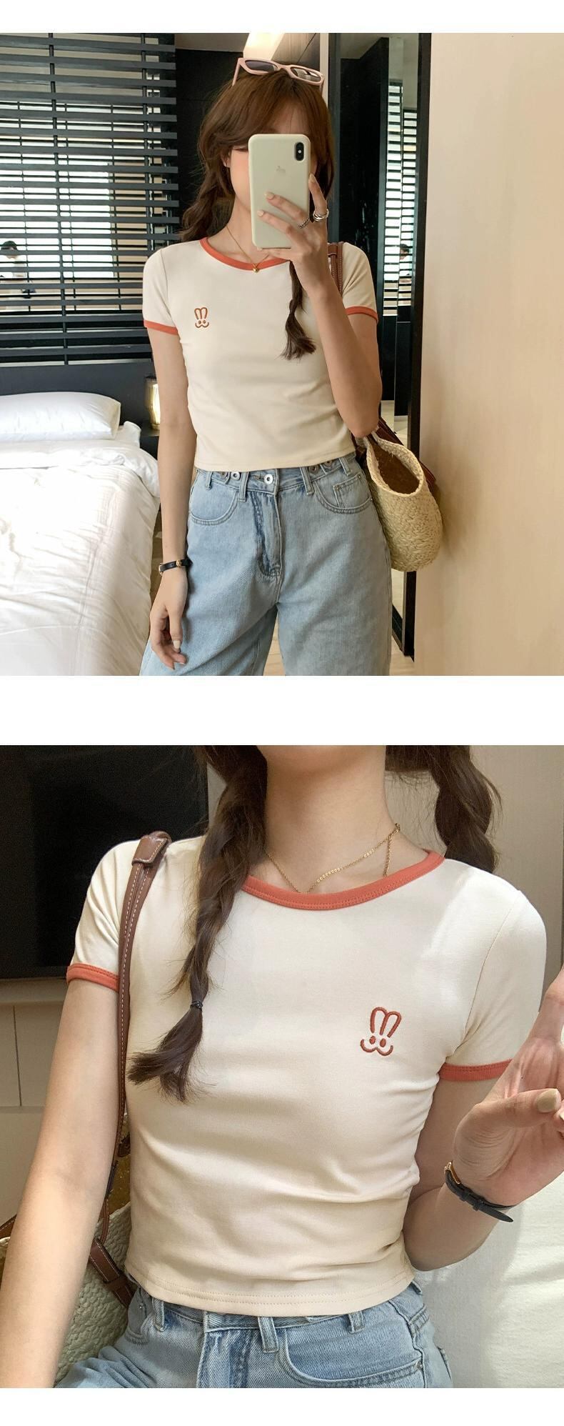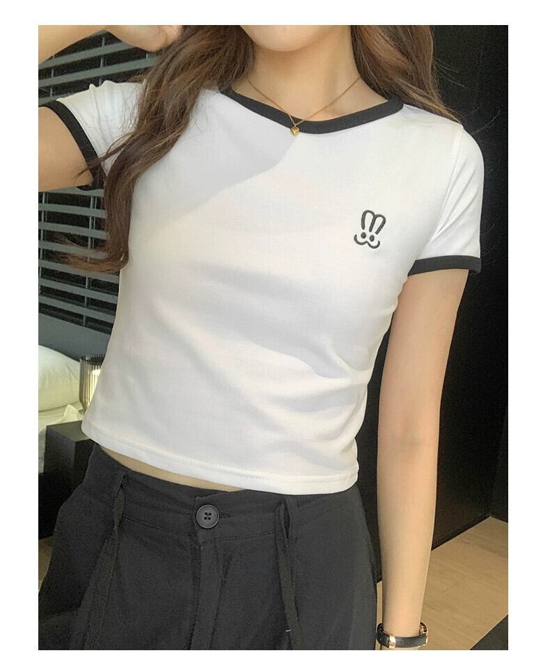 コントラストカラーフロントショルダー半袖Tシャツレディース夏の新2023スタイル小男スリムハイウエストスリムショートトップ ハイウェスト サマー 夏物 7460083985834352 | framboise21