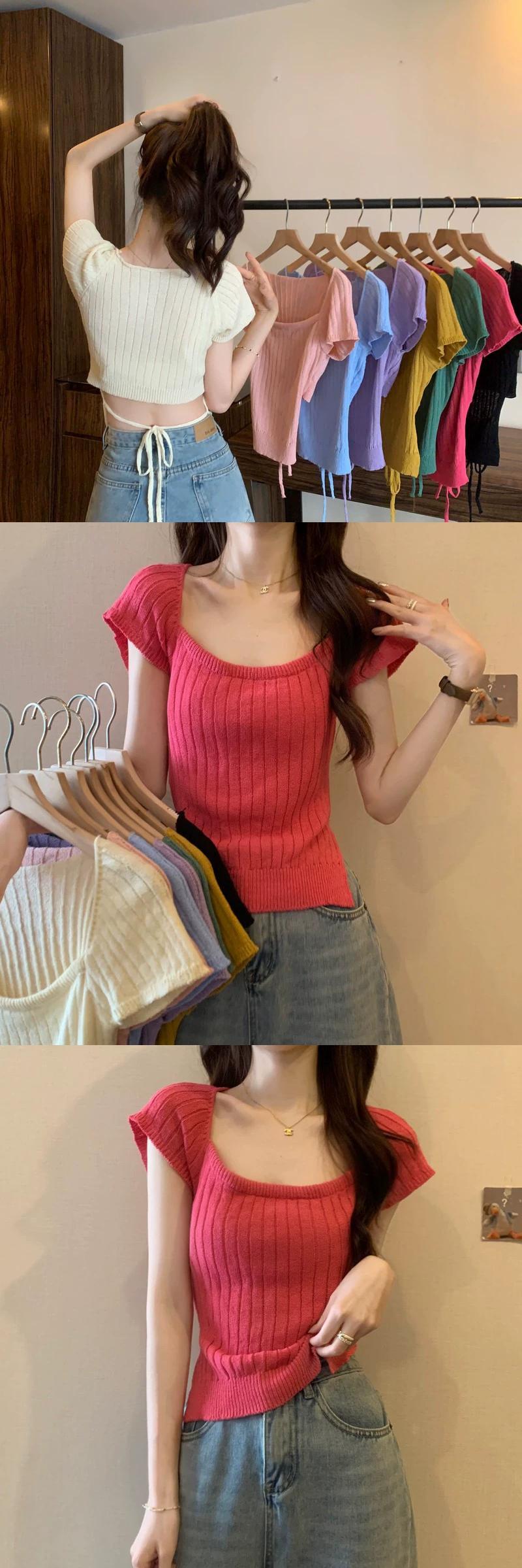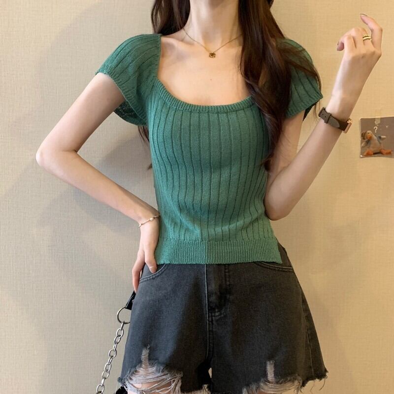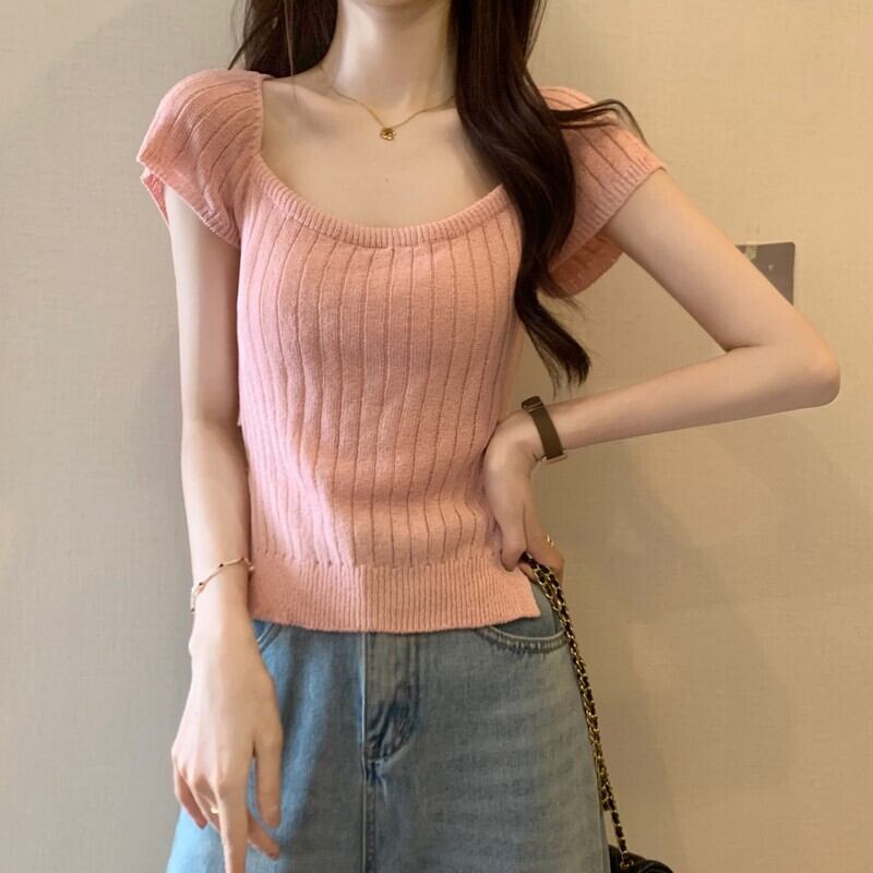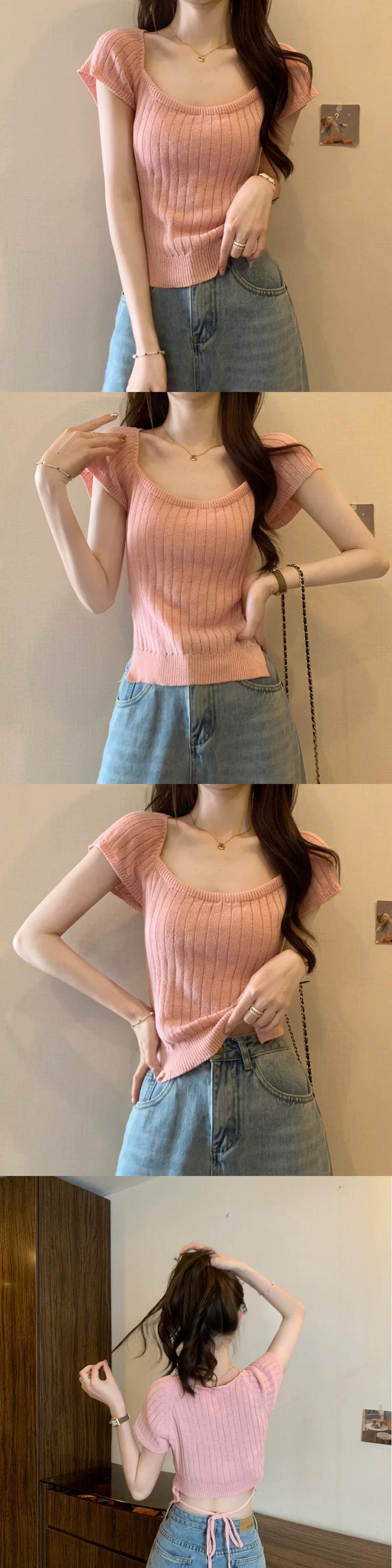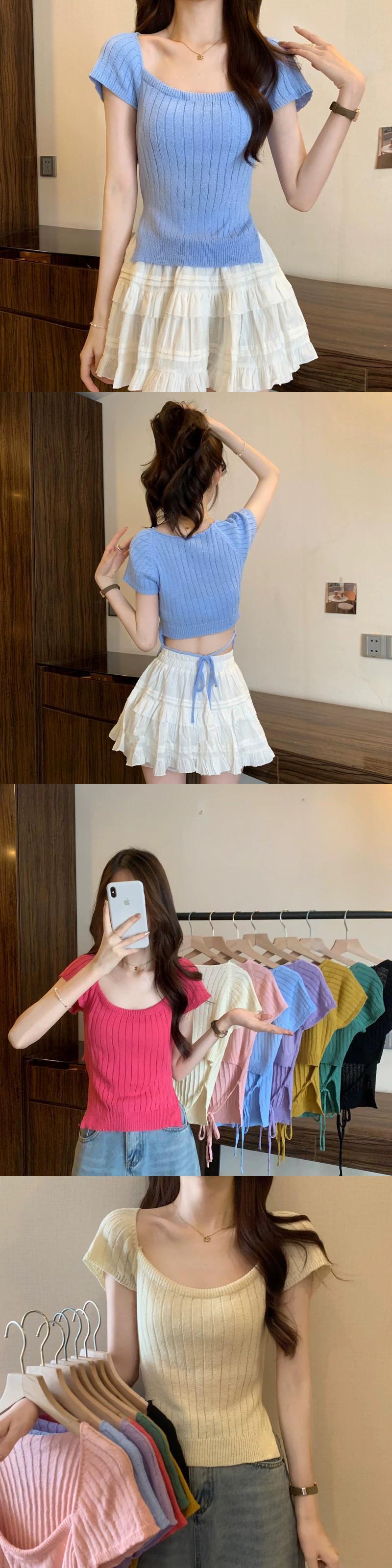 バックストラップストラップレス半袖Tシャツレディース夏デザインファッションスリム薄肉ニットスクエアカラーショートトップ サマー 夏物 スクウェア 7460083692432380 | framboise21