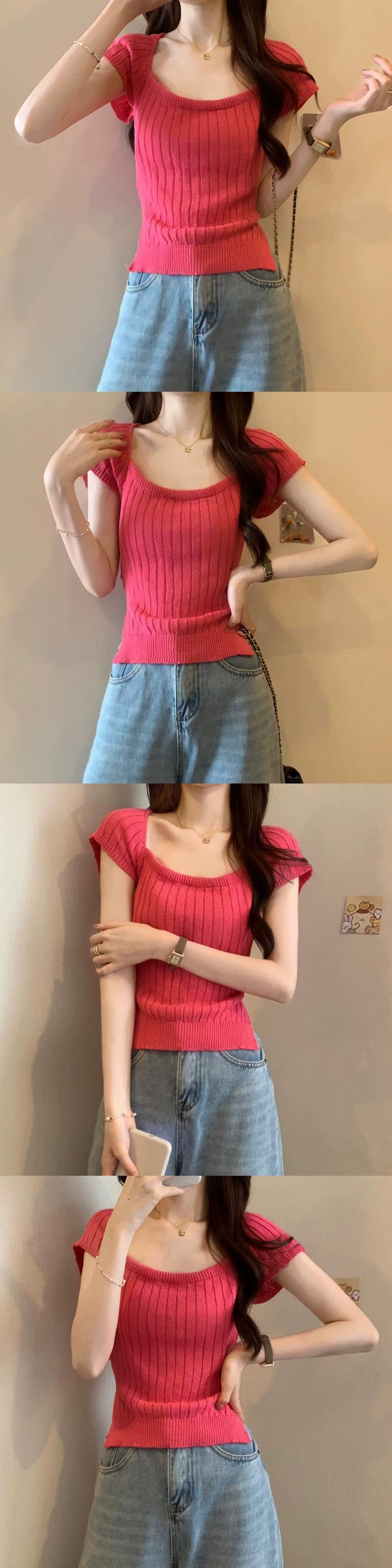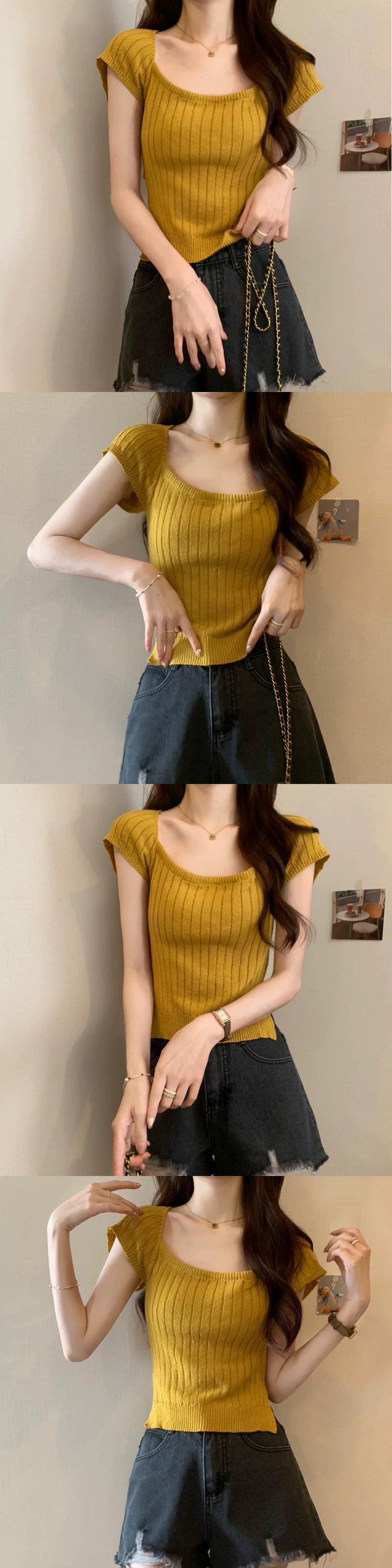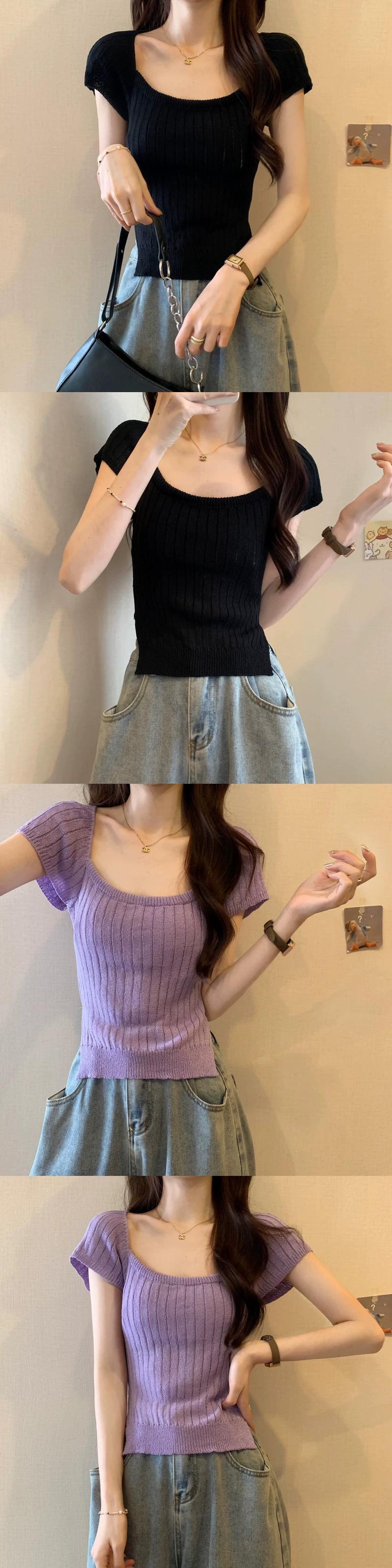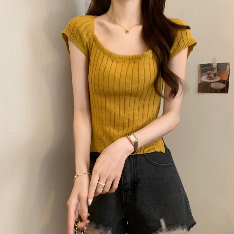 バックストラップストラップレス半袖Tシャツレディース夏デザインファッションスリム薄肉ニットスクエアカラーショートトップ サマー 夏物 スクウェア 7460083692432380 | framboise21