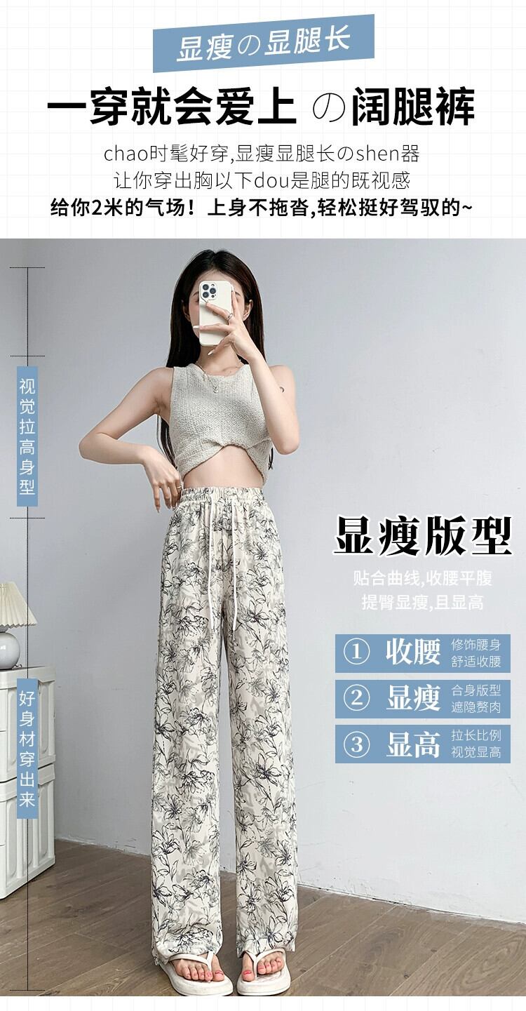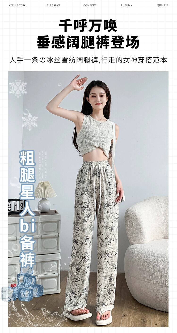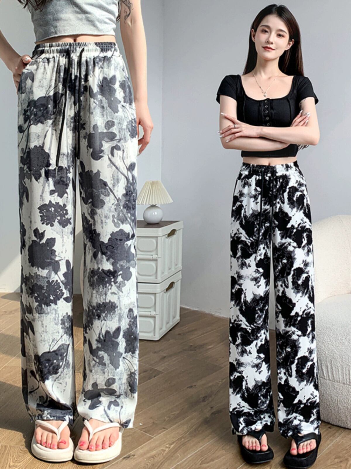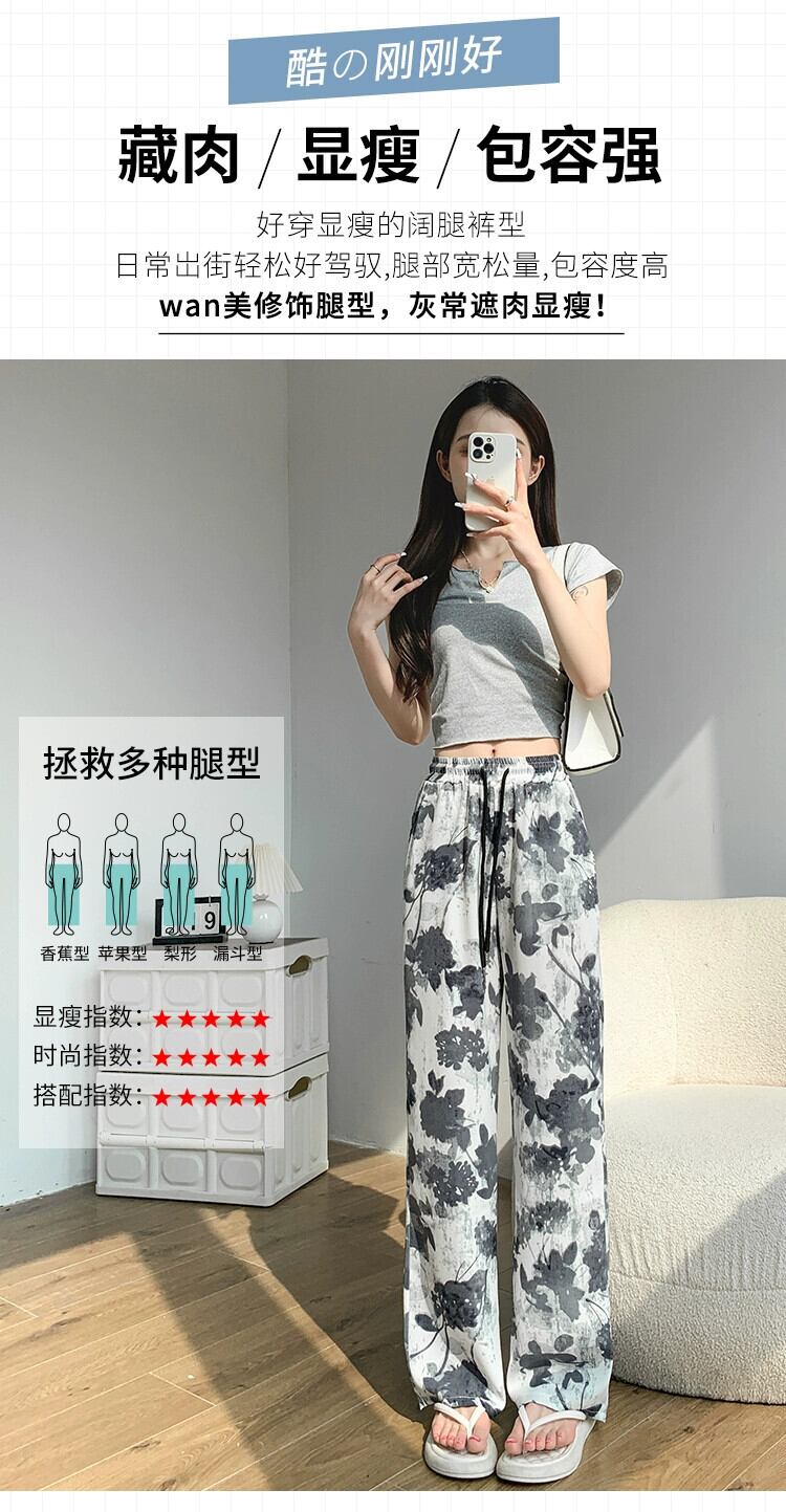 水墨画アイスシルクシフォンワイドレッグパンツレディース夏薄部カジュアルストレートタイダイパンツドレープハイウエストモップパンツ ハイウェスト サマー 夏物 7460059064898959 | framboise21