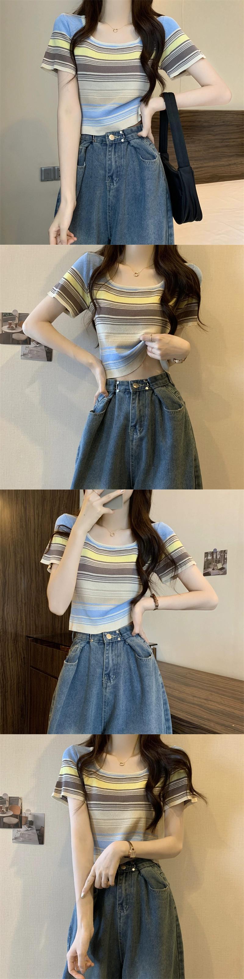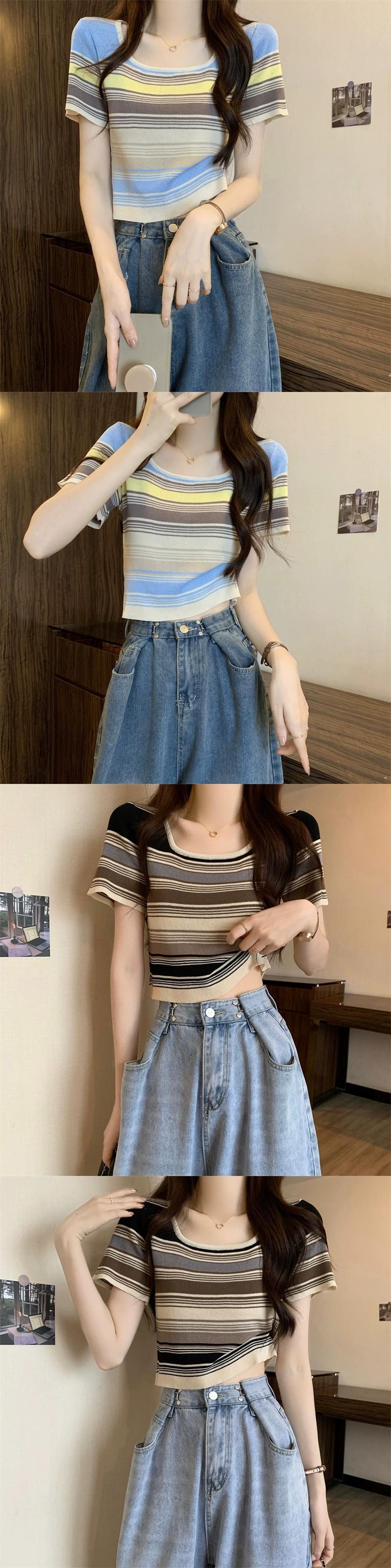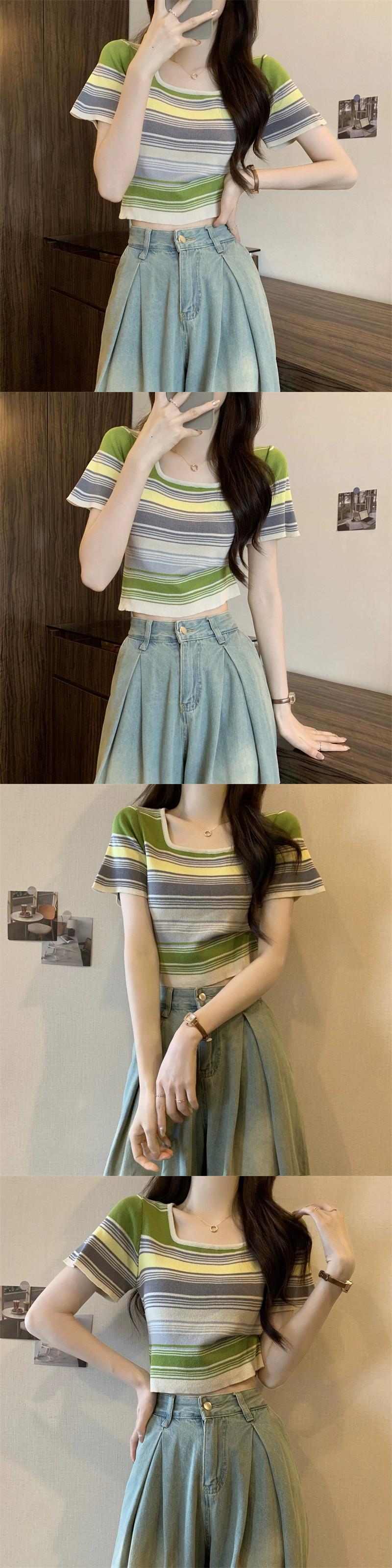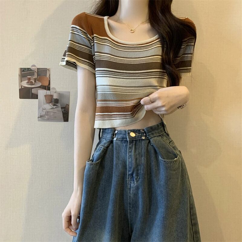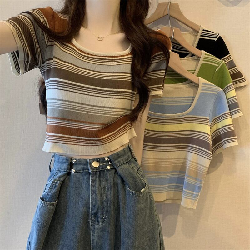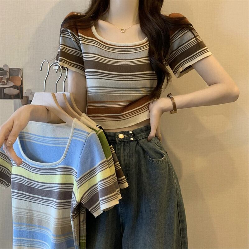 薄いストライプスクエアカラーニット半袖Tシャツレディース夏デザインセンス小背の高いウエスト露出へそショートアイスシルクトップ サマー 夏物 スクウェア 7460084859649174 | framboise21