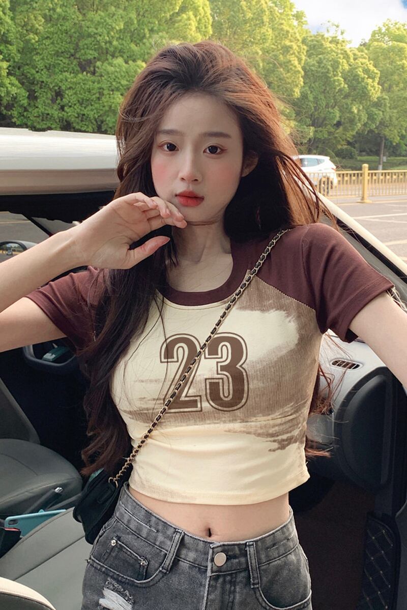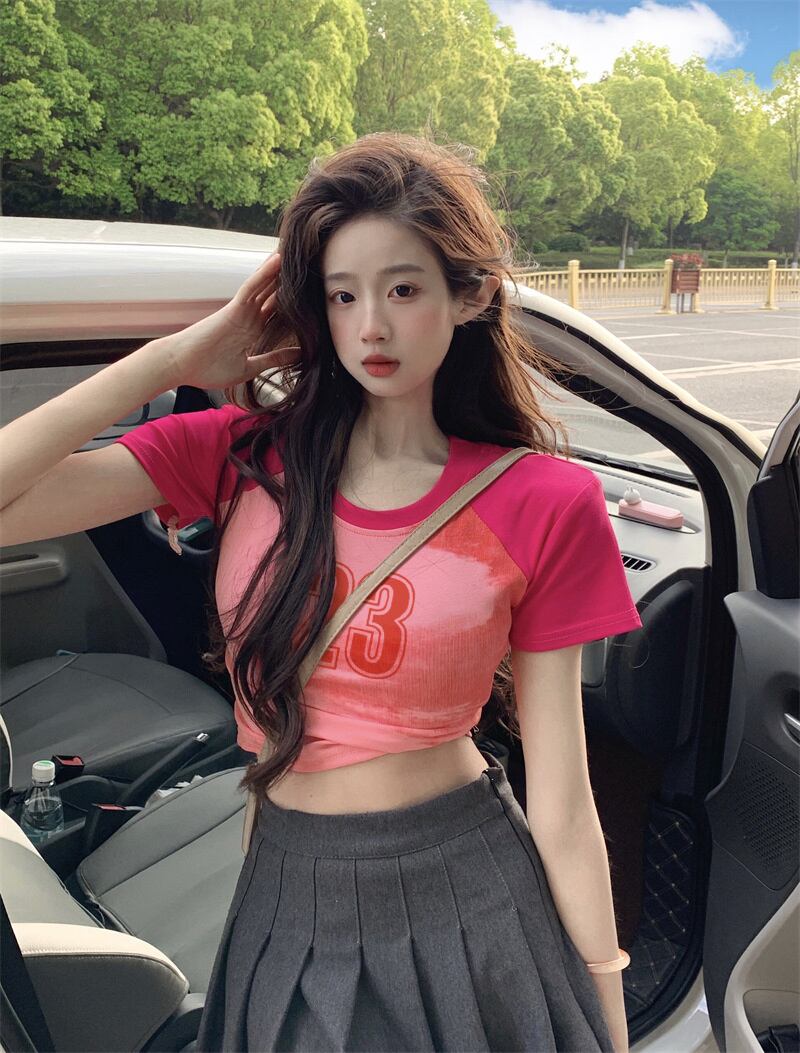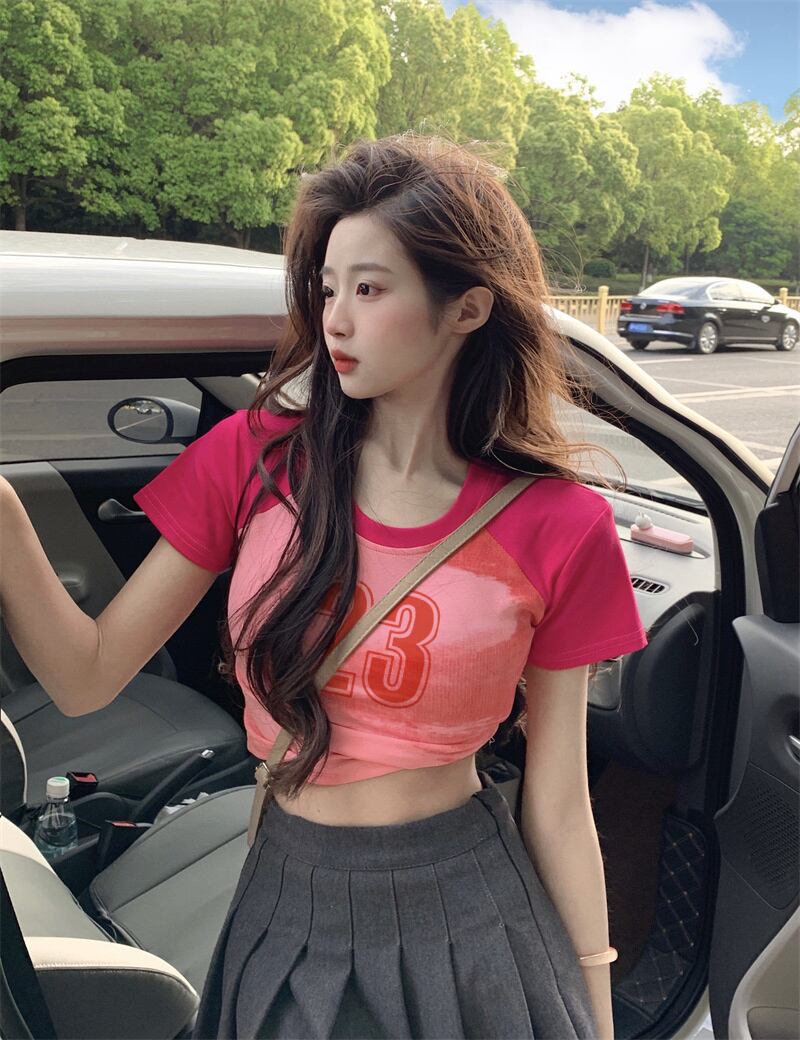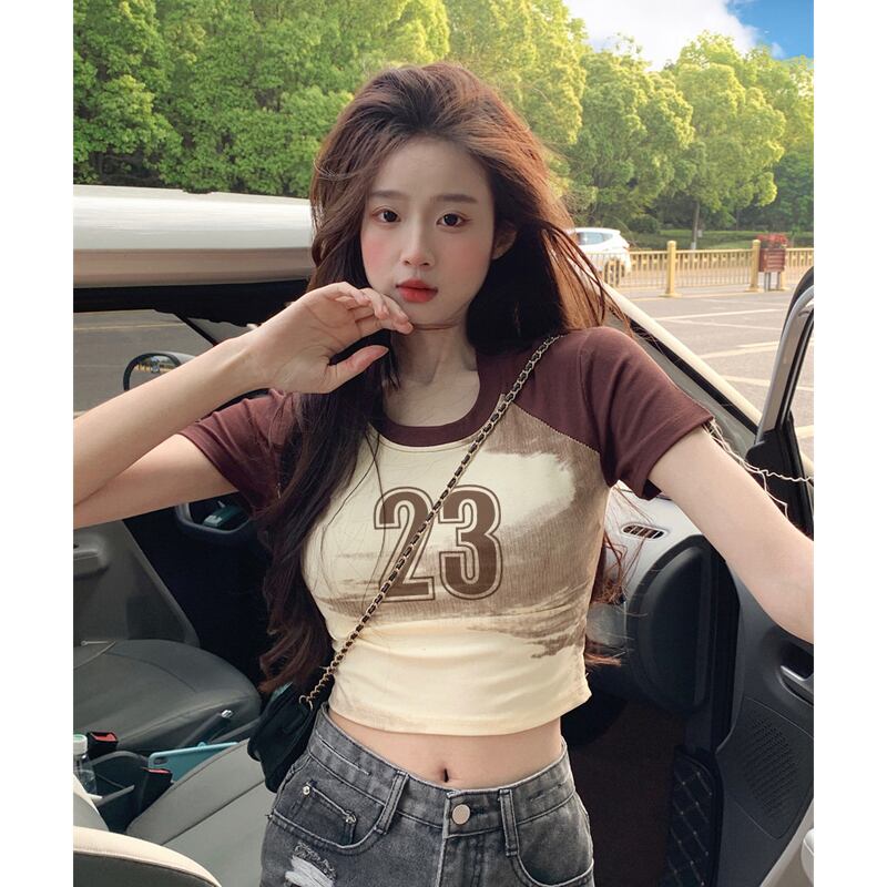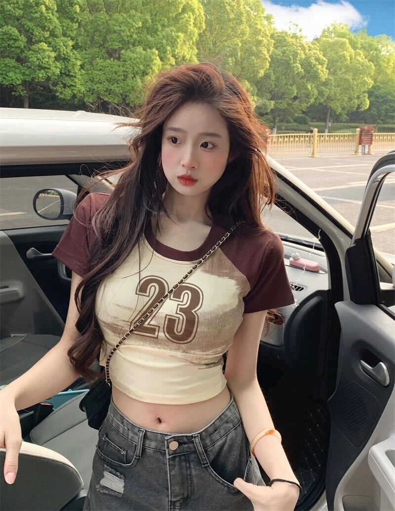 アメリカンレトロコットン肩パッド半袖Tシャツレディース夏BMデザインセンスハイウエストショートラグランスリーブトップ ハイウェスト サマー 夏物 7460032478718908 | framboise21