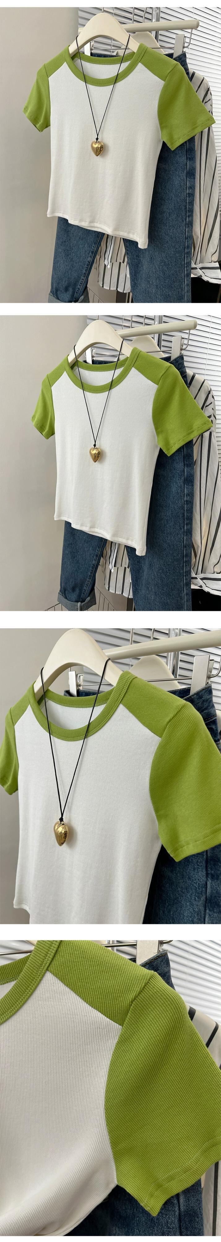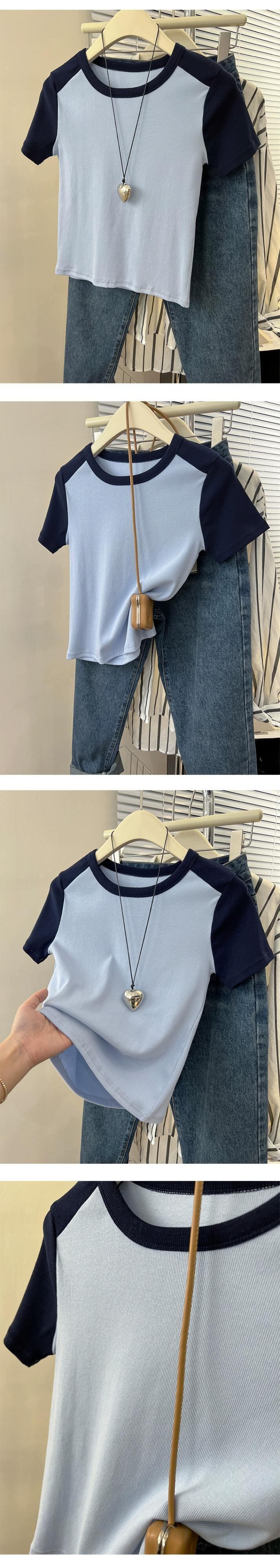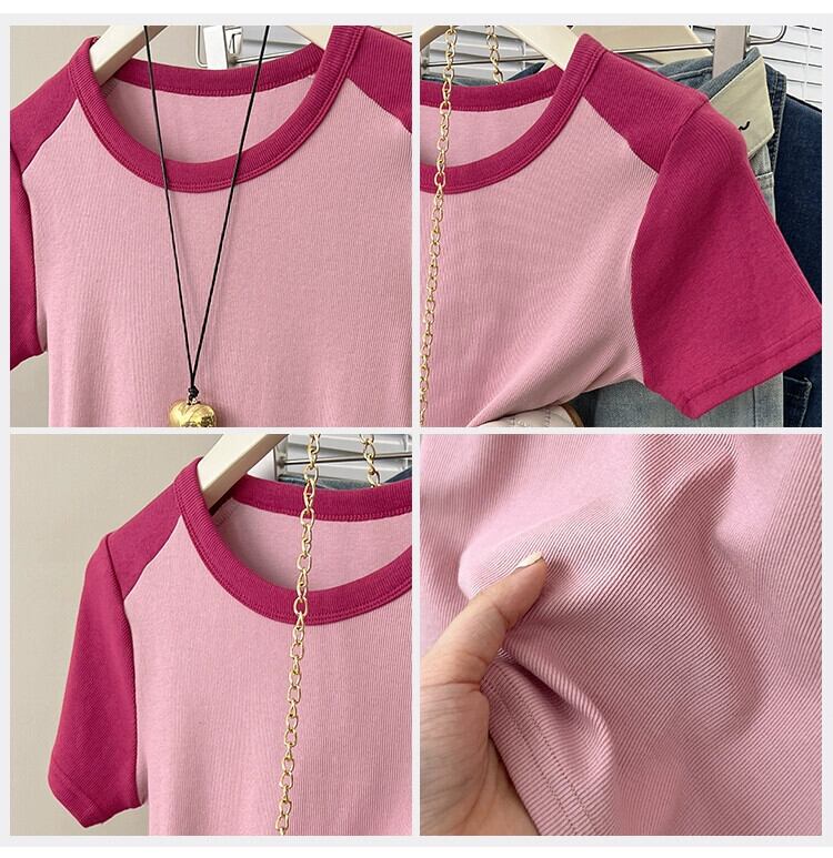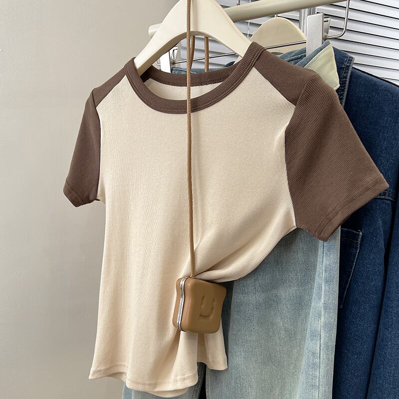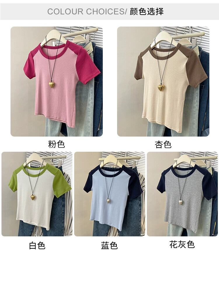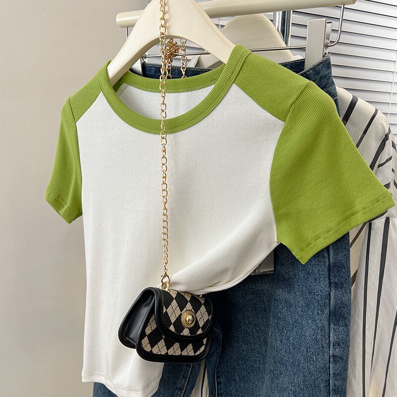 フロントショルダーラグランショルダー半袖Tシャツレディース2023年夏新作アメリカンレトロデザインセンススリムフィットカラーコントラストショートトップ サマー 夏物 7460020889622889 | framboise21