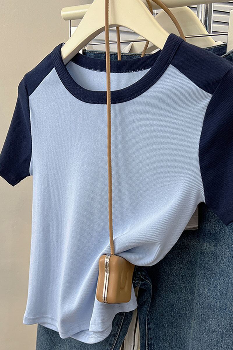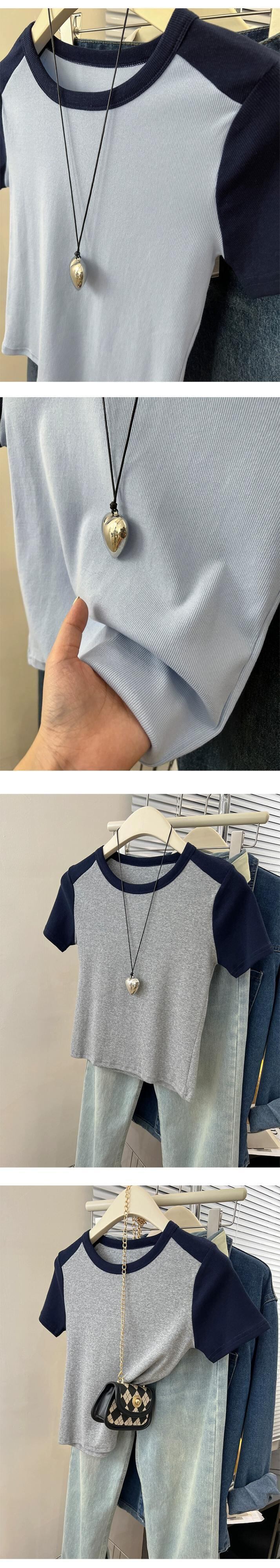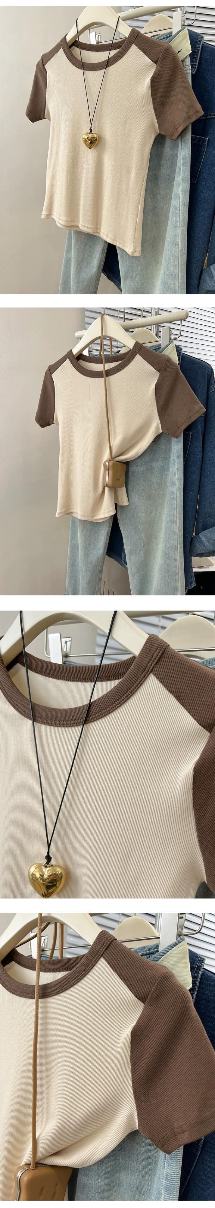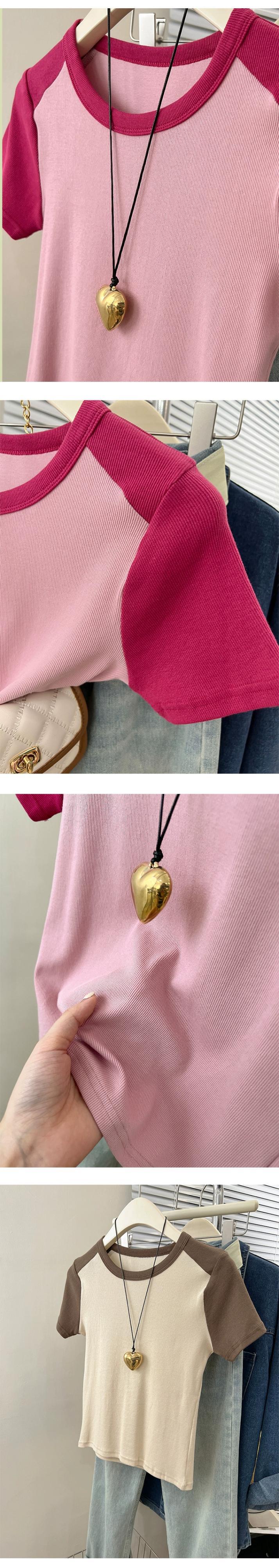 フロントショルダーラグランショルダー半袖Tシャツレディース2023年夏新作アメリカンレトロデザインセンススリムフィットカラーコントラストショートトップ サマー 夏物 7460020889622889 | framboise21
