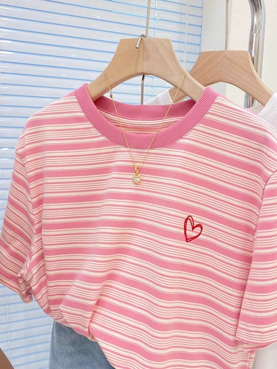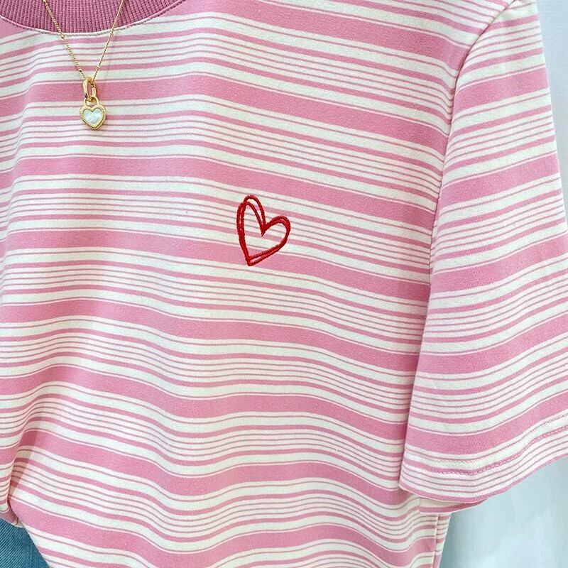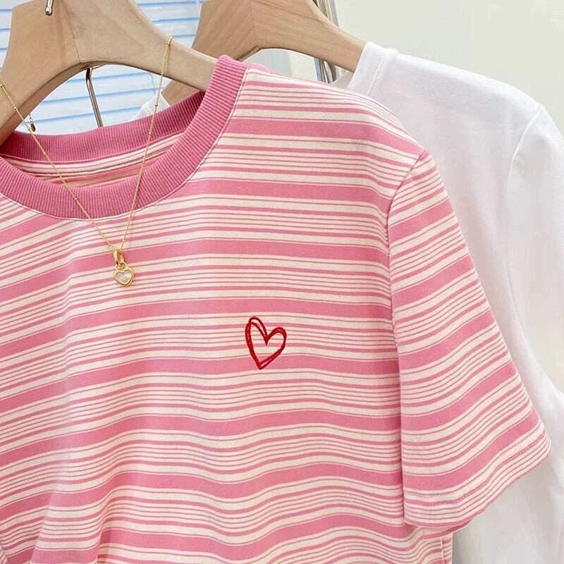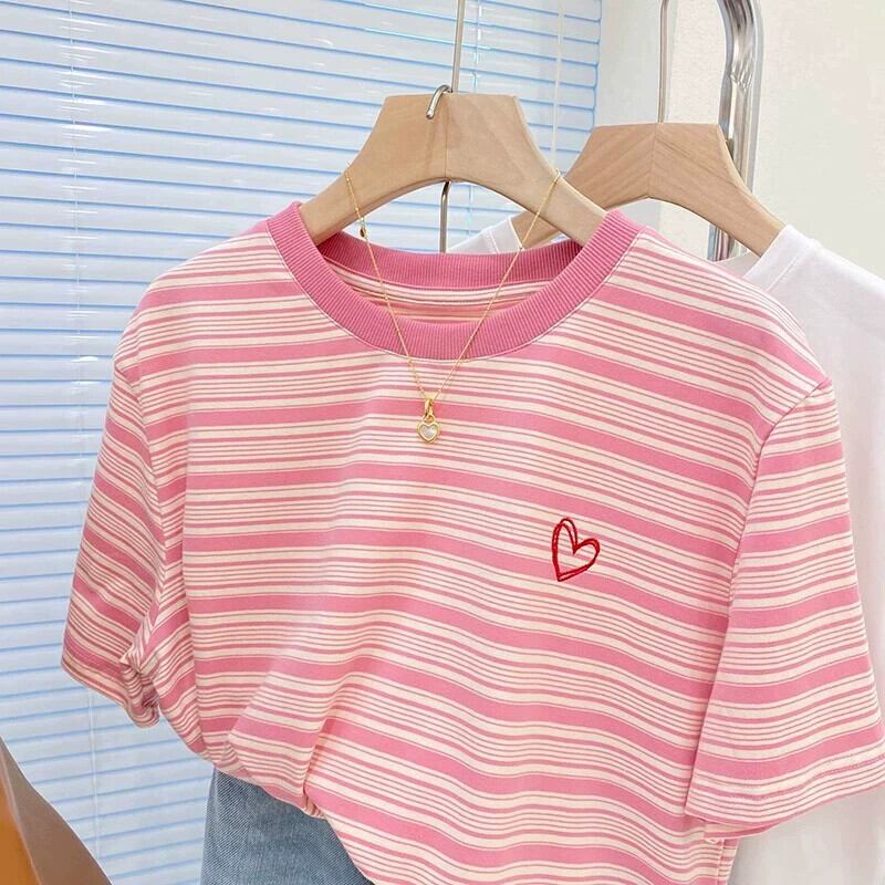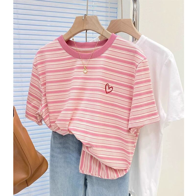 ピンクのストライプのラウンドネック半袖 Tシャツの女性の夏のルーズなデザインセンス薄いオールマッチフロントショルダー純綿トップイン潮 コットン サマー 夏物 Oネック ピュア 7460036991130413 | framboise21