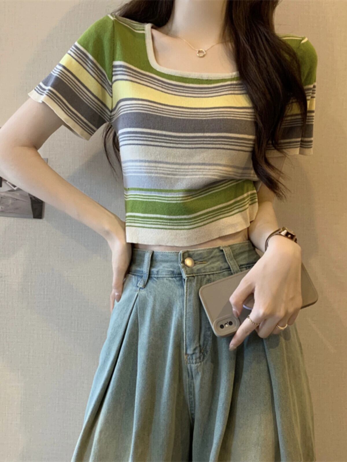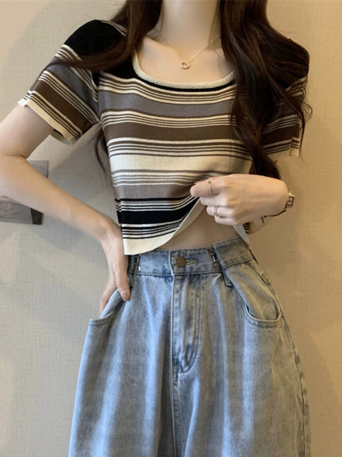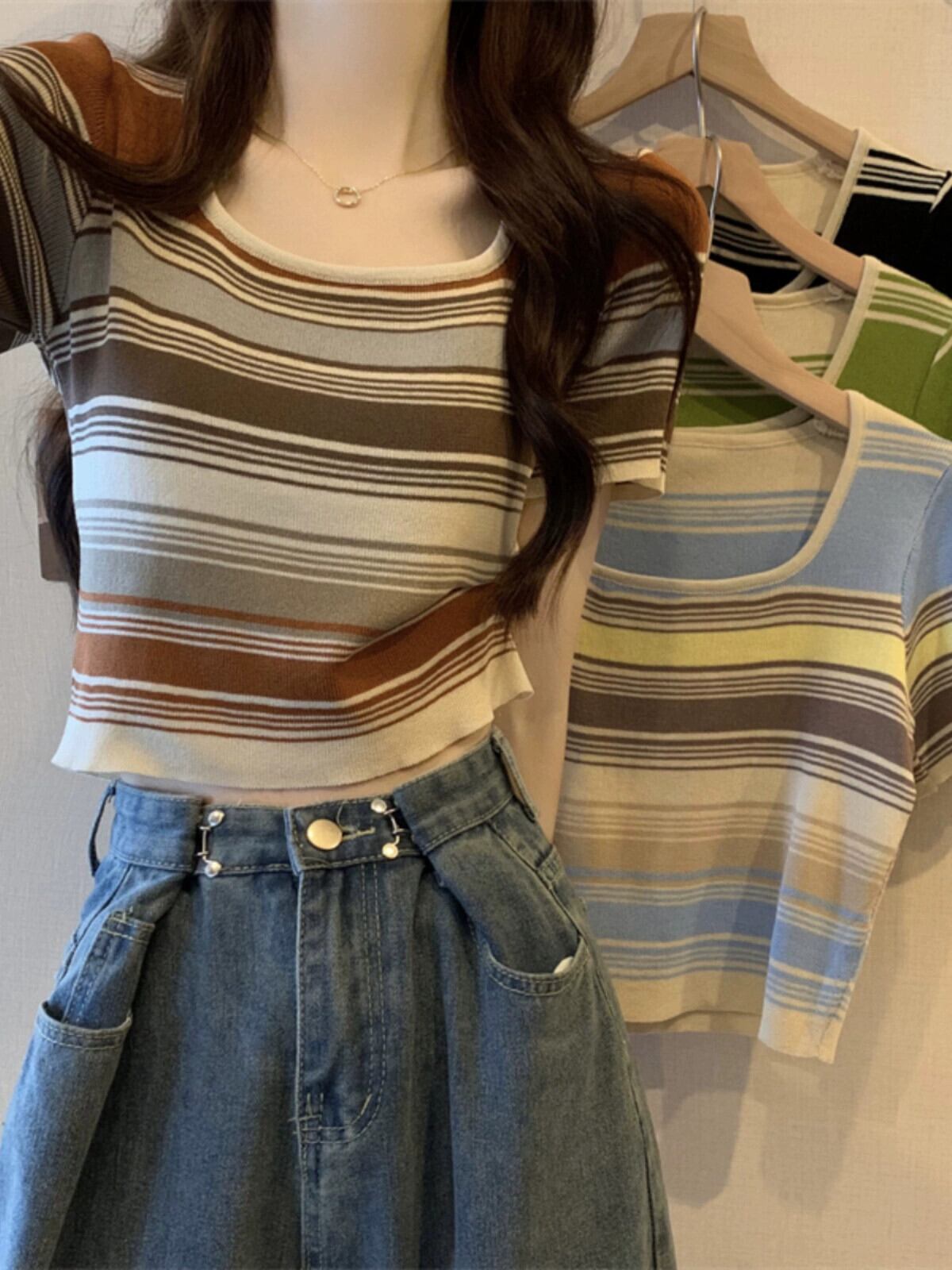 コントラストカラーストライプニット半袖Tシャツレディース夏フレンチレトロデザインスリムハイウエストショートショルダーUネックトップ ハイウェスト サマー 夏物 7460061674336831 | framboise21