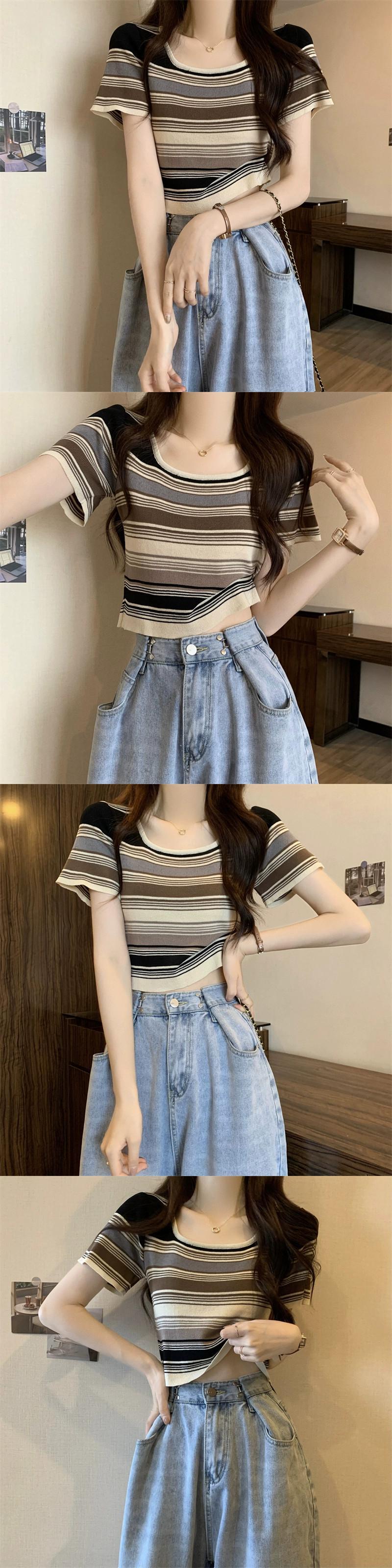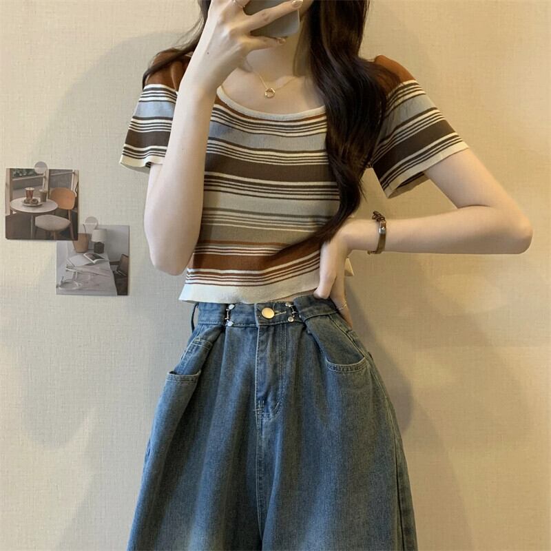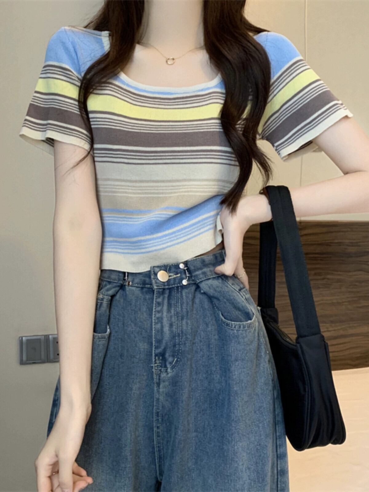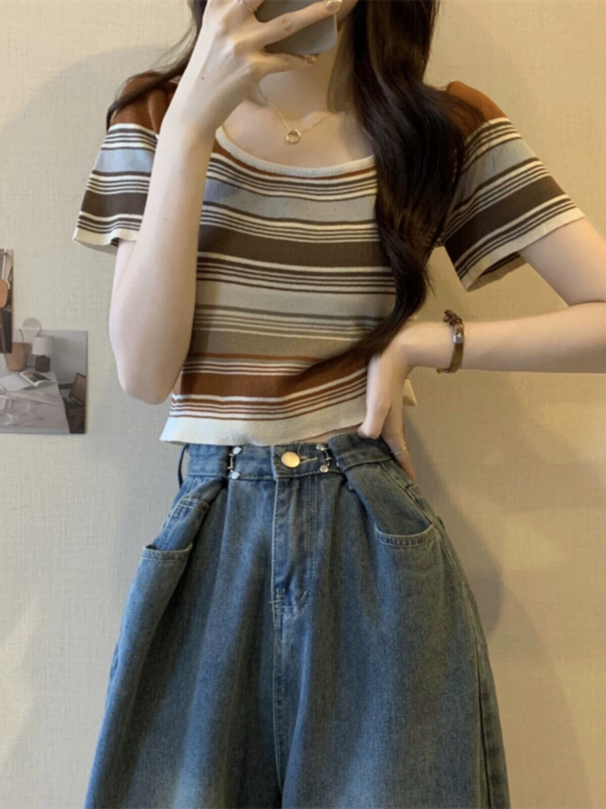 コントラストカラーストライプニット半袖Tシャツレディース夏フレンチレトロデザインスリムハイウエストショートショルダーUネックトップ ハイウェスト サマー 夏物 7460061674336831 | framboise21