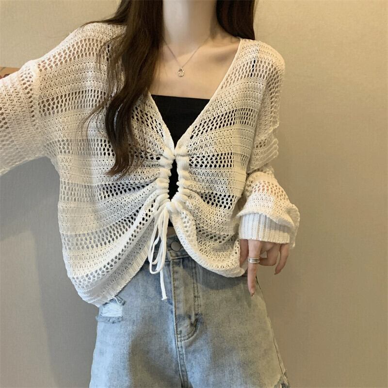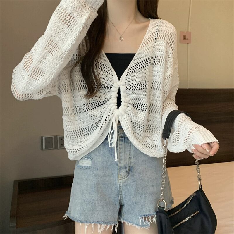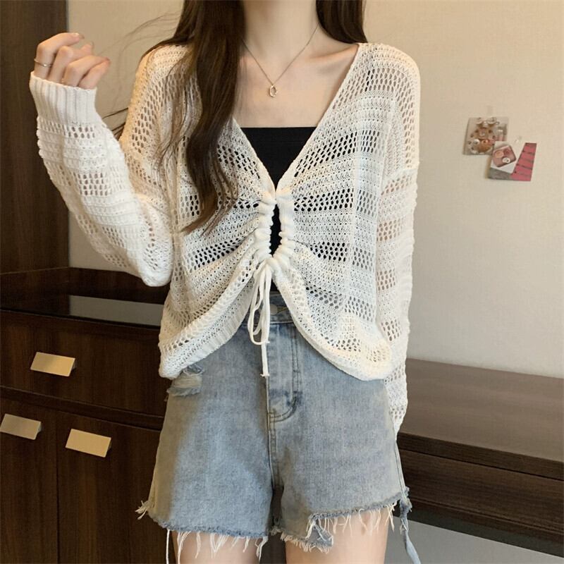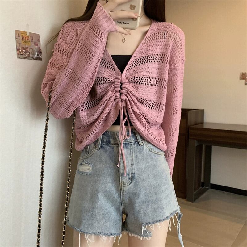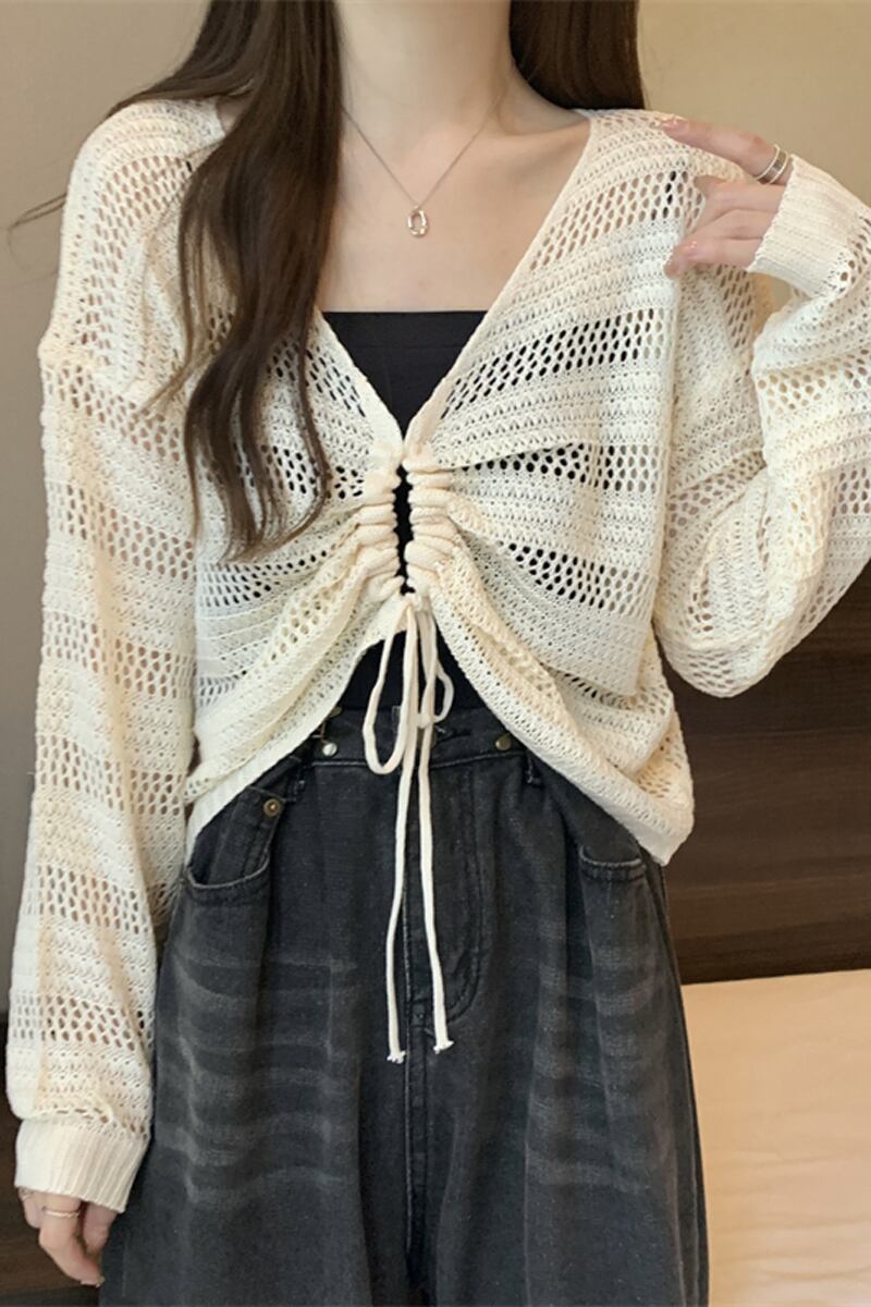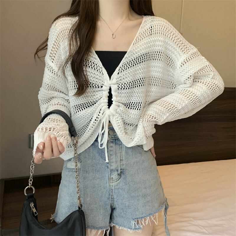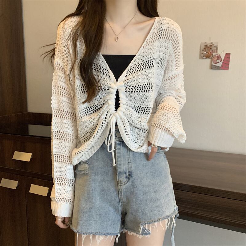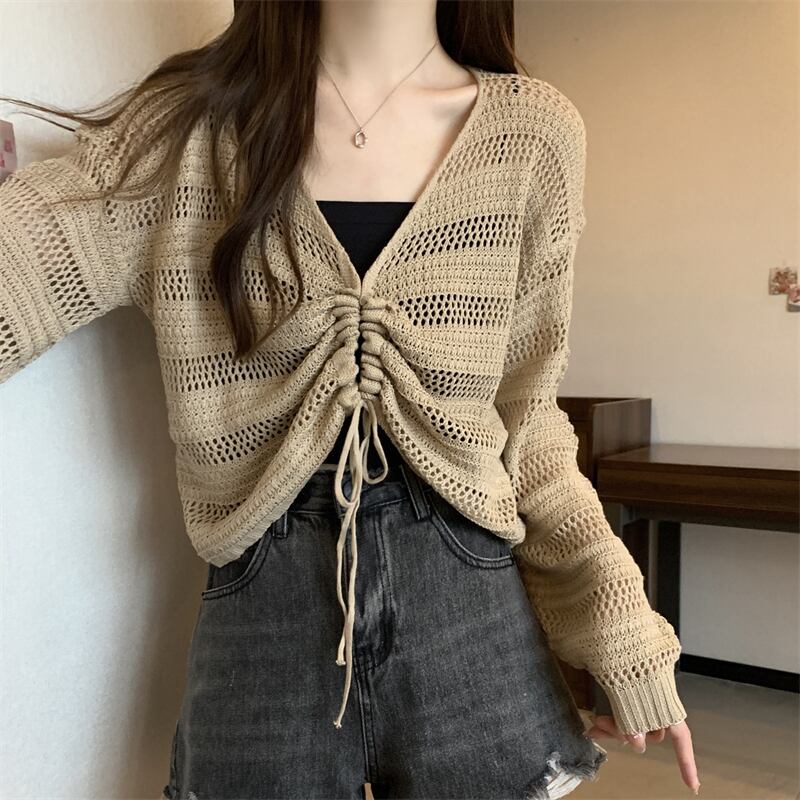フレンチ V ネックの中空ニット日焼け止めブラウスは、シックで不規則な短い巾着トップが付いた女性の夏のデザインです。 ショート サマー 夏物 Vネック 7460066783883623 | framboise21