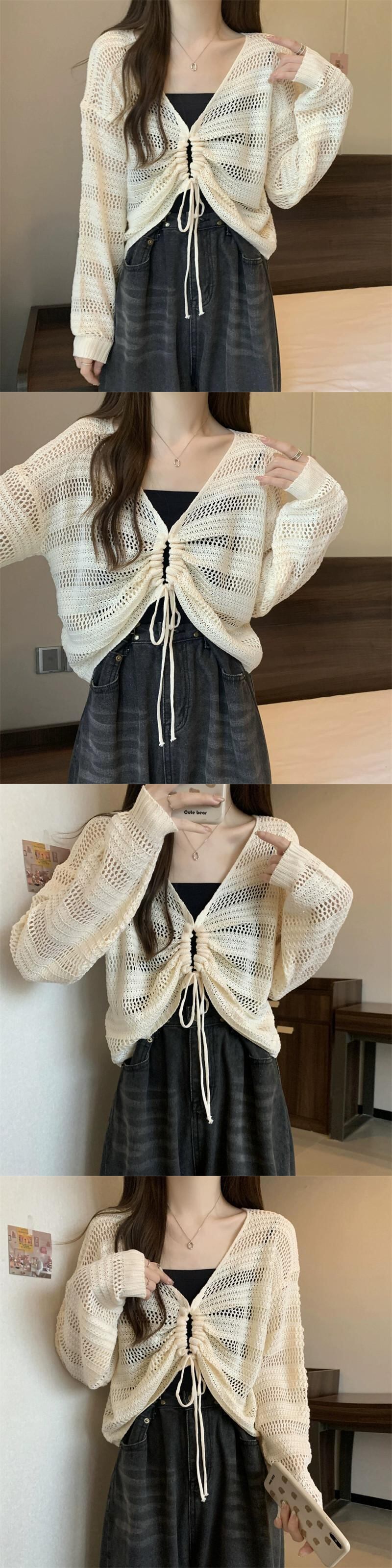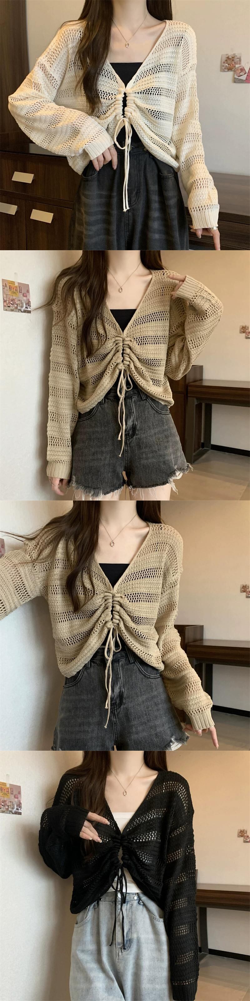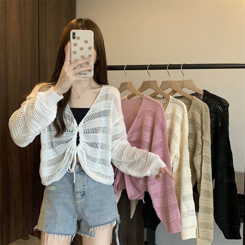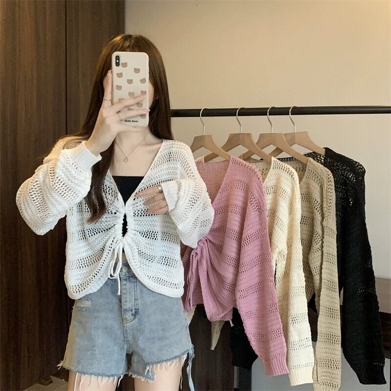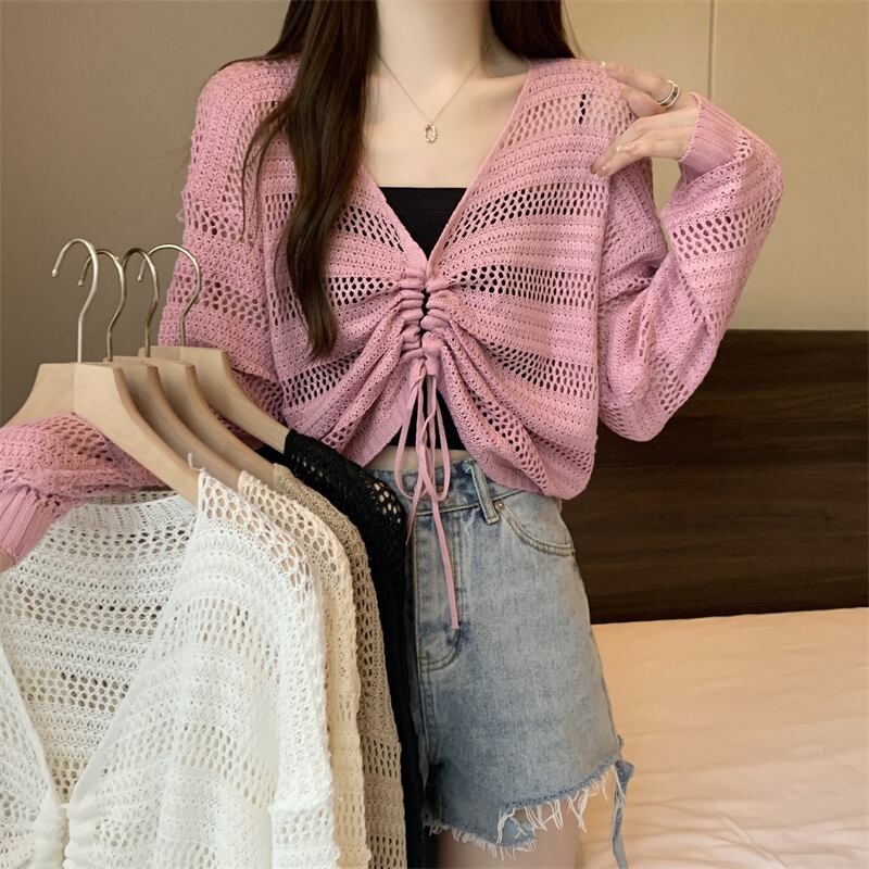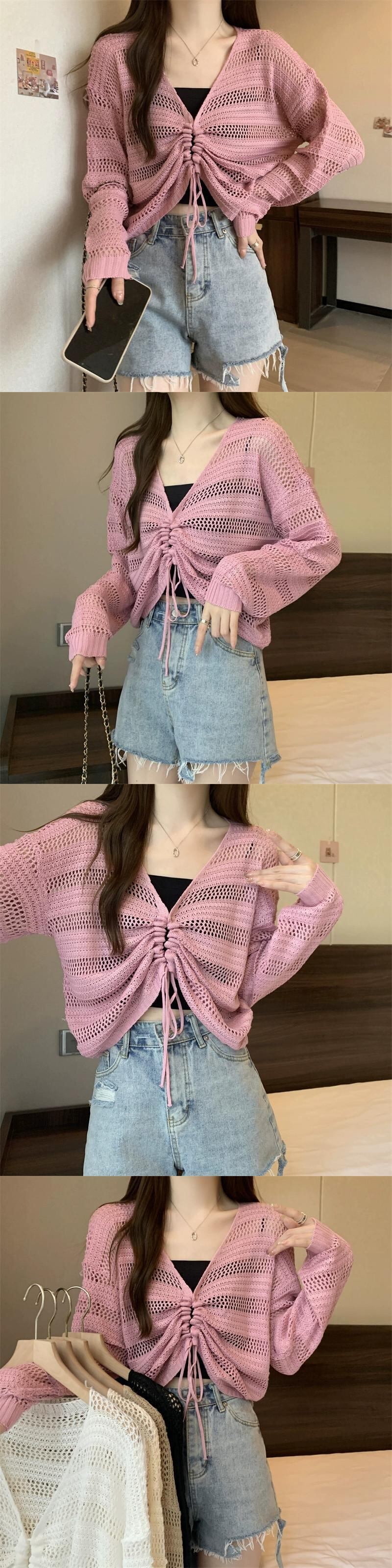 フレンチ V ネックの中空ニット日焼け止めブラウスは、シックで不規則な短い巾着トップが付いた女性の夏のデザインです。 ショート サマー 夏物 Vネック 7460066783883623 | framboise21