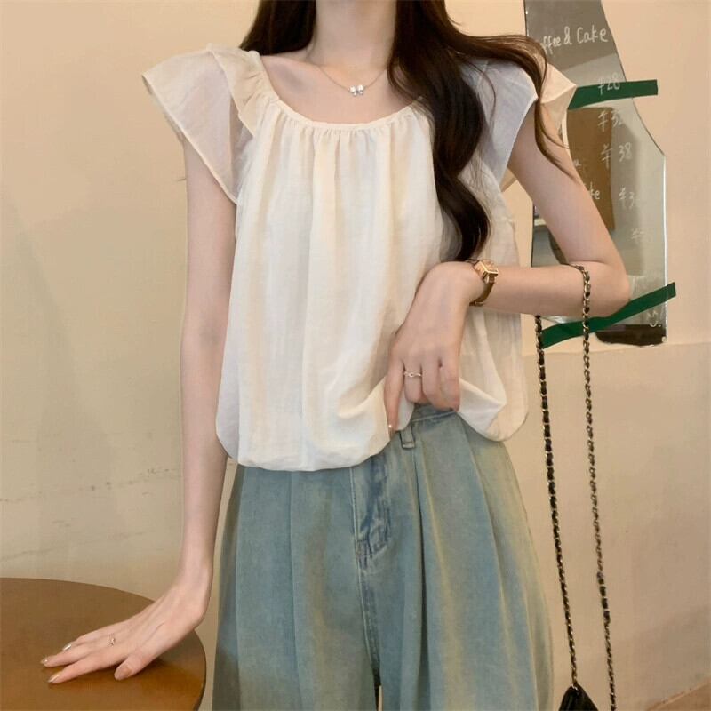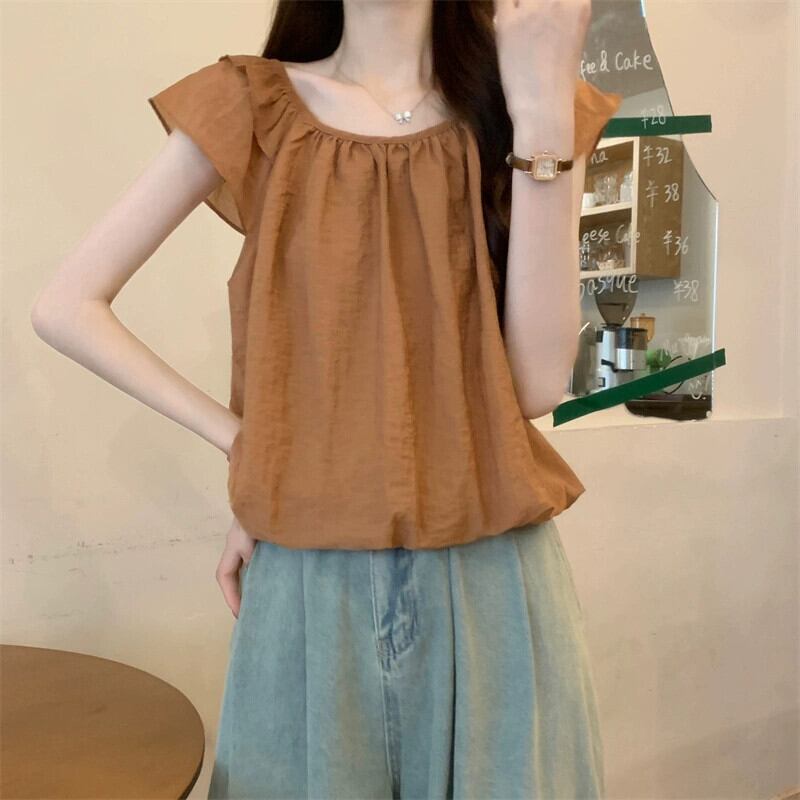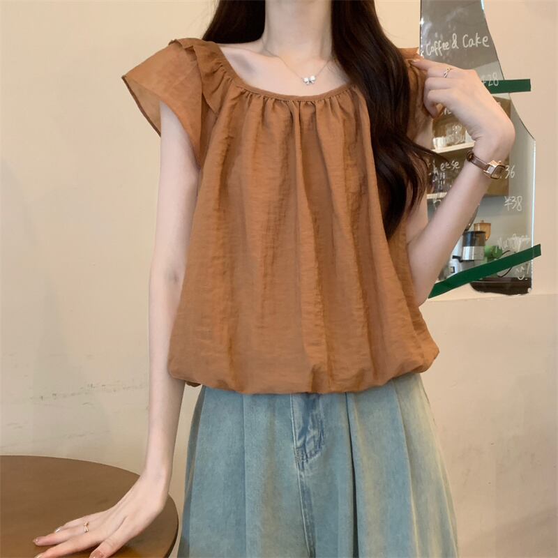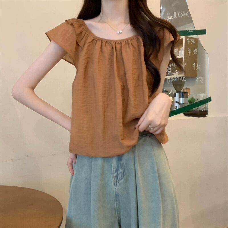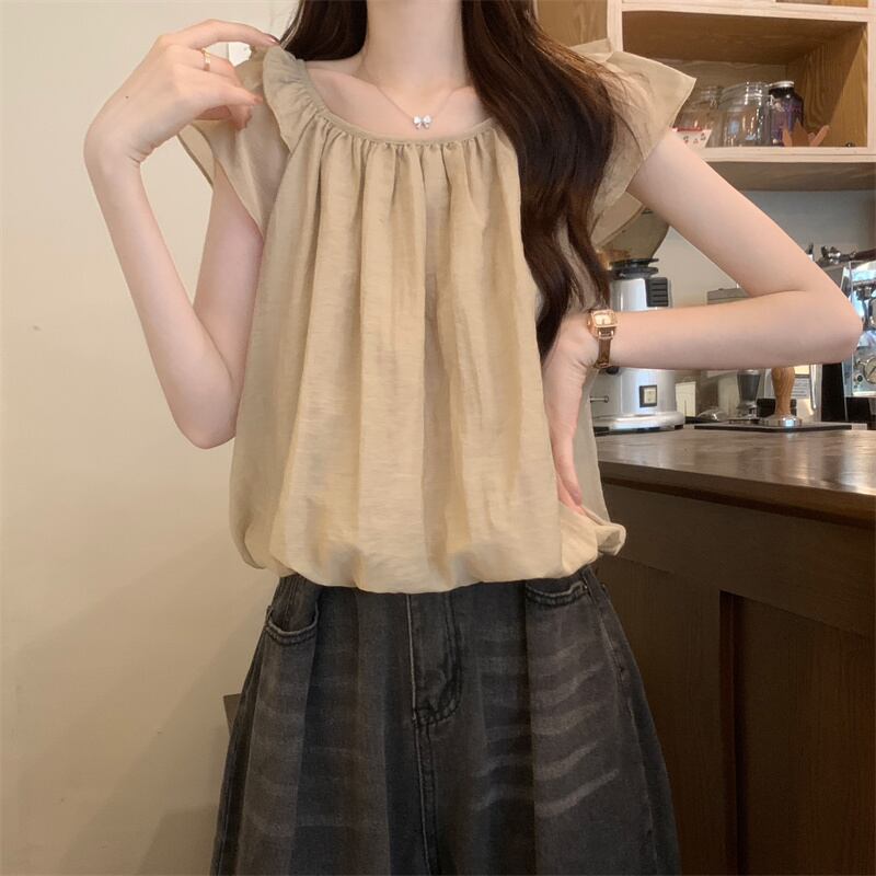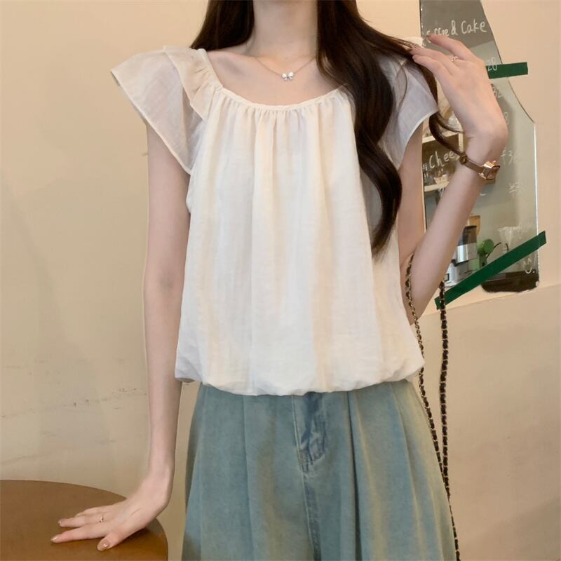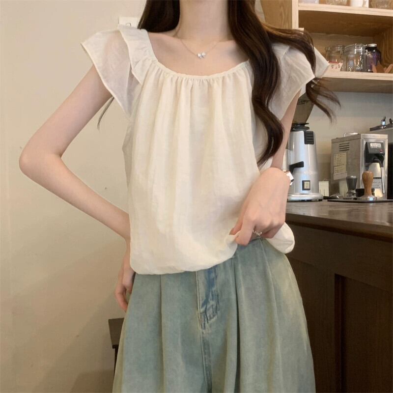 プリーツワンショルダー半袖シャツレディース夏ルーズデザインドールシャツスクエアカラートップ小さなフライングスリーブショートシャツ サマー 夏物 スクウェア 746001715937058 | framboise21
