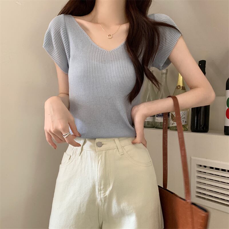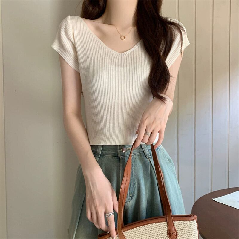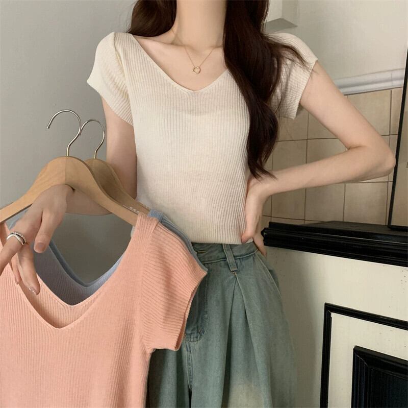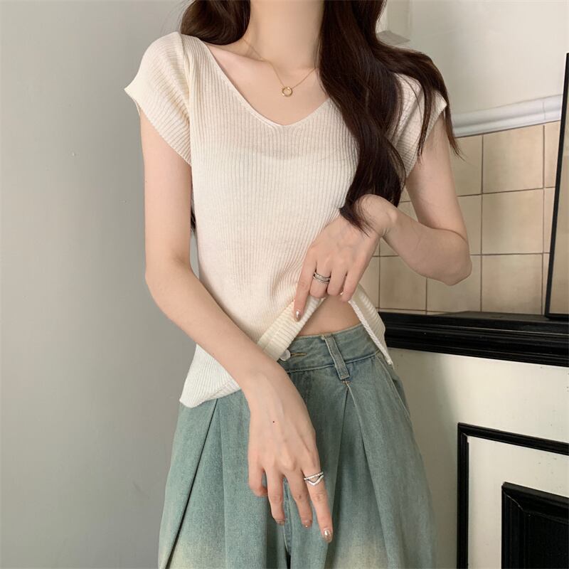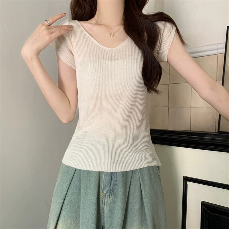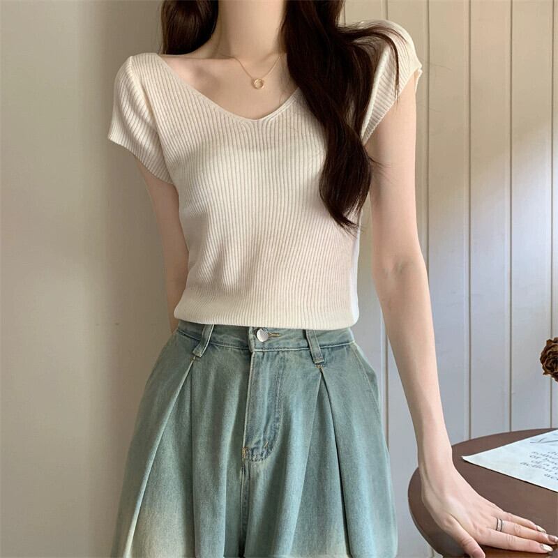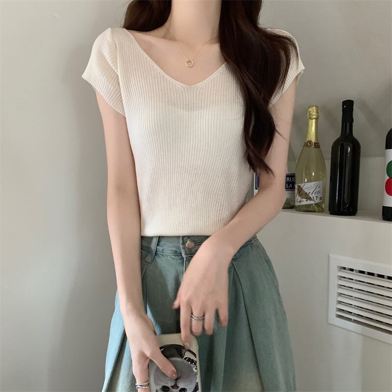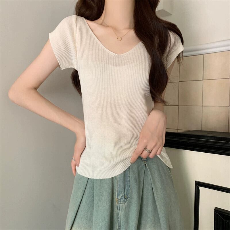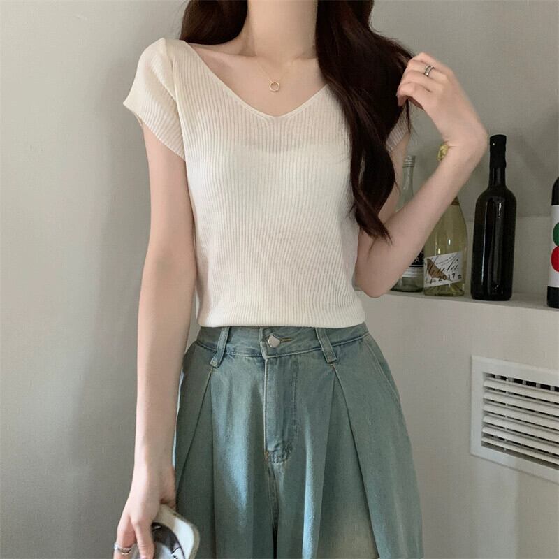 ホワイトアイスシルクニット V ネック半袖 Tシャツ女性の夏の 2023 新しいファッションスリム薄い鎖骨トップトレンド サマー 夏物 Vネック 7460055986339141 | framboise21