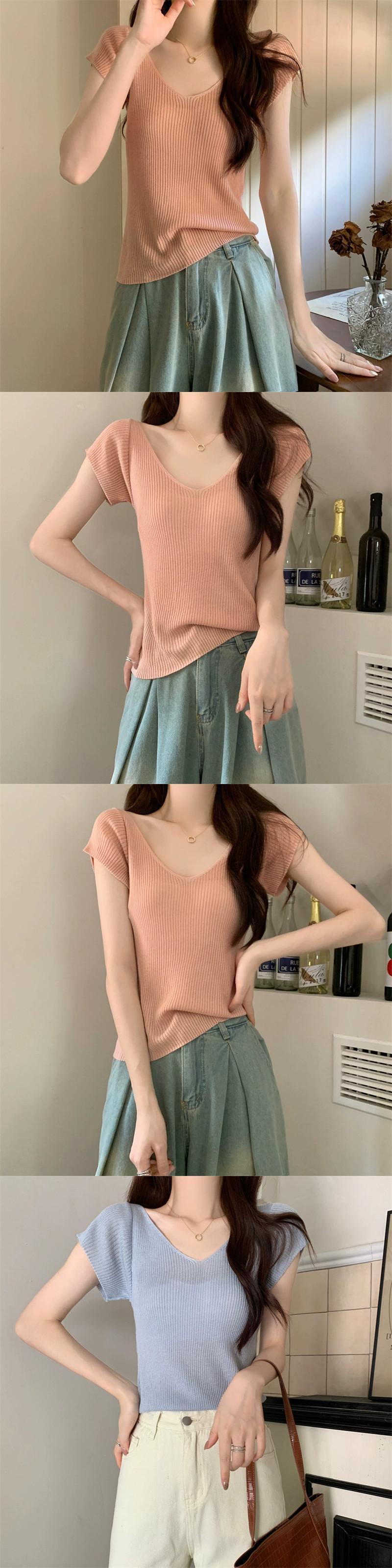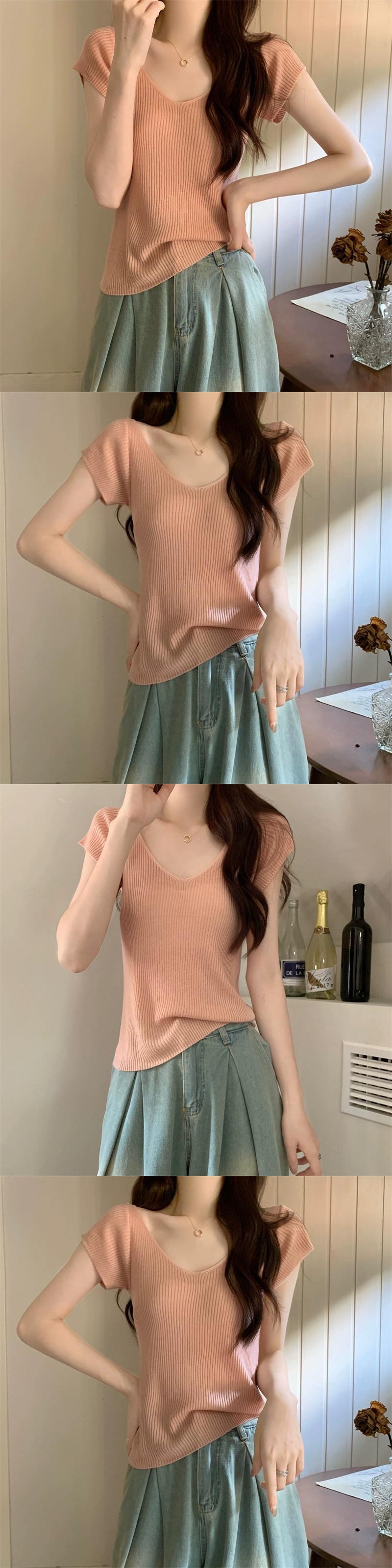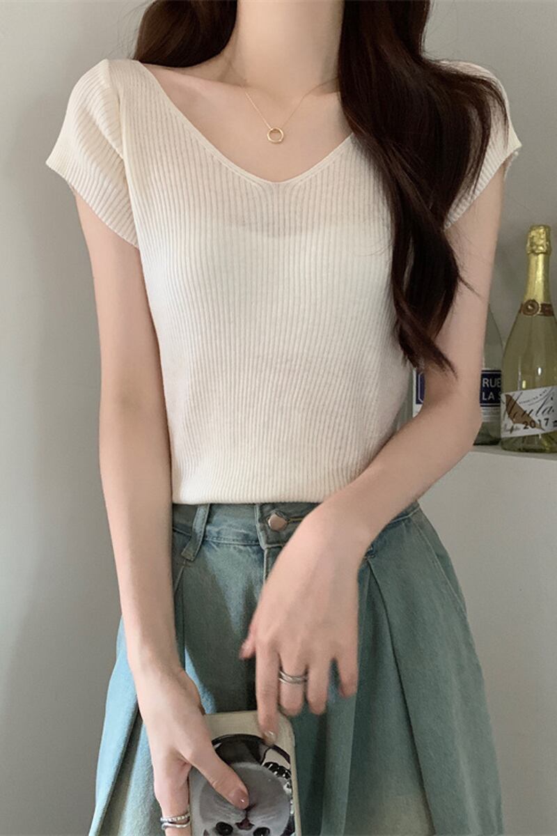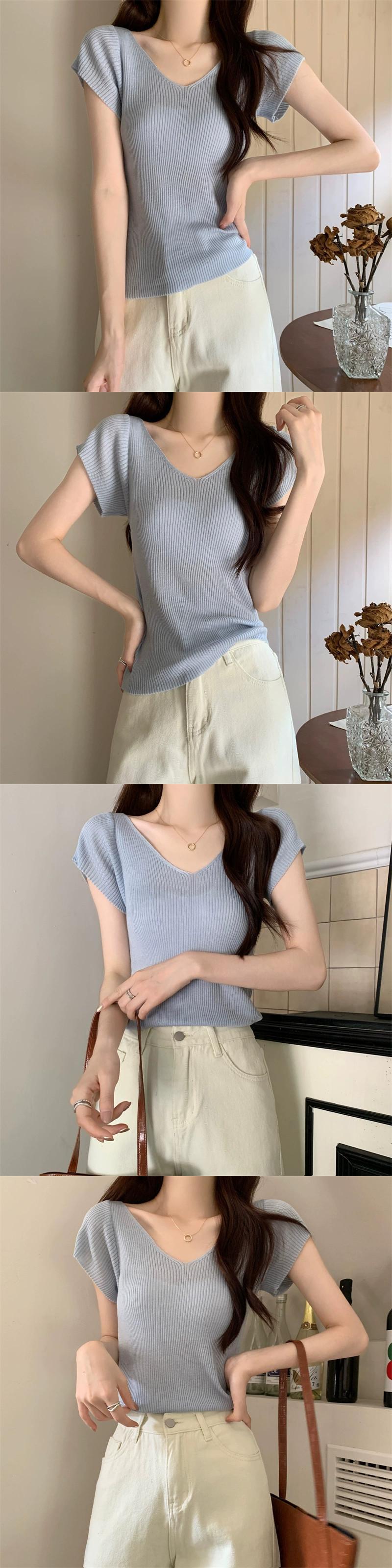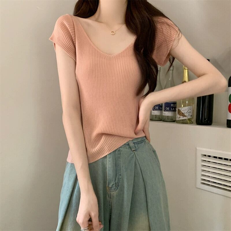 ホワイトアイスシルクニット V ネック半袖 Tシャツ女性の夏の 2023 新しいファッションスリム薄い鎖骨トップトレンド サマー 夏物 Vネック 7460055986339141 | framboise21