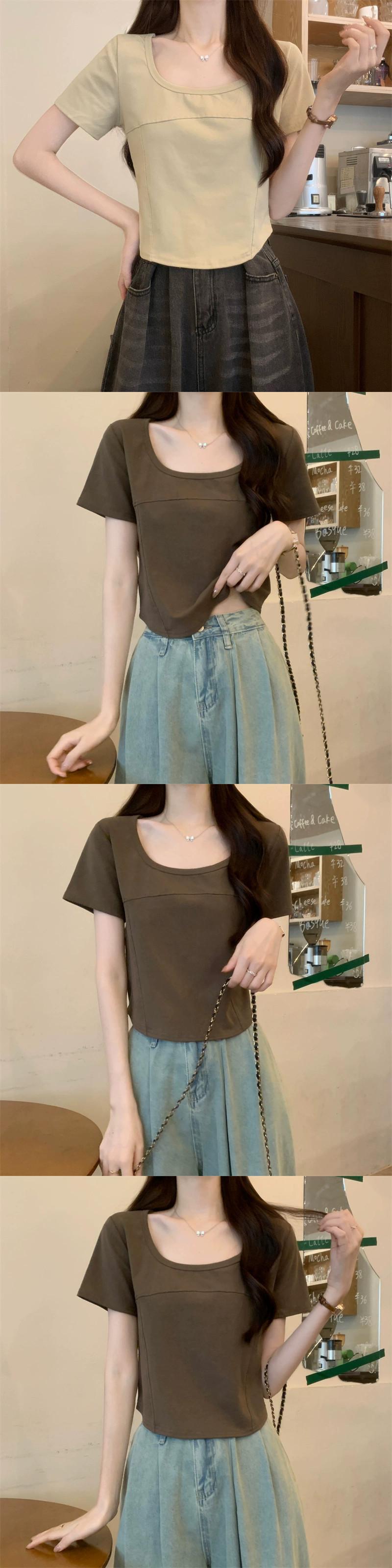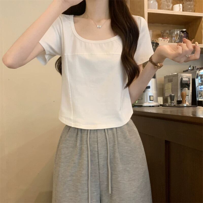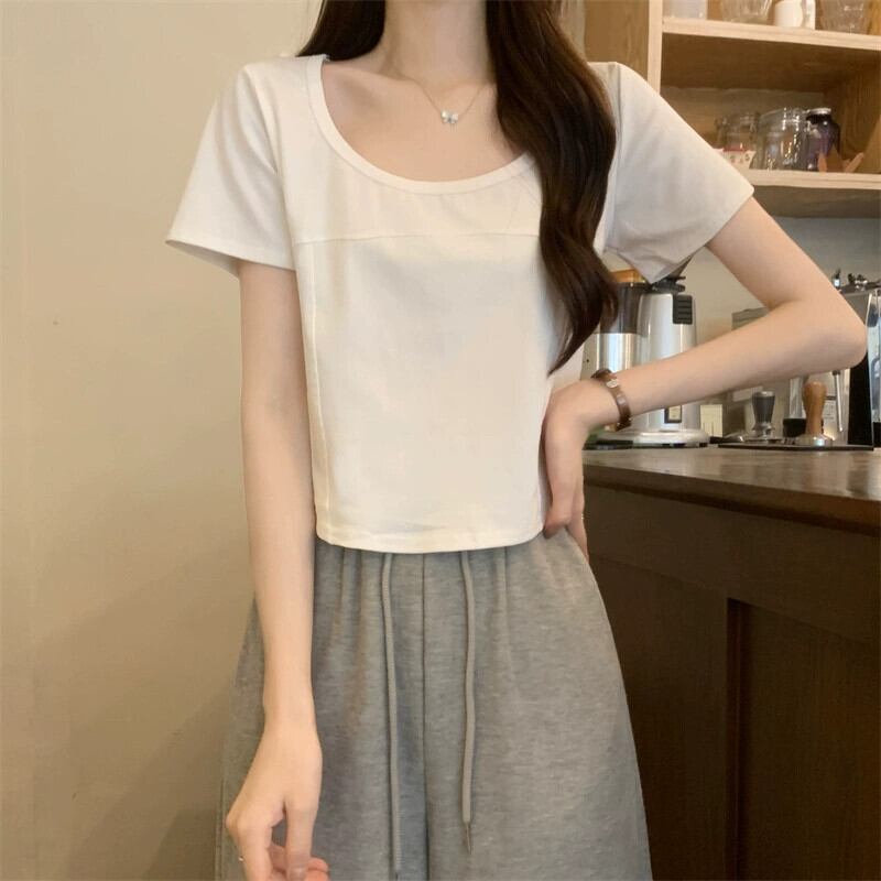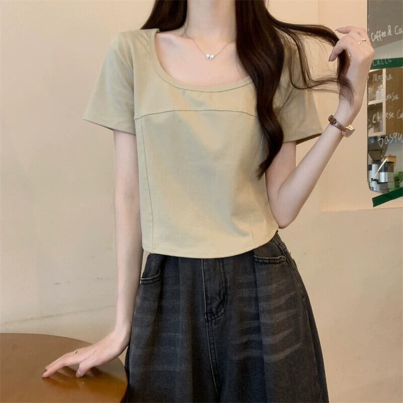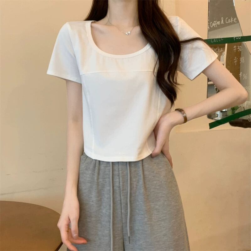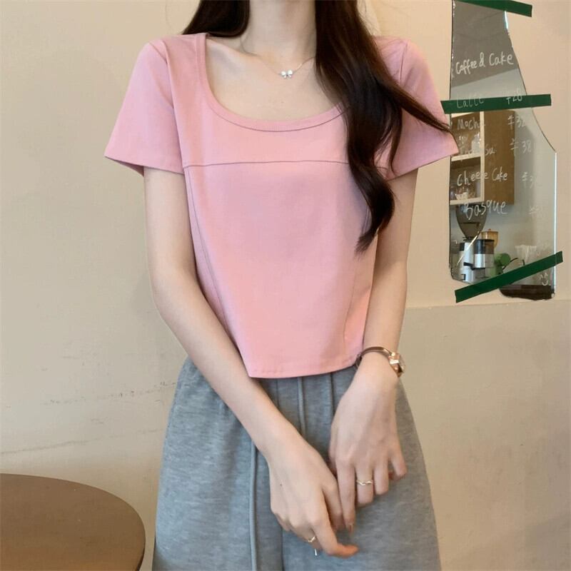 ピンクのフロントショルダー純綿半袖Tシャツ女性の夏のデザイン自己修養の感覚痩身湾曲した短い鎖骨ラウンドネックトップ ショート コットン サマー 夏物 Oネック ピュア 7460011265386527 | framboise21