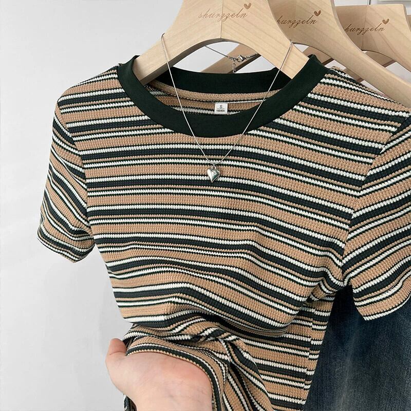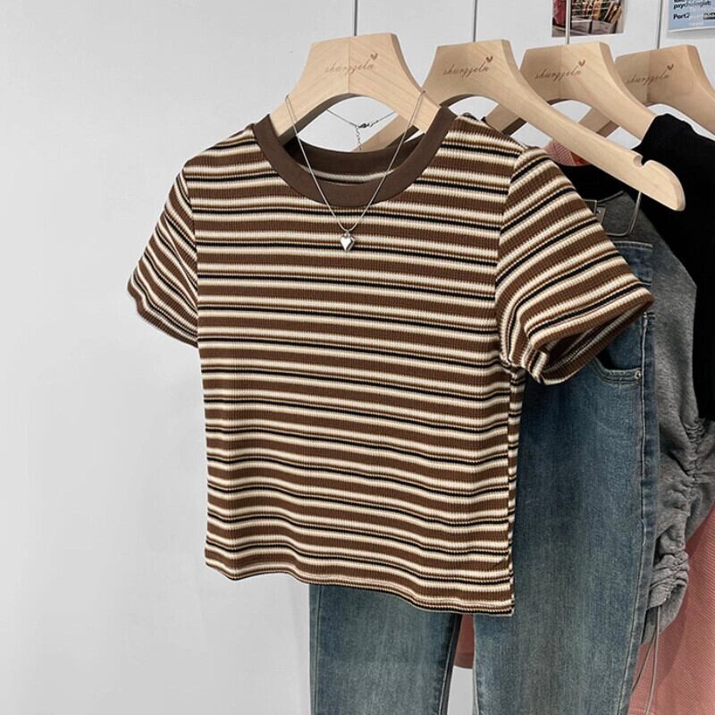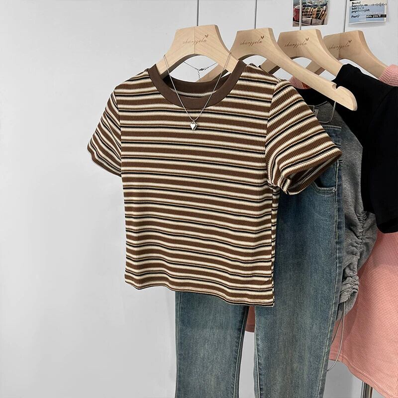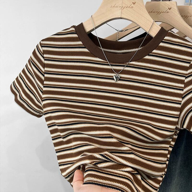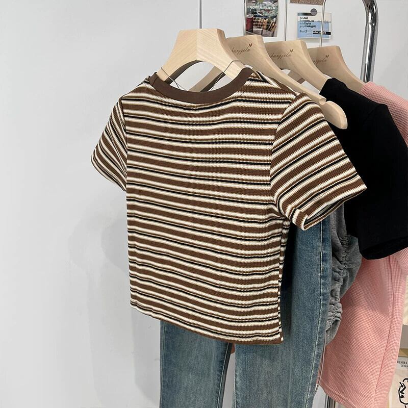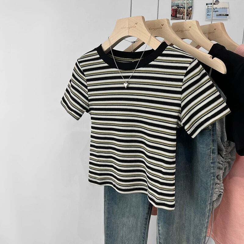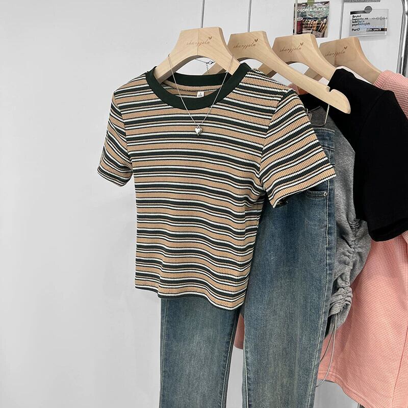 アメリカンスタイルのフロントショルダーストライプ半袖Tシャツレディース夏レトロデザイン自己修養の感覚と薄い短いセクションへそラウンドネックトップ ショート サマー 夏物 Oネック 7460060923744942 | framboise21
