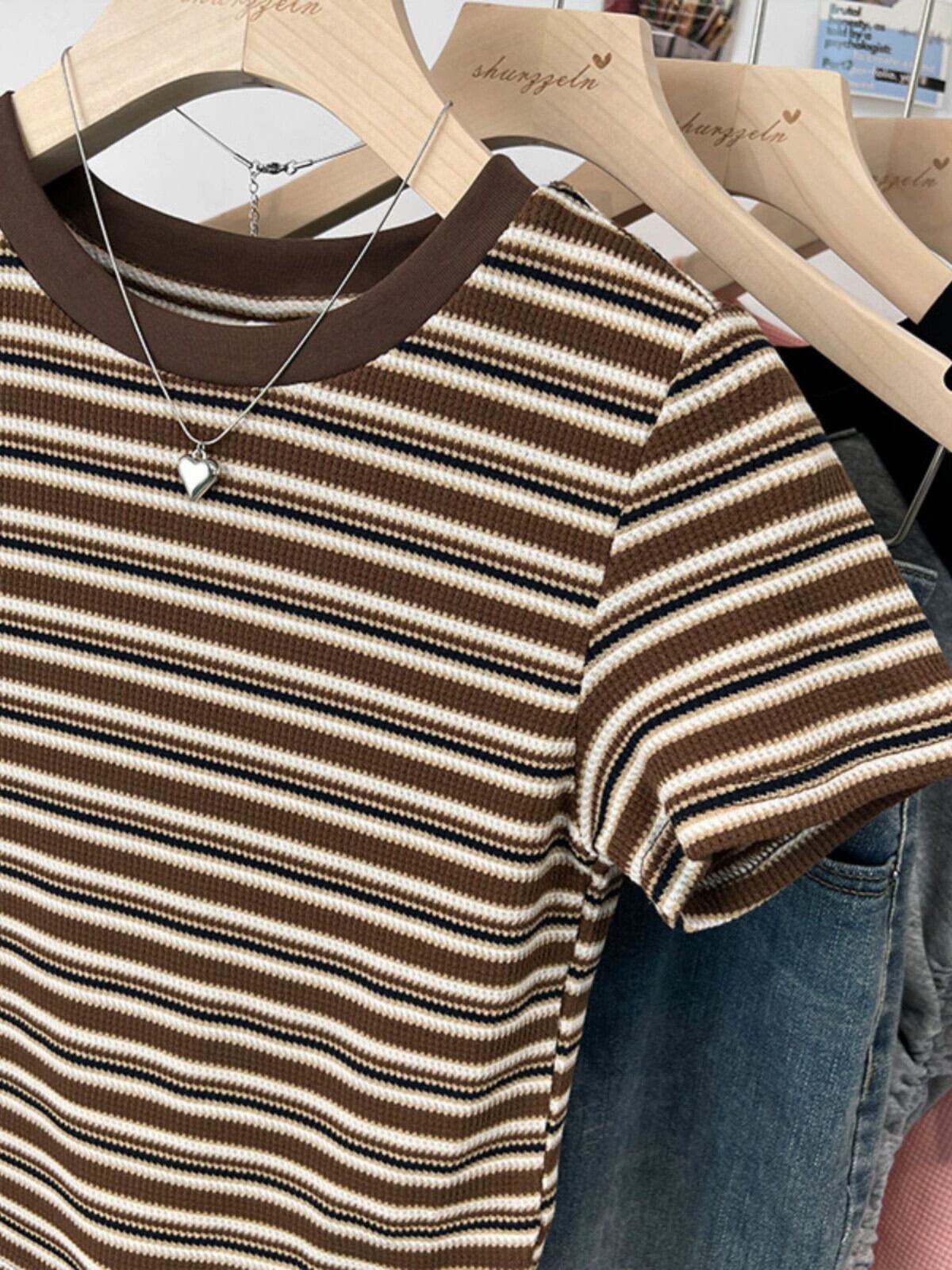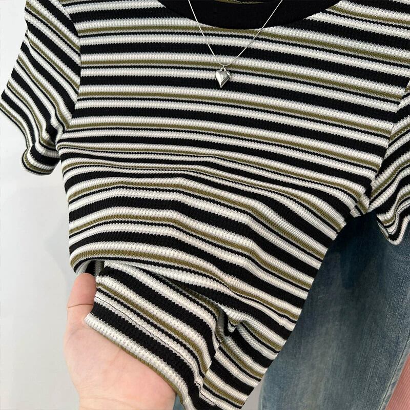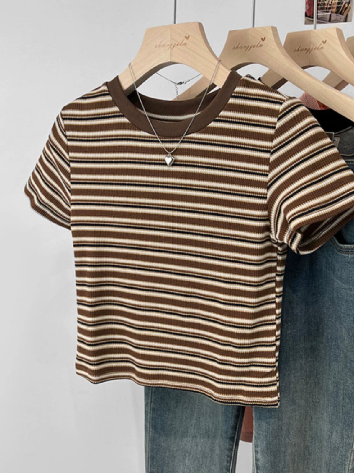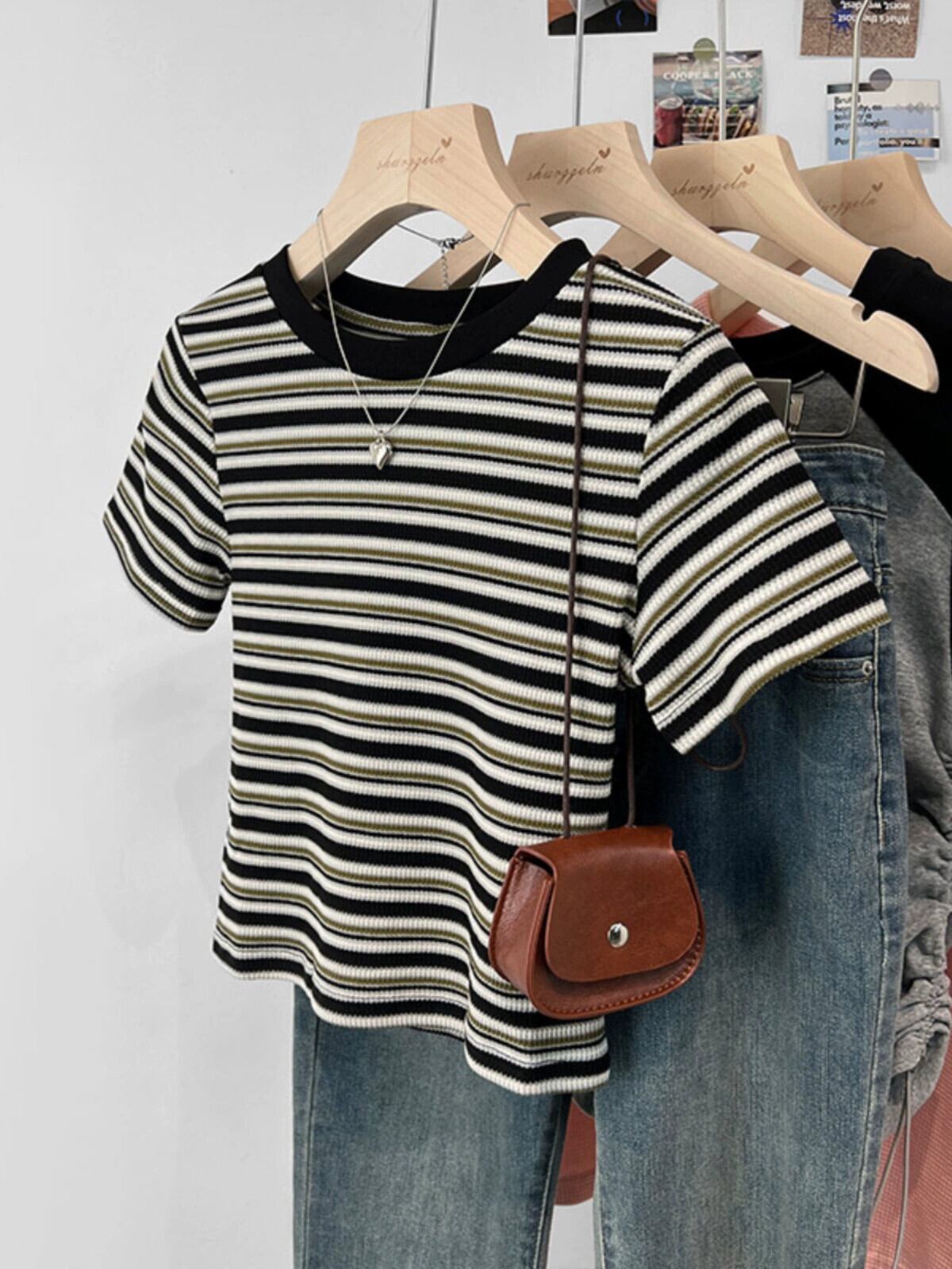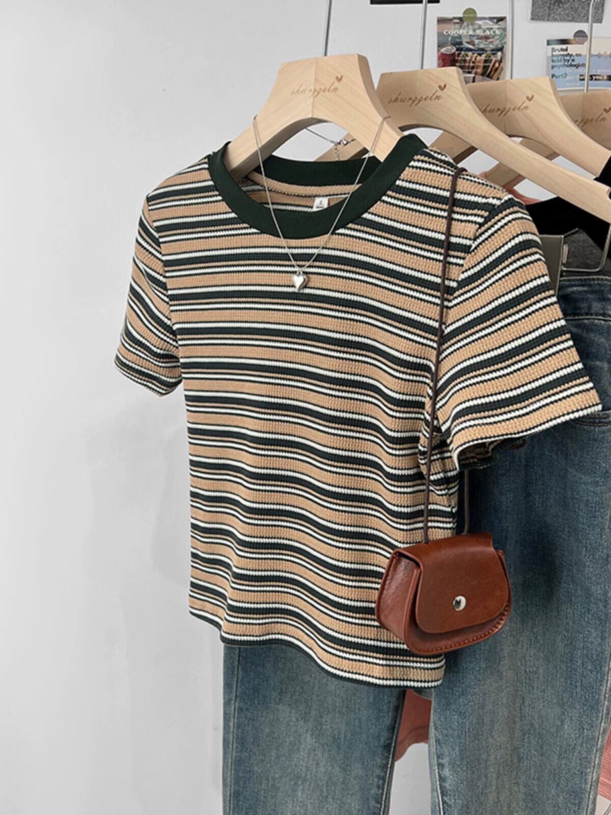 アメリカンスタイルのフロントショルダーストライプ半袖Tシャツレディース夏レトロデザイン自己修養の感覚と薄い短いセクションへそラウンドネックトップ ショート サマー 夏物 Oネック 7460060923744942 | framboise21