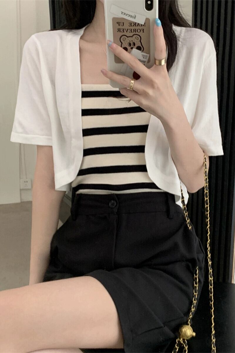 白いニット半袖カーディガン薄いセクション女性の夏のファッション緩くて薄いアウターウェアショートアイスシルク小さなショールトップ ホワイト サマー 夏物 7460025881124685 | framboise21