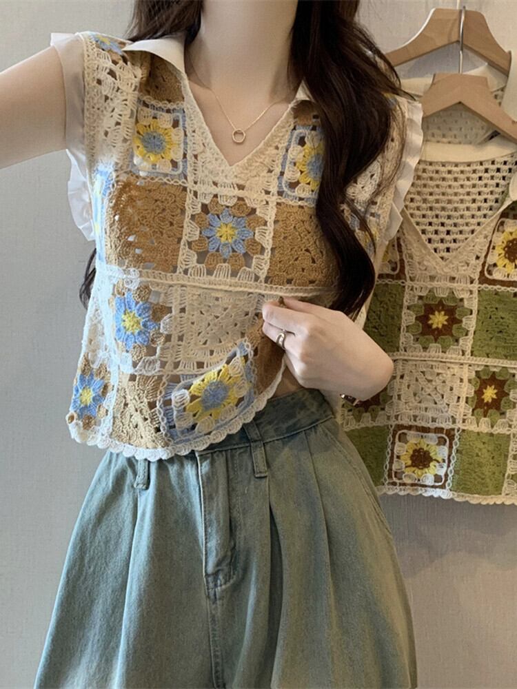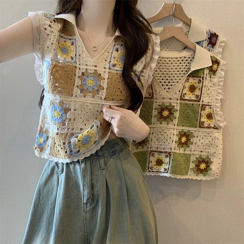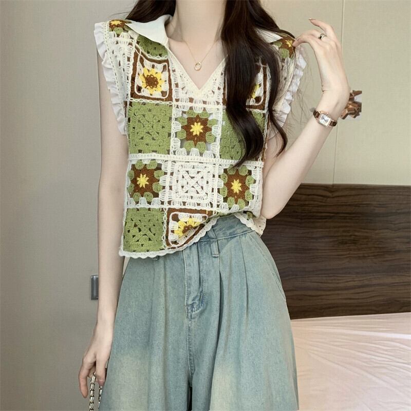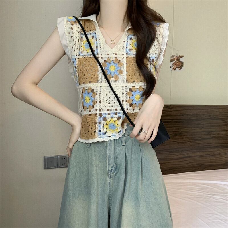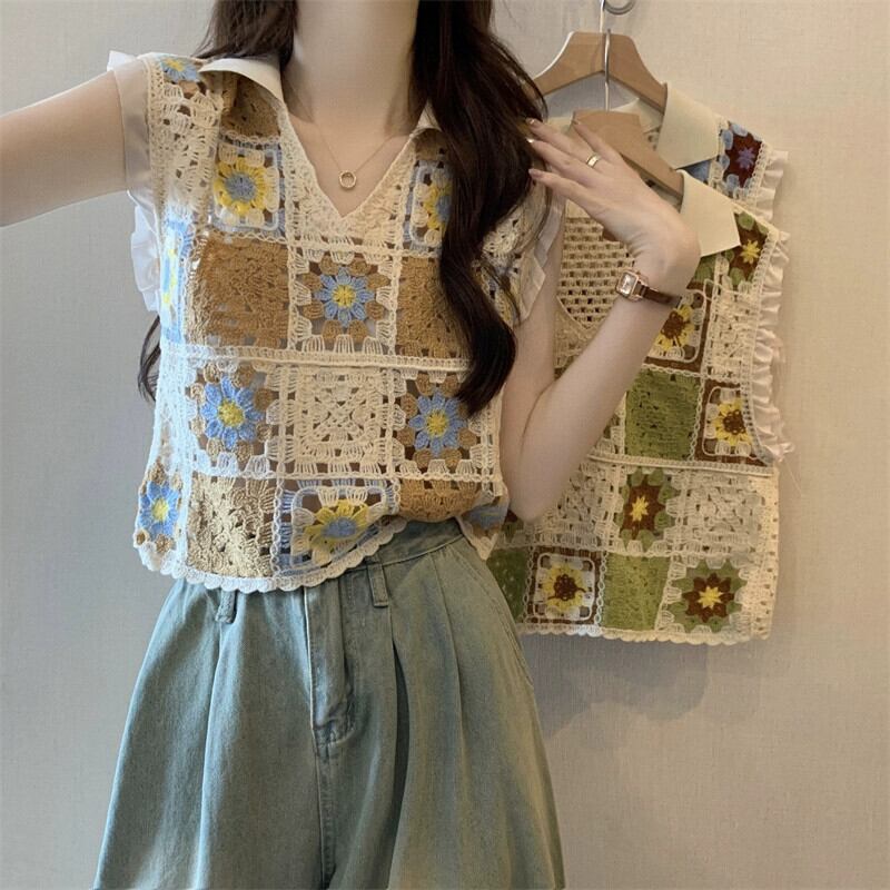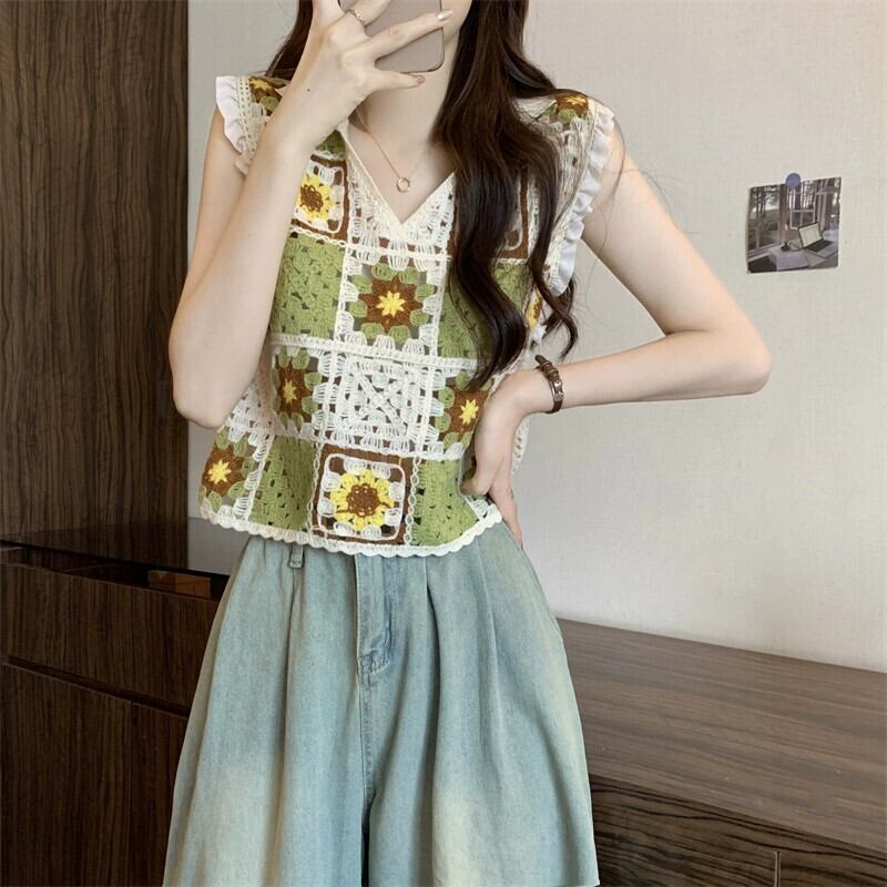 ストラップ付き中空ニットベスト レディース 夏 フレンチシック ニッチ アウター ルーズ ショート Vネック ノースリーブ トップ 薄手 サマー 夏物 7460018974736275 | framboise21