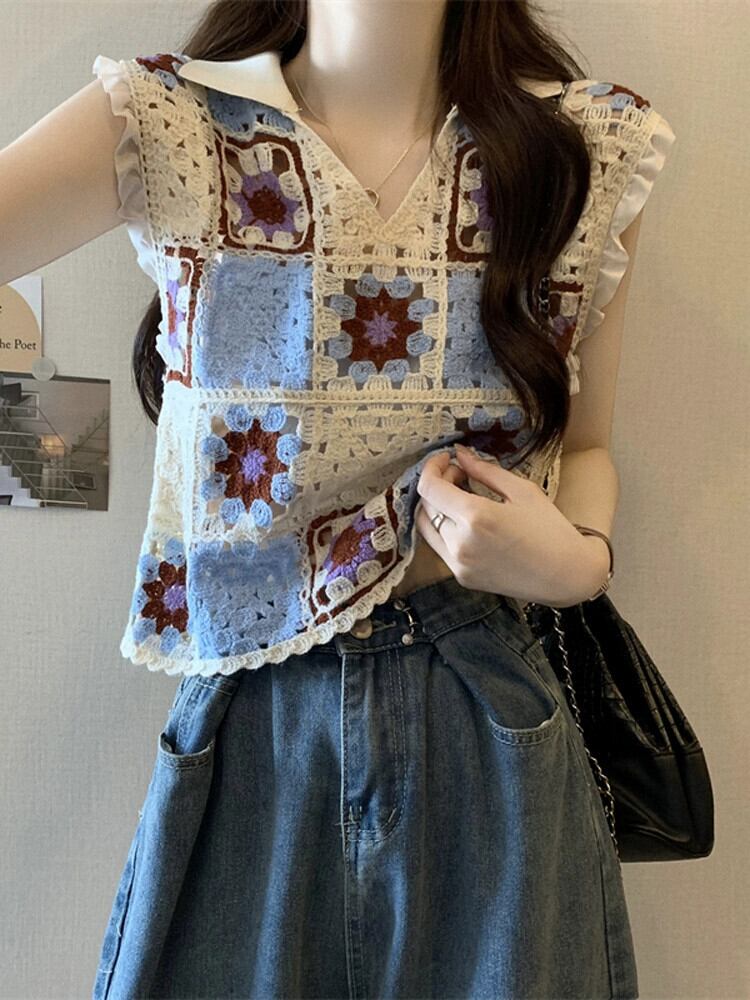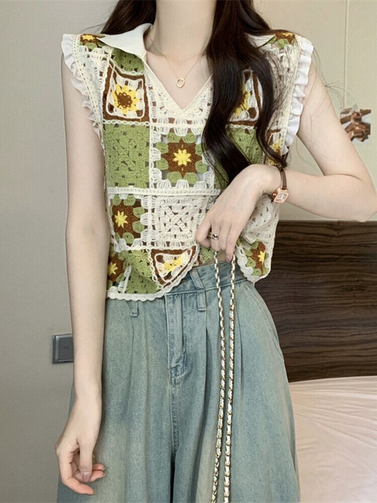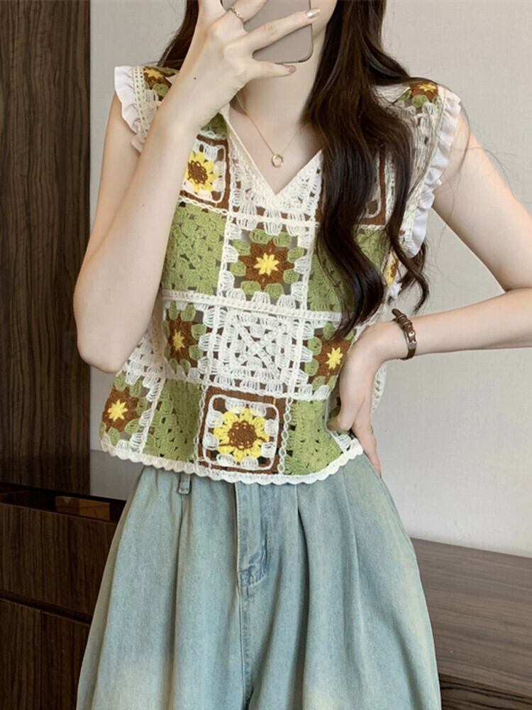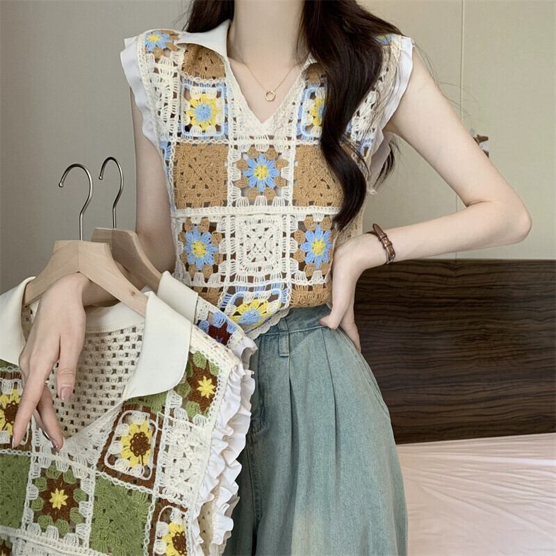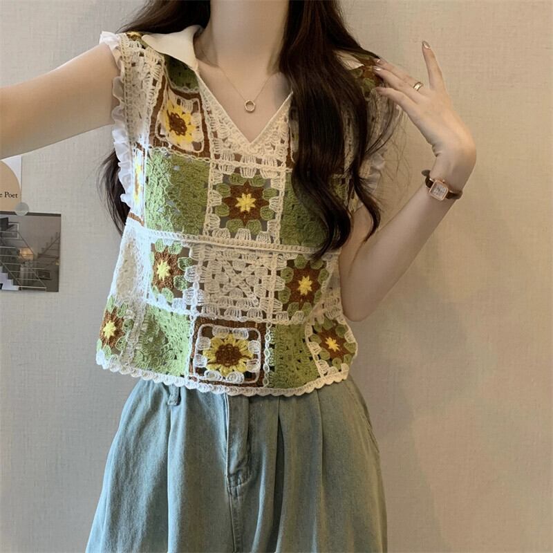 ストラップ付き中空ニットベスト レディース 夏 フレンチシック ニッチ アウター ルーズ ショート Vネック ノースリーブ トップ 薄手 サマー 夏物 7460018974736275 | framboise21