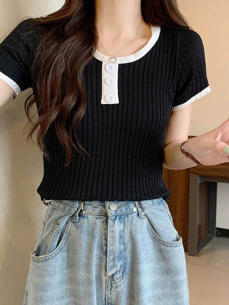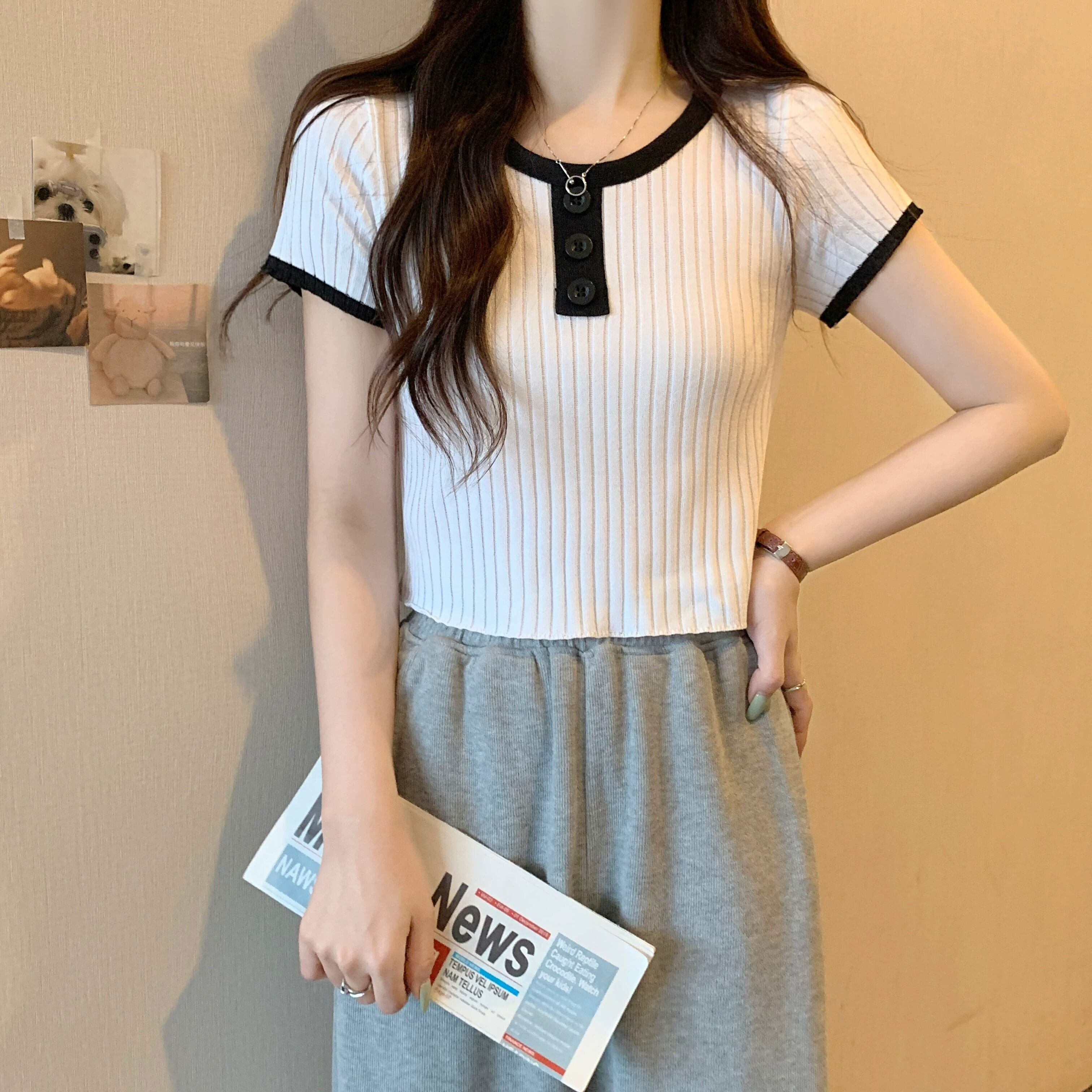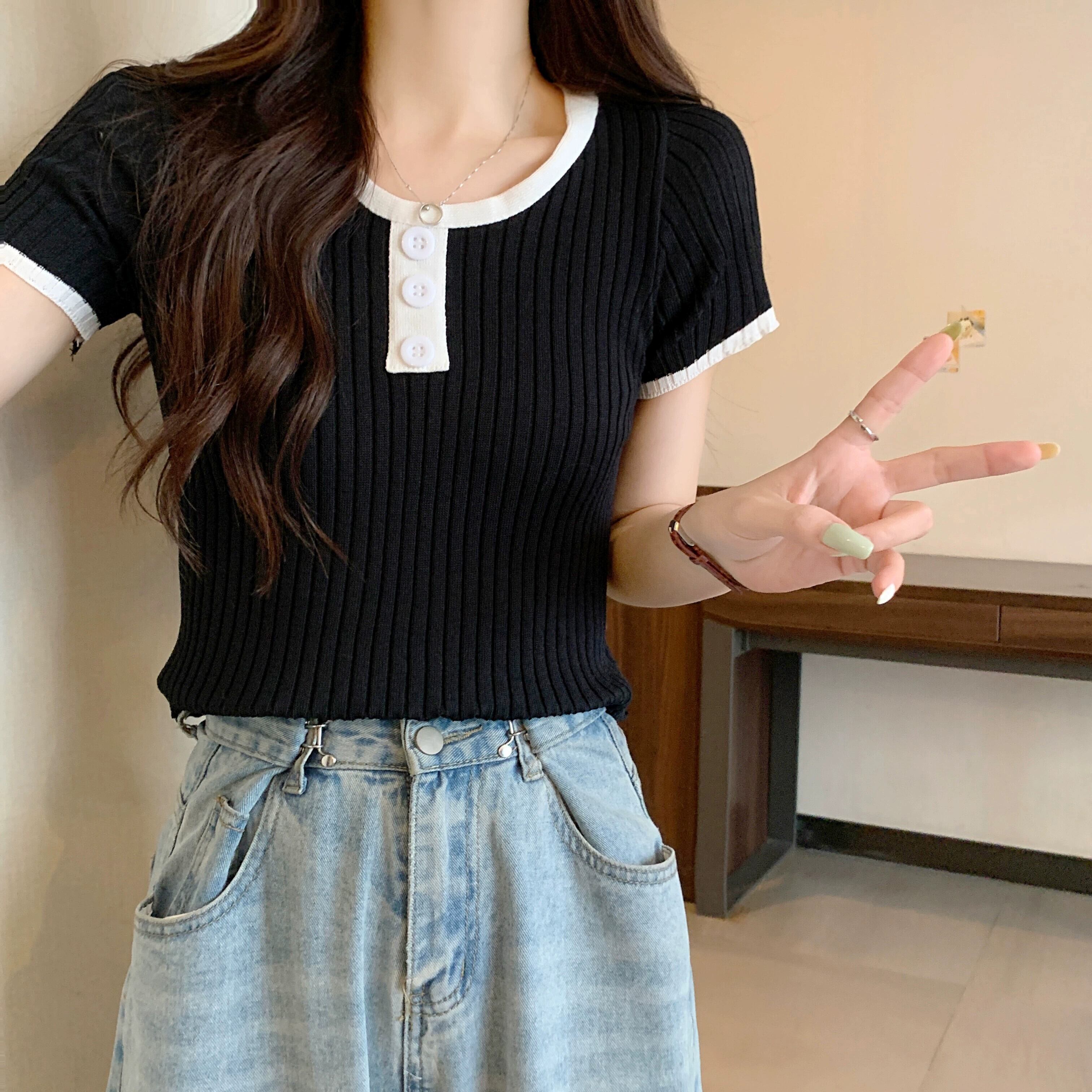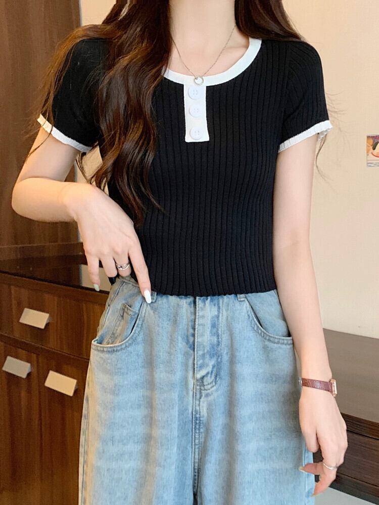 黒ニット半袖トップ女性の夏 2023 新しい小男スリムフィット薄いオールマッチショートショルダー t シャツ ブラック サマー 夏物 Tシャツ 7460035149294464 | framboise21