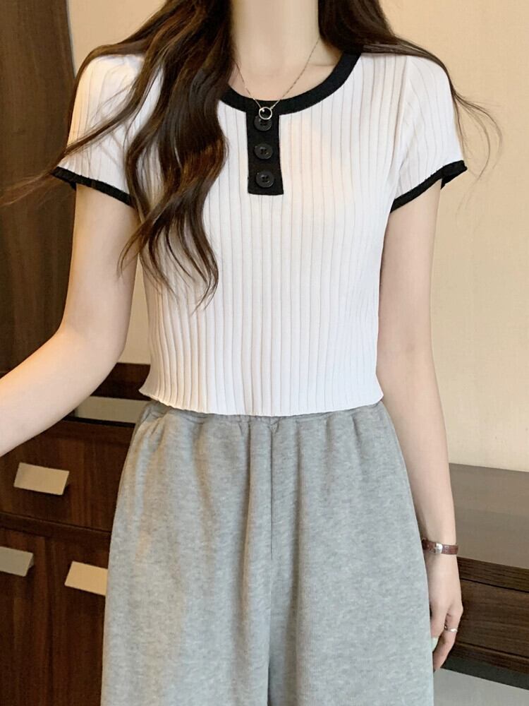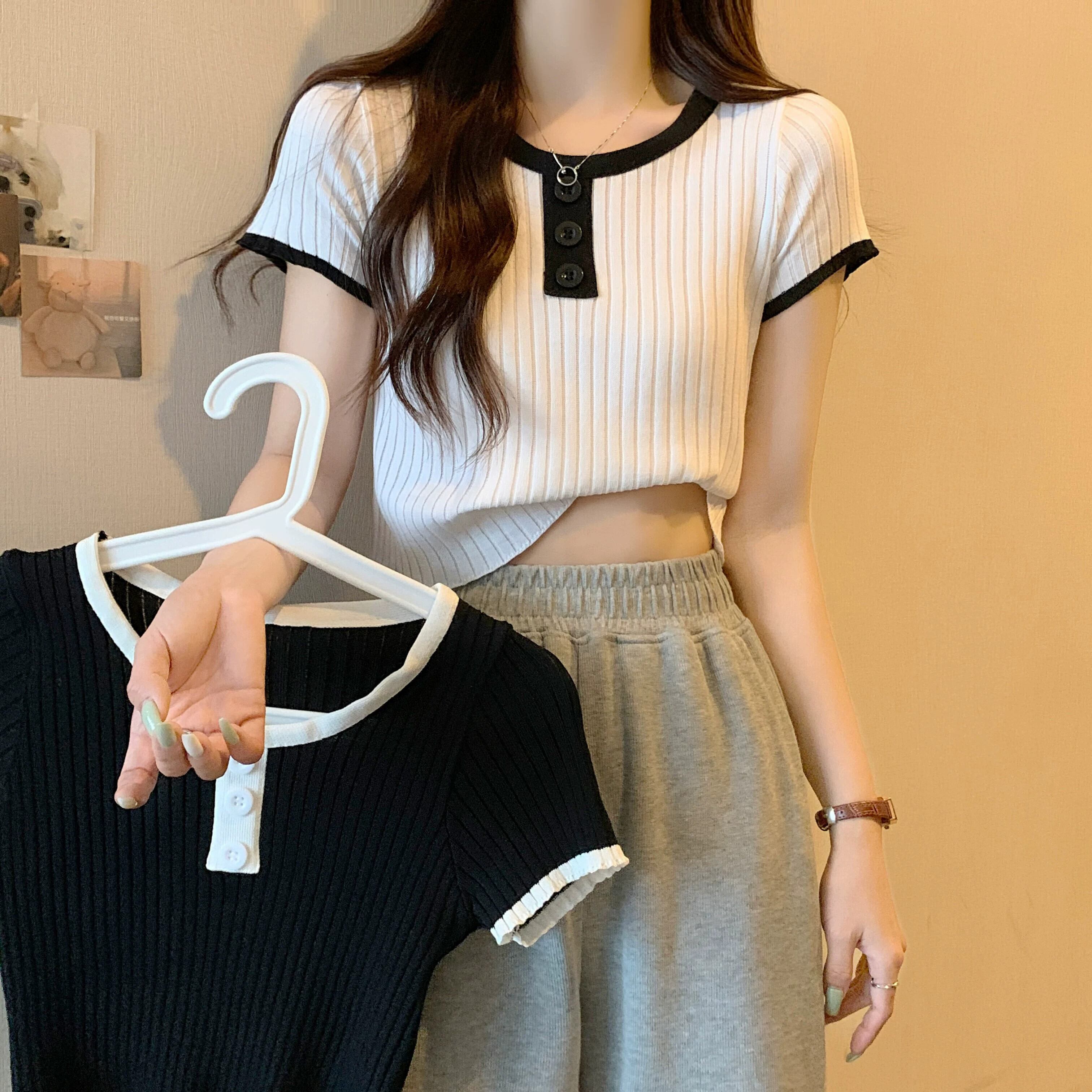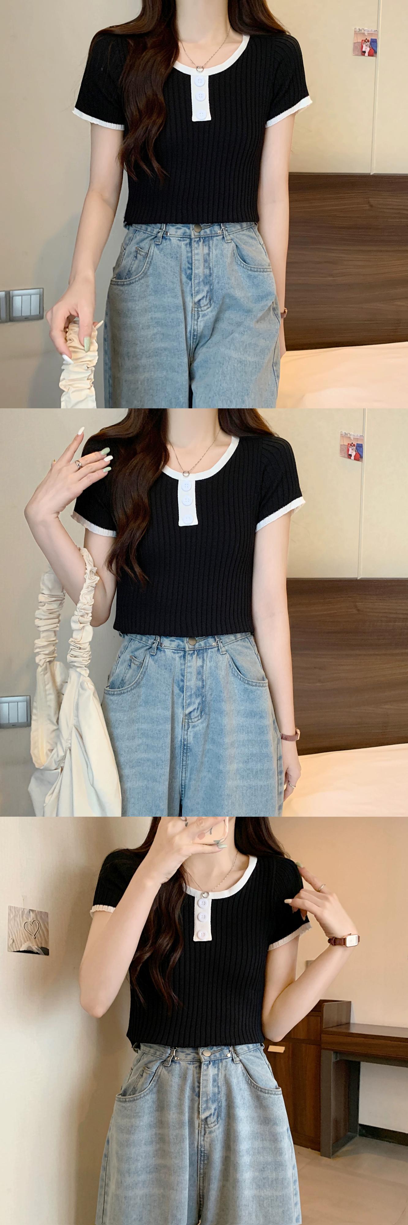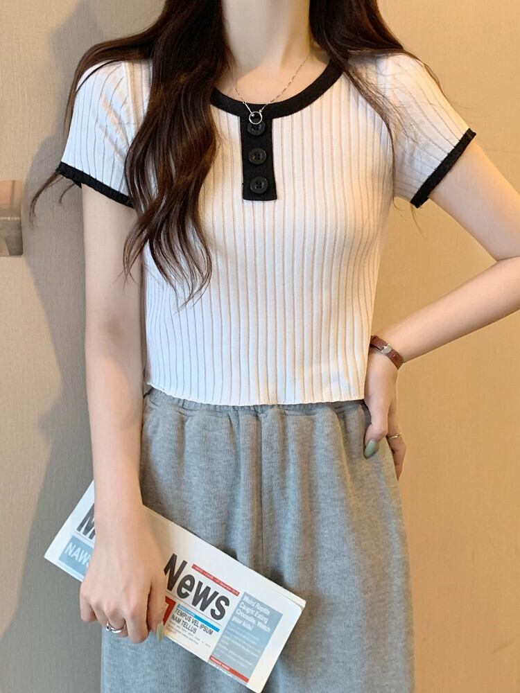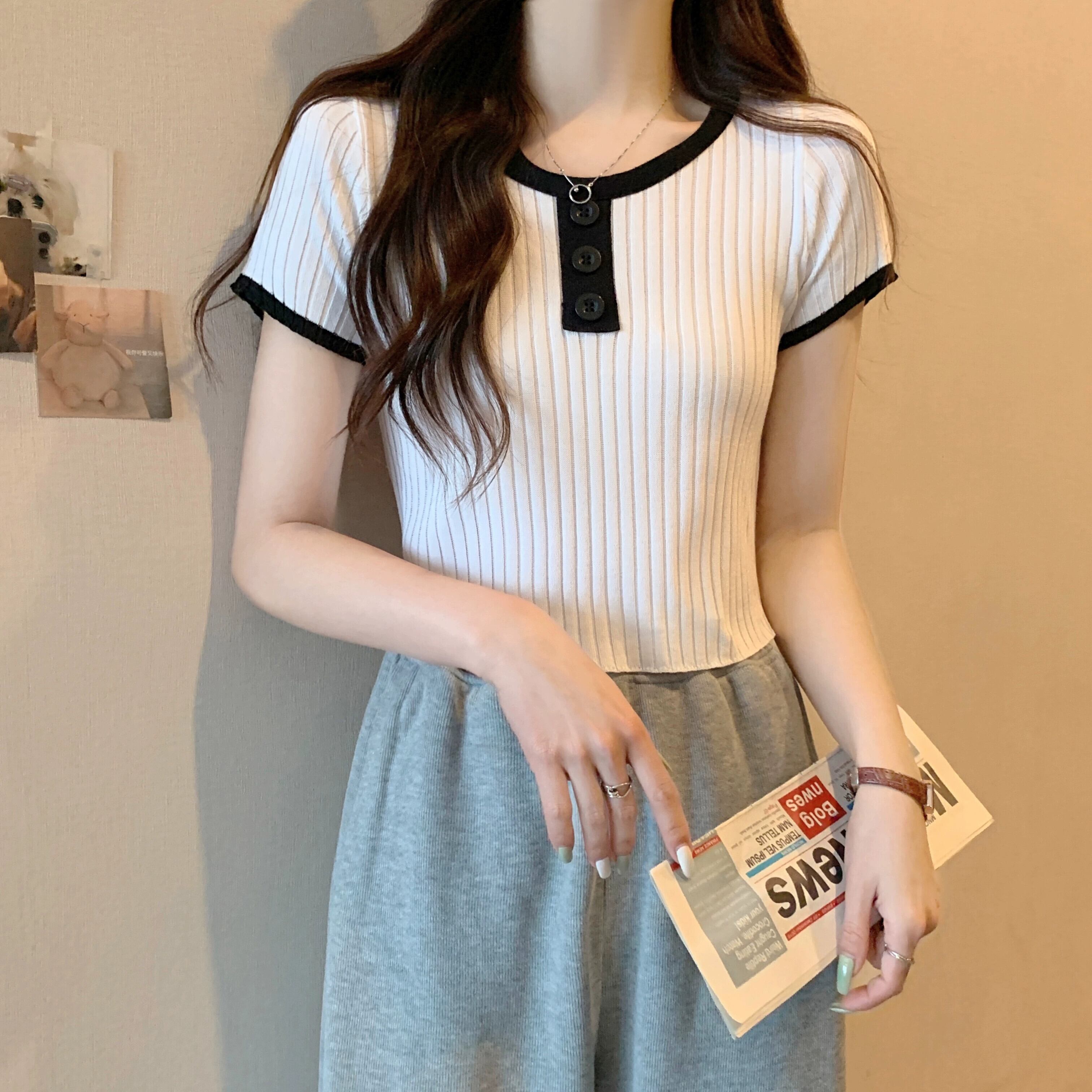 黒ニット半袖トップ女性の夏 2023 新しい小男スリムフィット薄いオールマッチショートショルダー t シャツ ブラック サマー 夏物 Tシャツ 7460035149294464 | framboise21
