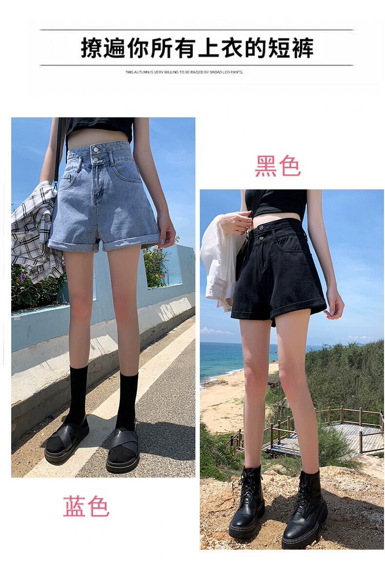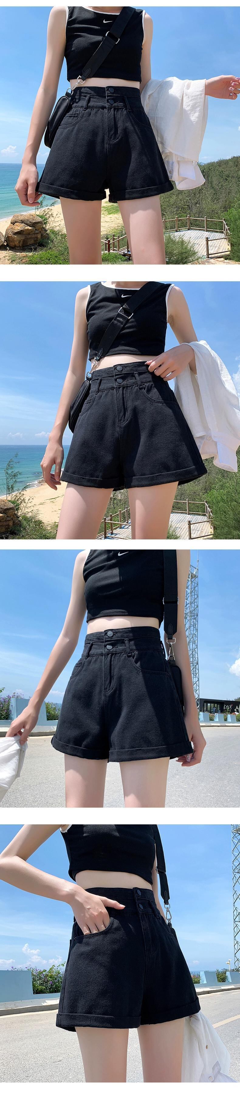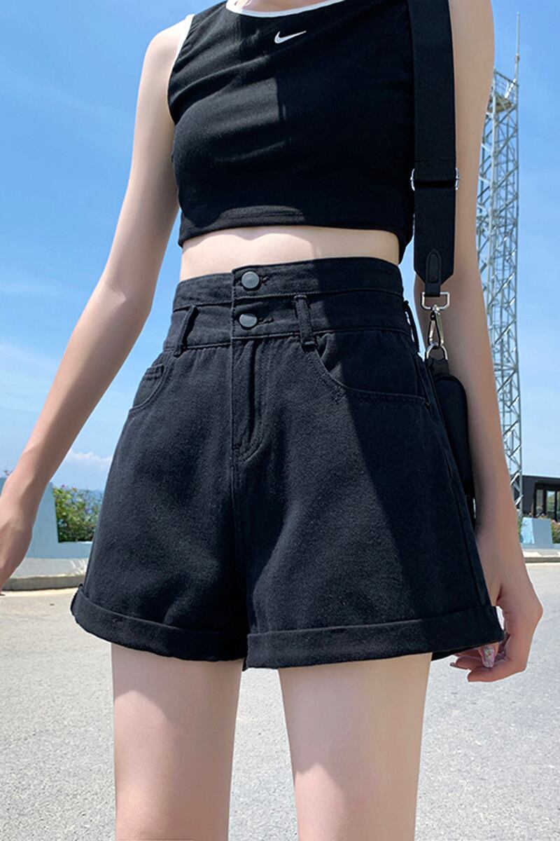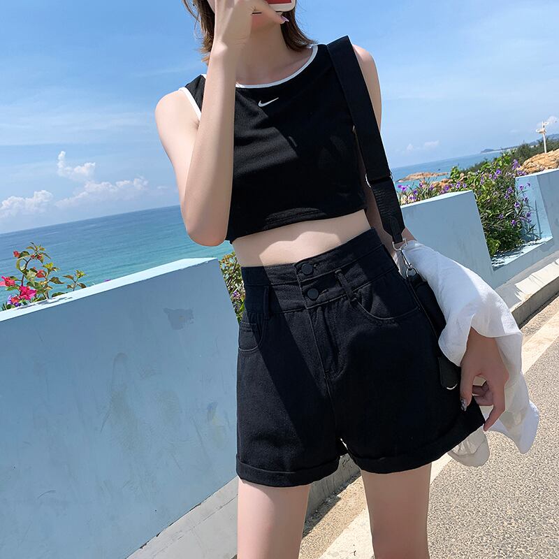 黒のワードロールエッジデニムショートパンツ女性の夏ルーズワイドレッグパンツ小さな背の高いウエストパンツ ブラック サマー 夏物 ショーツ ブルマー ワイドパンツ 7460043329864979 | framboise21