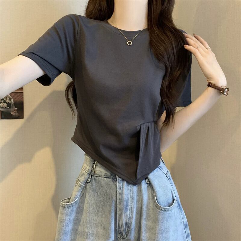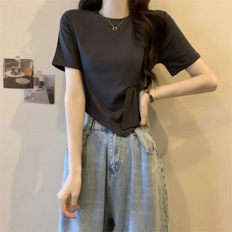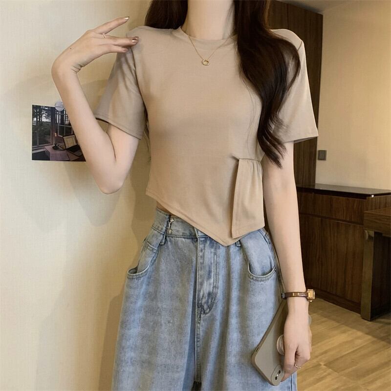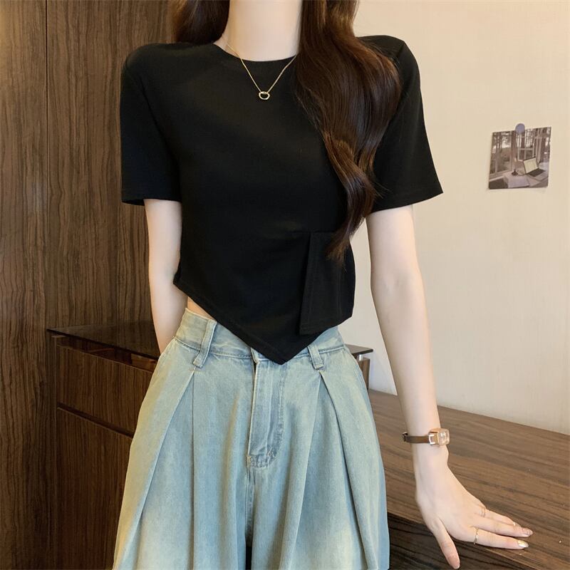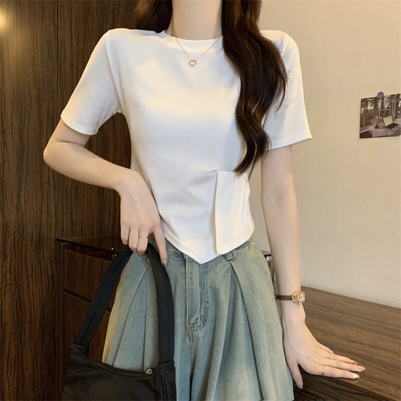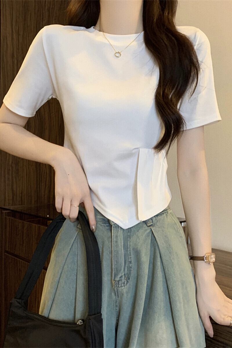 不規則なスプライシング半袖 T シャツ レディース 夏のファッション デザイン シック シック スリム ショート ショルダー ラウンド ネック トップ ホワイト サマー 夏物 Oネック Tシャツ 7460093588349961 | framboise21