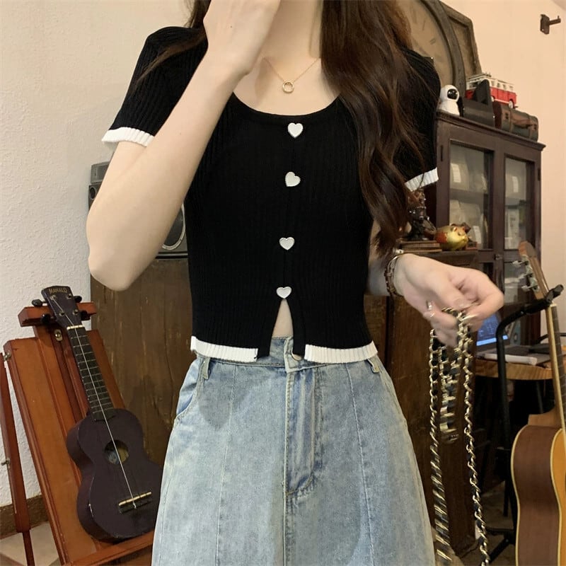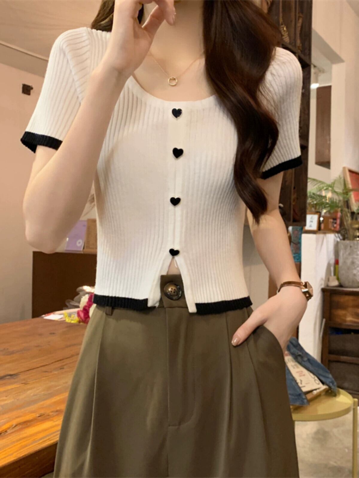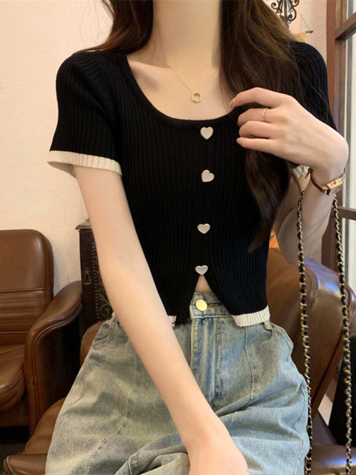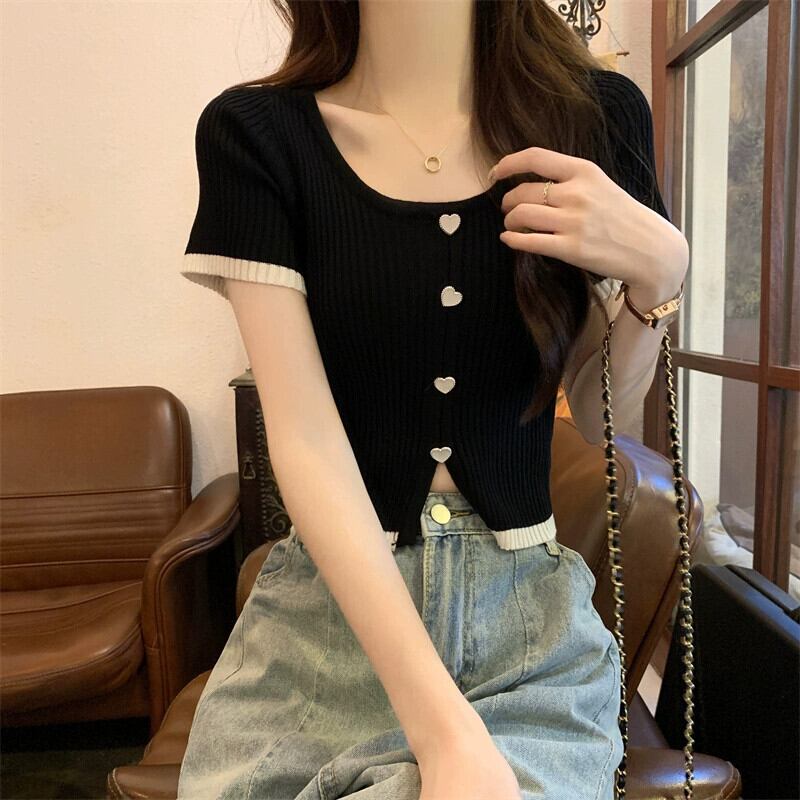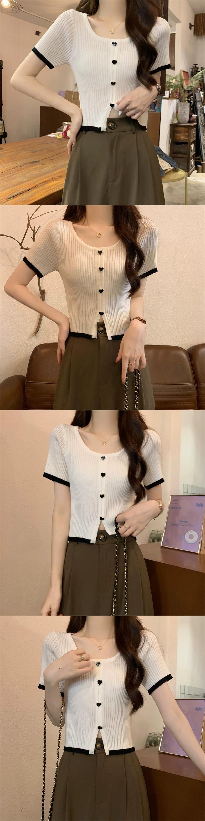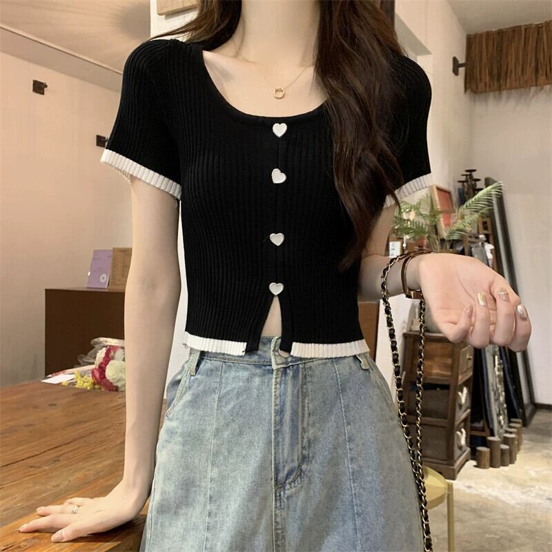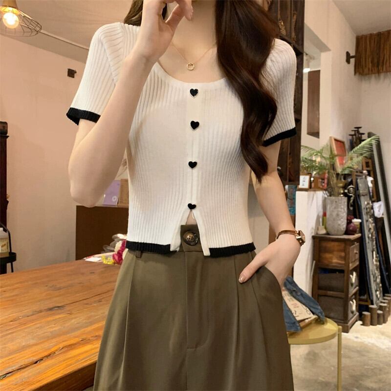 薄肉ハイウエストスリットニット半袖Tシャツレディース夏のファッションデザイン自己修養の感覚アイスシルクショートラウンドネックトップ ハイウェスト サマー 夏物 Oネック 746004268841669 | framboise21