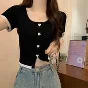 薄肉ハイウエストスリットニット半袖Tシャツレディース夏のファッションデザイン自己修養の感覚アイスシルクショートラウンドネックトップ ハイウェスト サマー 夏物 Oネック 746004268841669