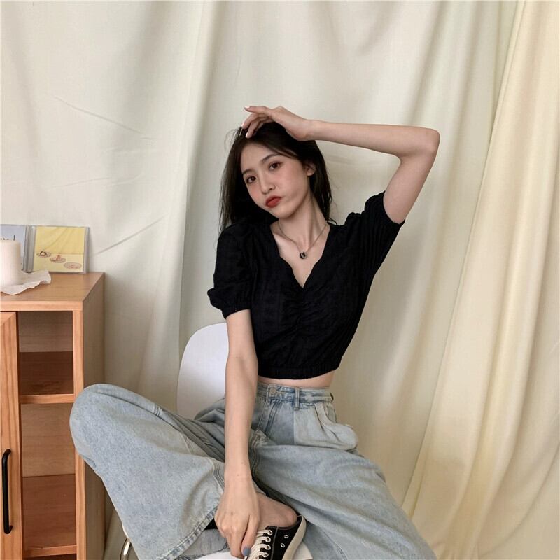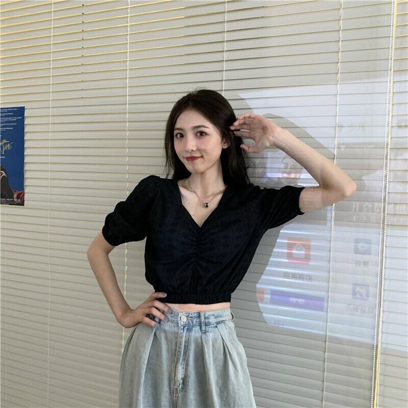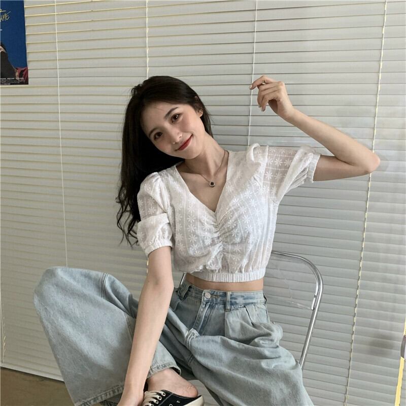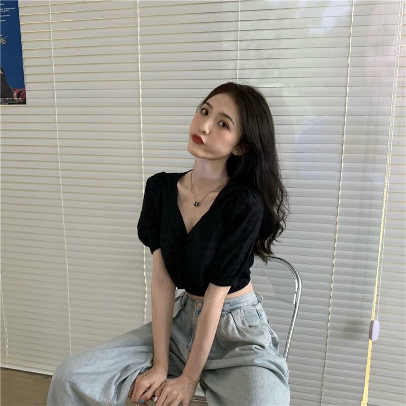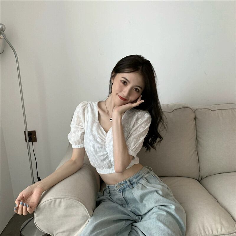 ホワイトショートバブル半袖シャツレディース夏のファッションデザインセンス小男ハイウエストへそローカラートップトレンディ ハイウェスト サマー 夏物 7460087002084482 | framboise21