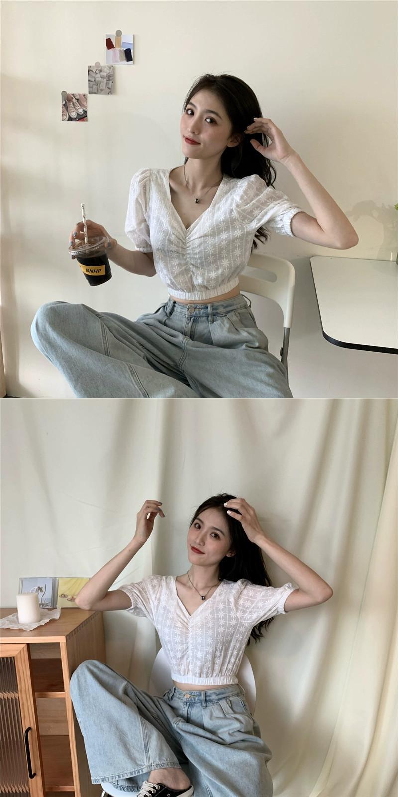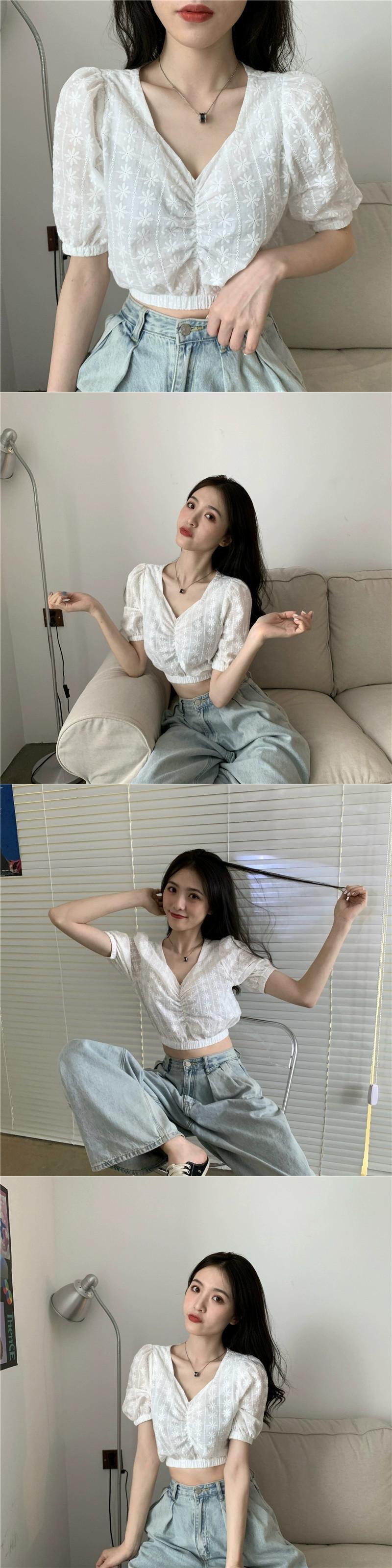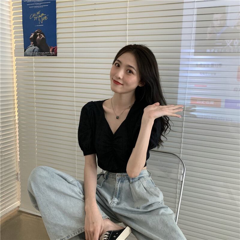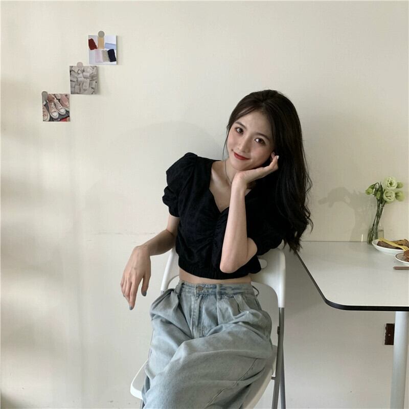 ホワイトショートバブル半袖シャツレディース夏のファッションデザインセンス小男ハイウエストへそローカラートップトレンディ ハイウェスト サマー 夏物 7460087002084482 | framboise21