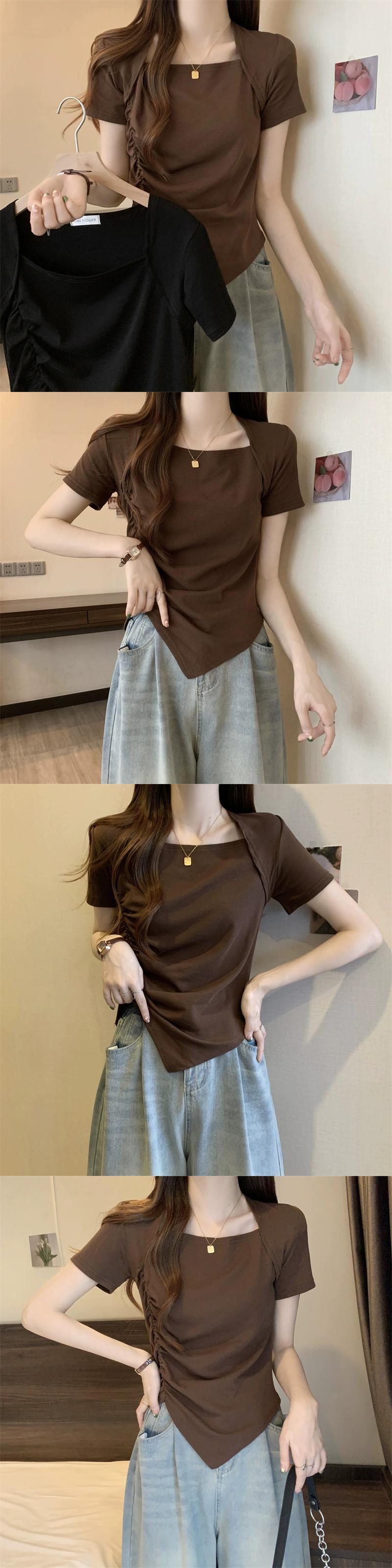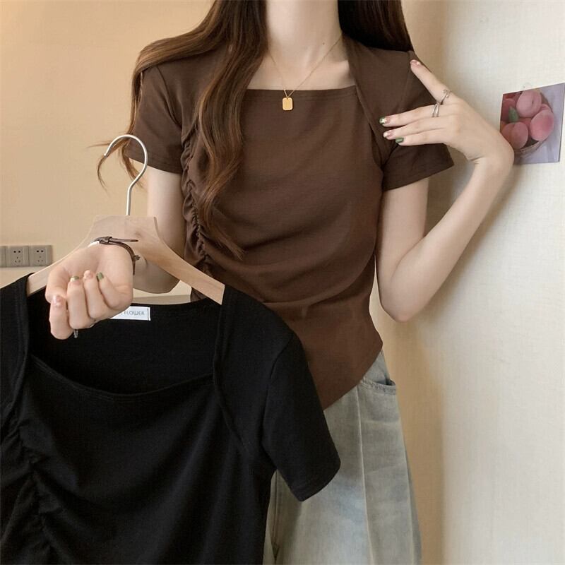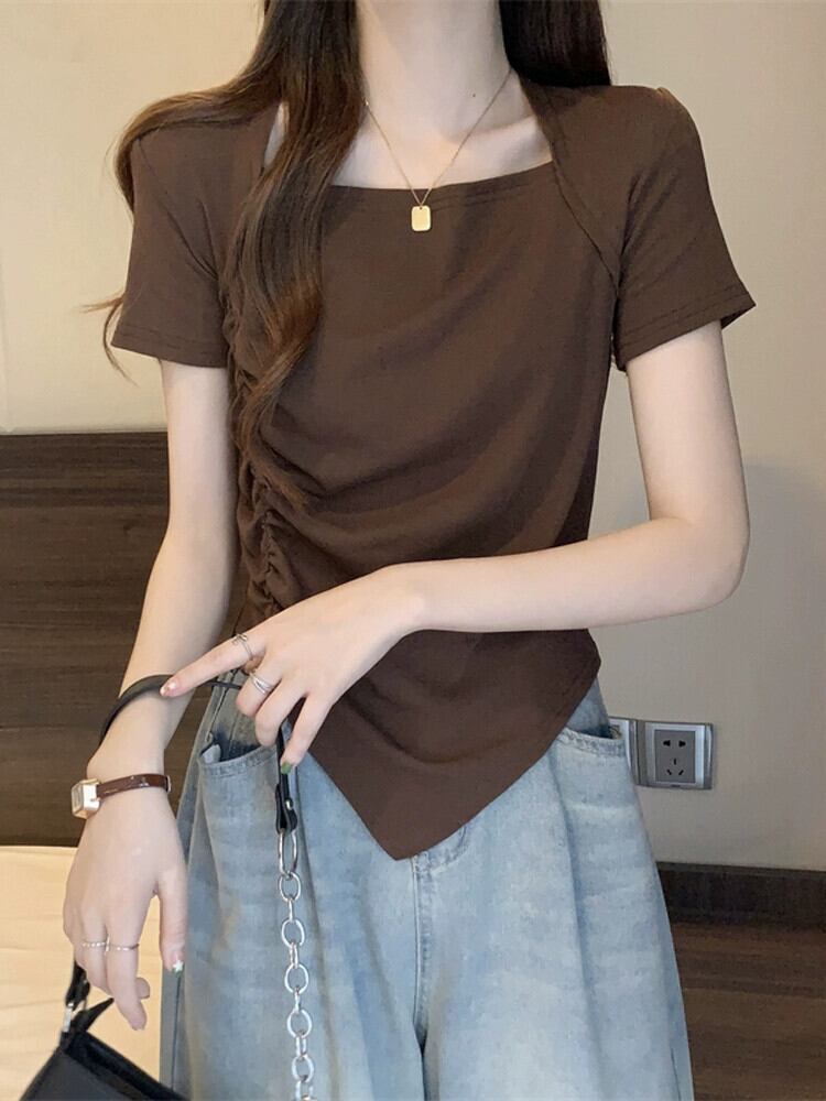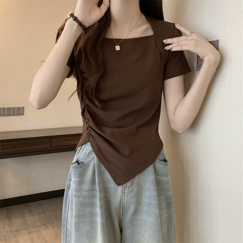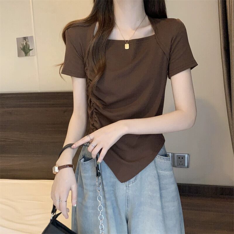 変則フロントショルダー半袖Tシャツレディース夏フレンチシックなデザイン自己修養感プリーツショートスクエアカラートップスコーヒー サマー 夏物 スクウェア 7460075937338373 | framboise21