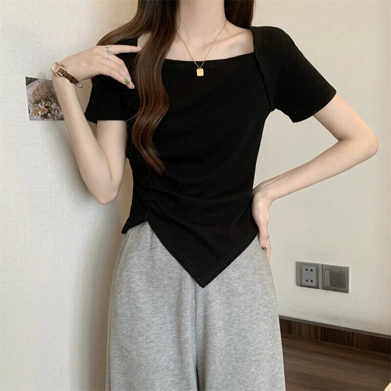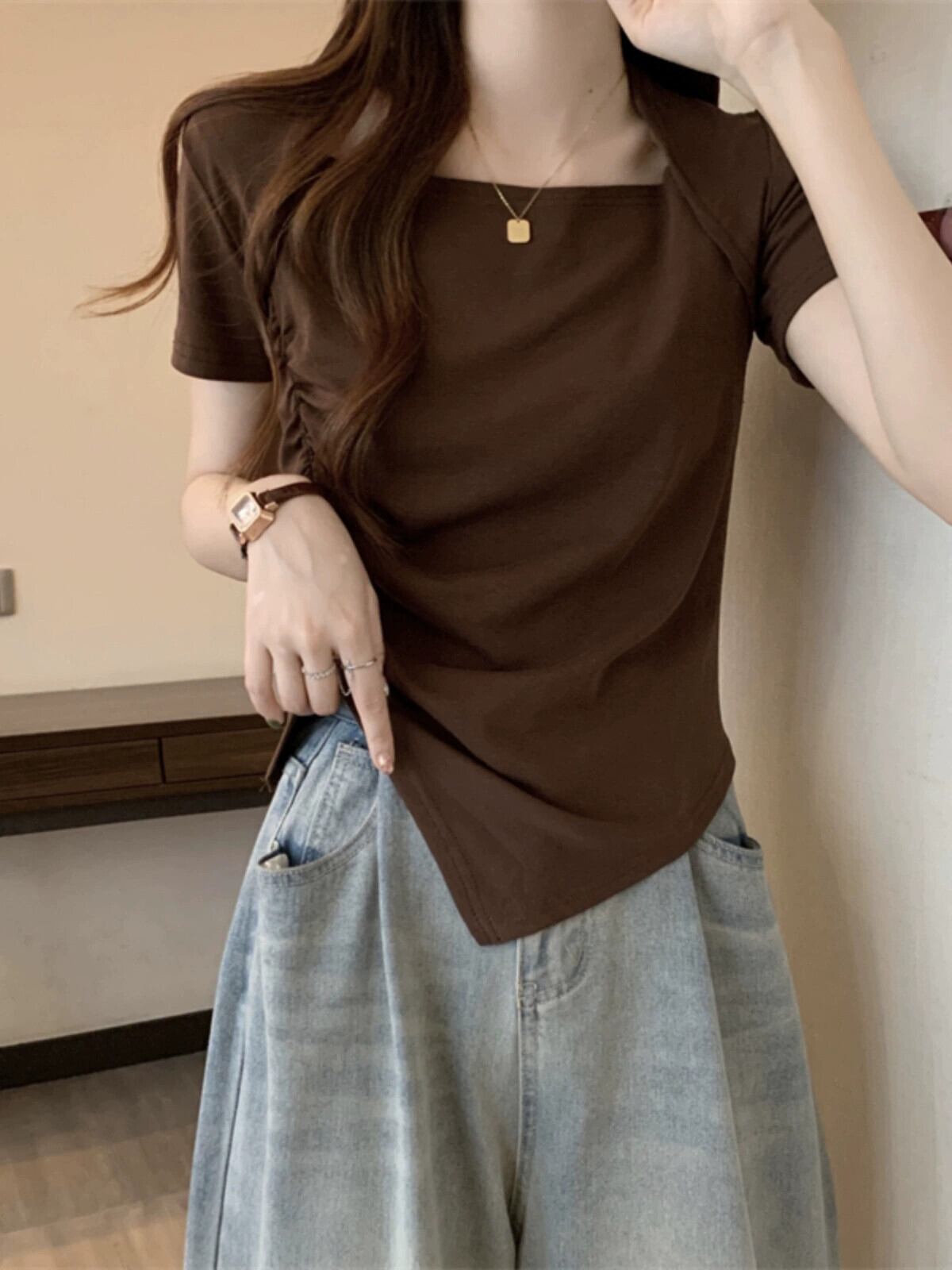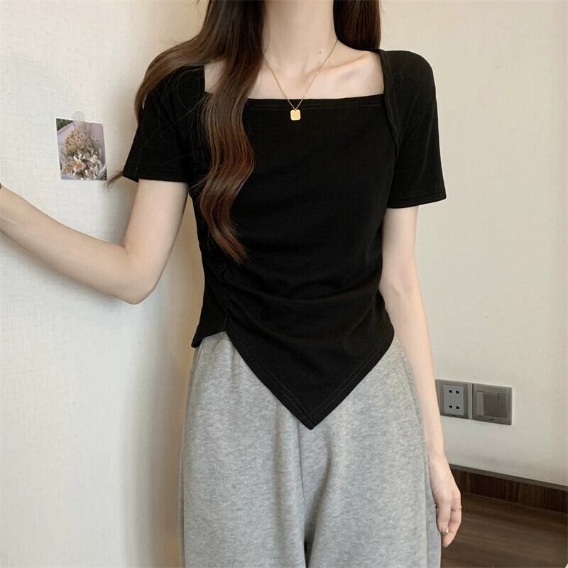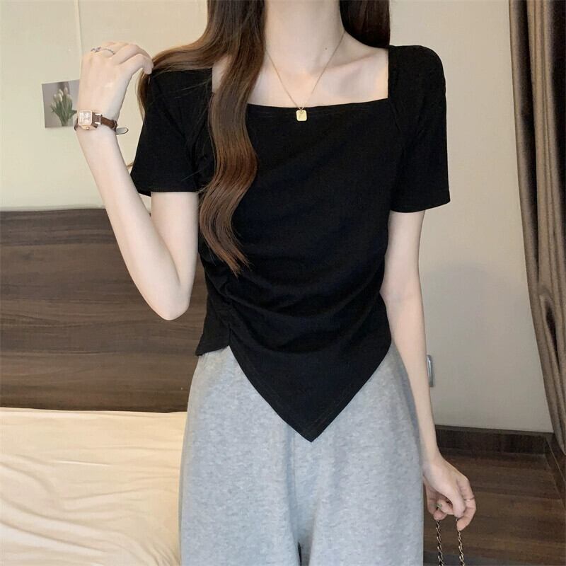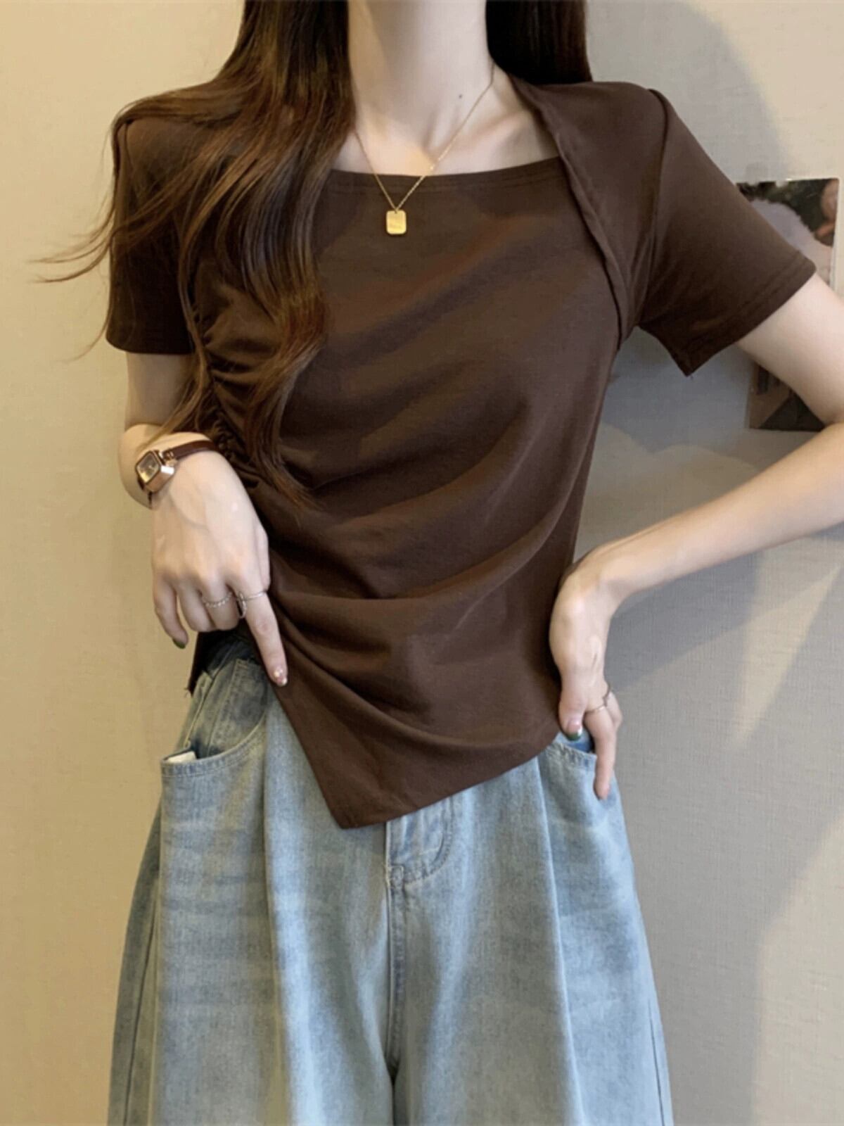 変則フロントショルダー半袖Tシャツレディース夏フレンチシックなデザイン自己修養感プリーツショートスクエアカラートップスコーヒー サマー 夏物 スクウェア 7460075937338373 | framboise21