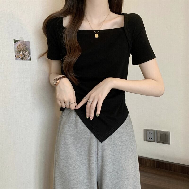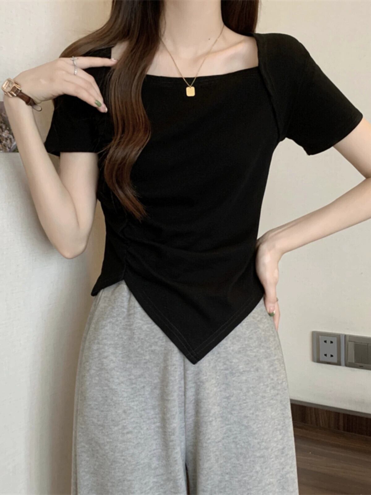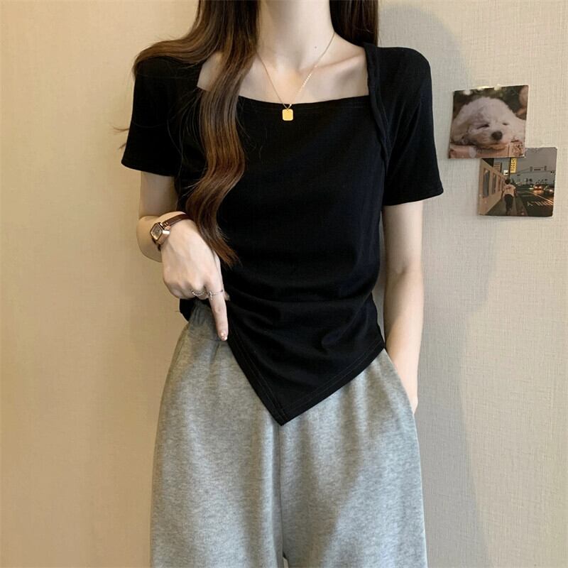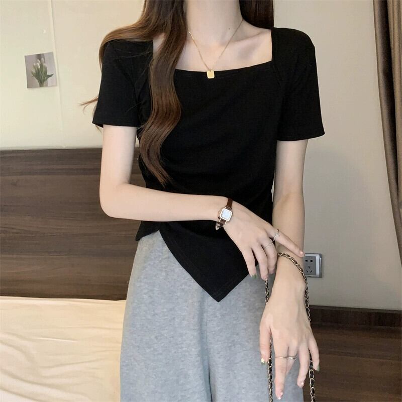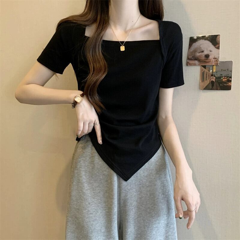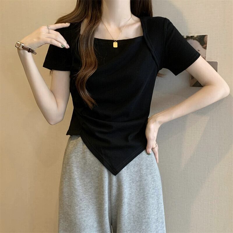 変則フロントショルダー半袖Tシャツレディース夏フレンチシックなデザイン自己修養感プリーツショートスクエアカラートップスコーヒー サマー 夏物 スクウェア 7460075937338373 | framboise21
