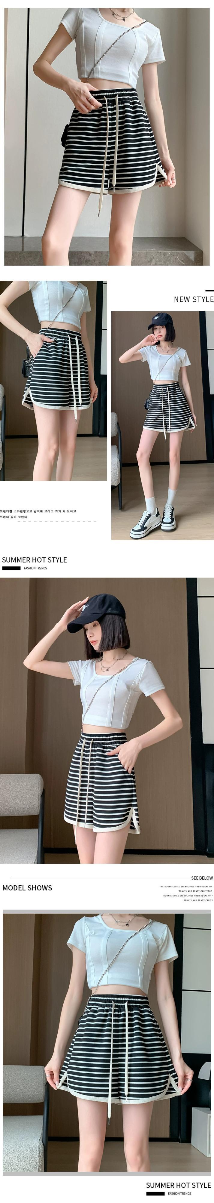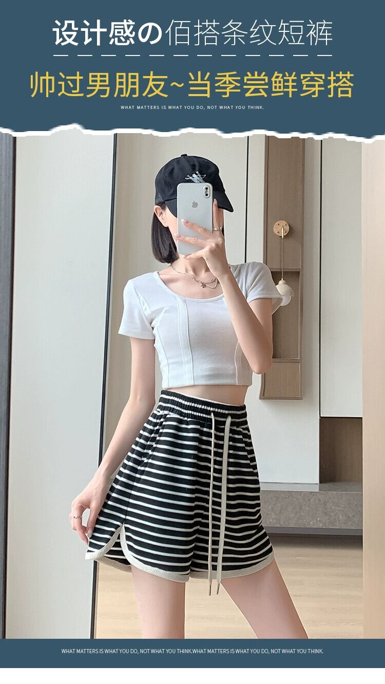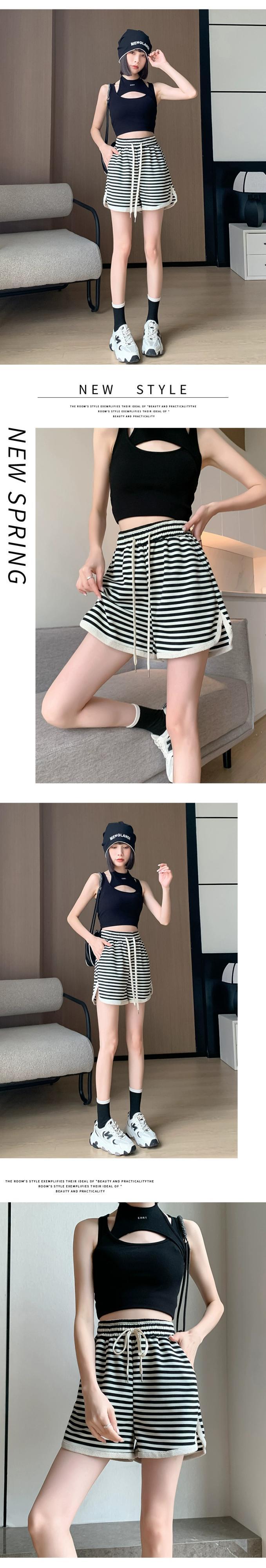 -ウエスト ワイドレッグ ストライプ ショートパンツ レディース 夏 ルーズ カジュアル 伸縮性ウエスト スリット パンツ アウター Aライン ドローストリング パンツ エラスティック サマー 夏物 ショーツ ブルマー 7460035893846789 | framboise21