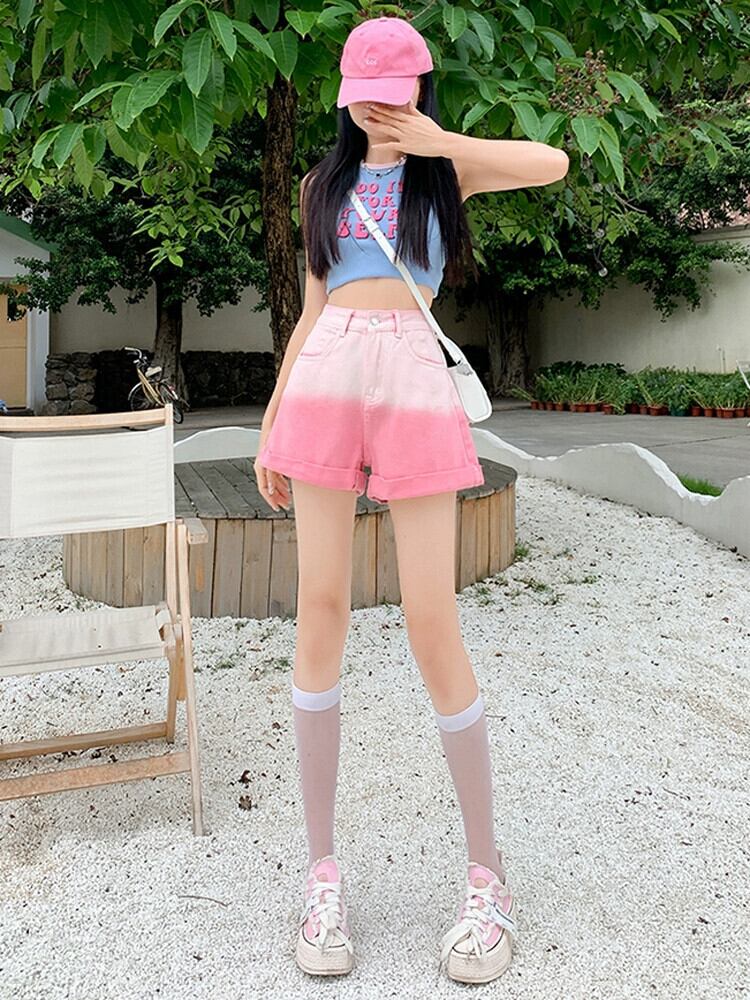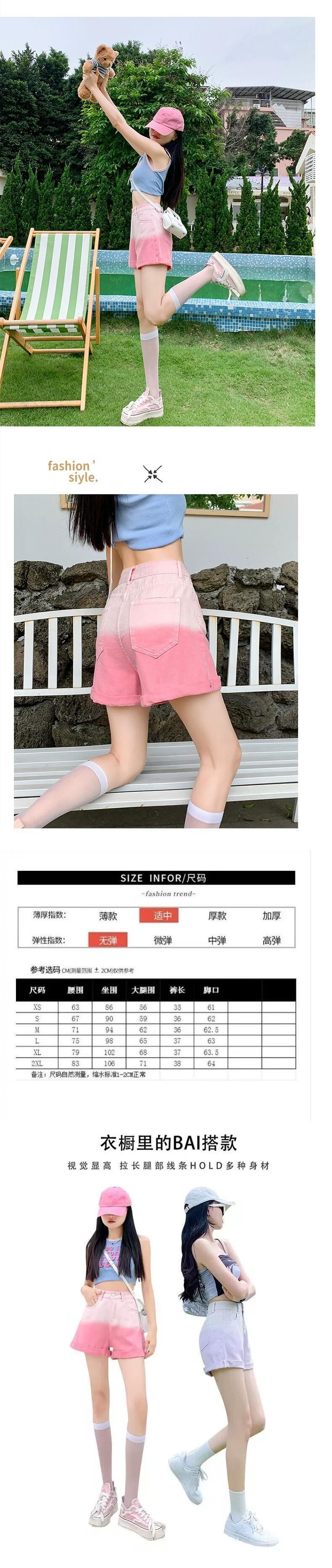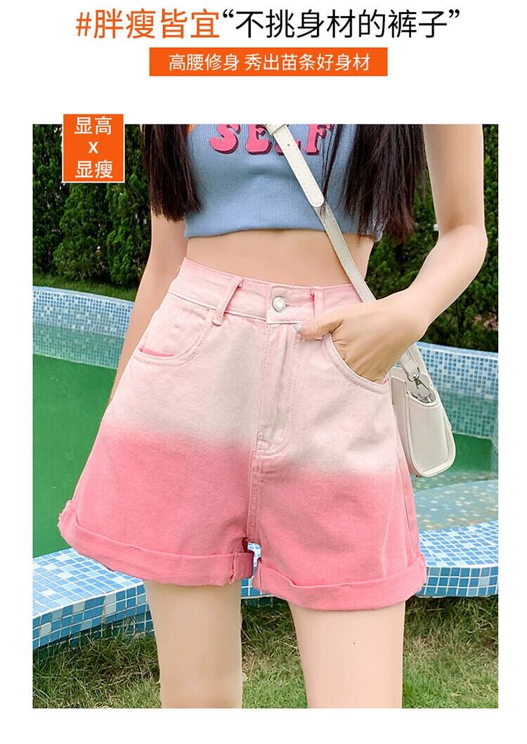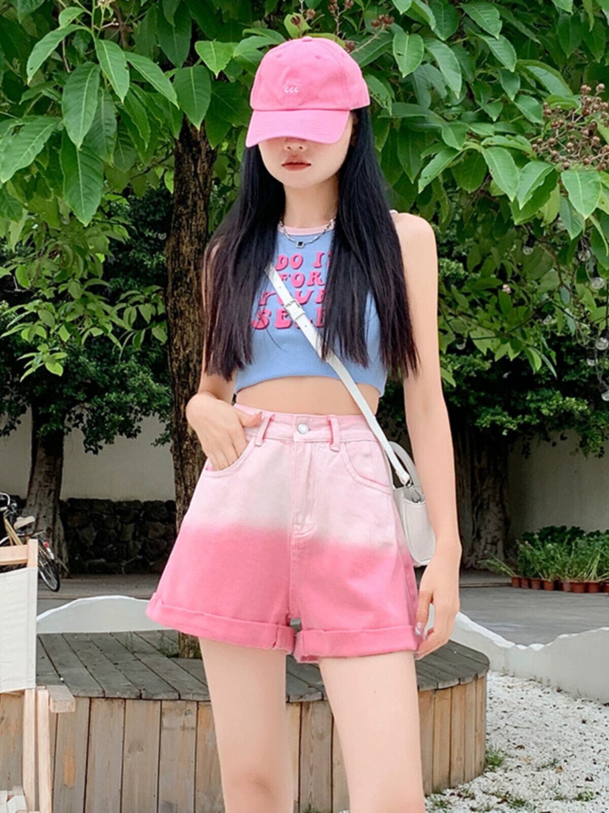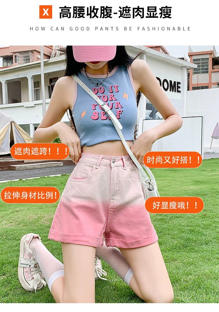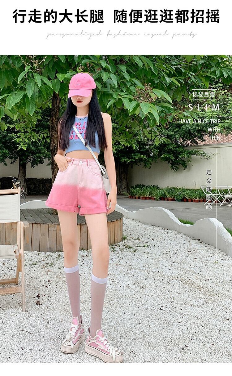 ロールワイドレッグデニムショートパンツレディース2023年夏新作アウターハイウエストパンツAラインピンクグラデーションパンツ潮 サマー 夏物 ショーツ ブルマー 7460083366488432 | framboise21