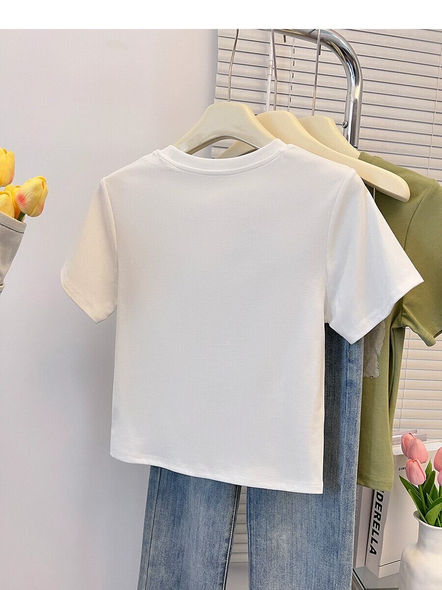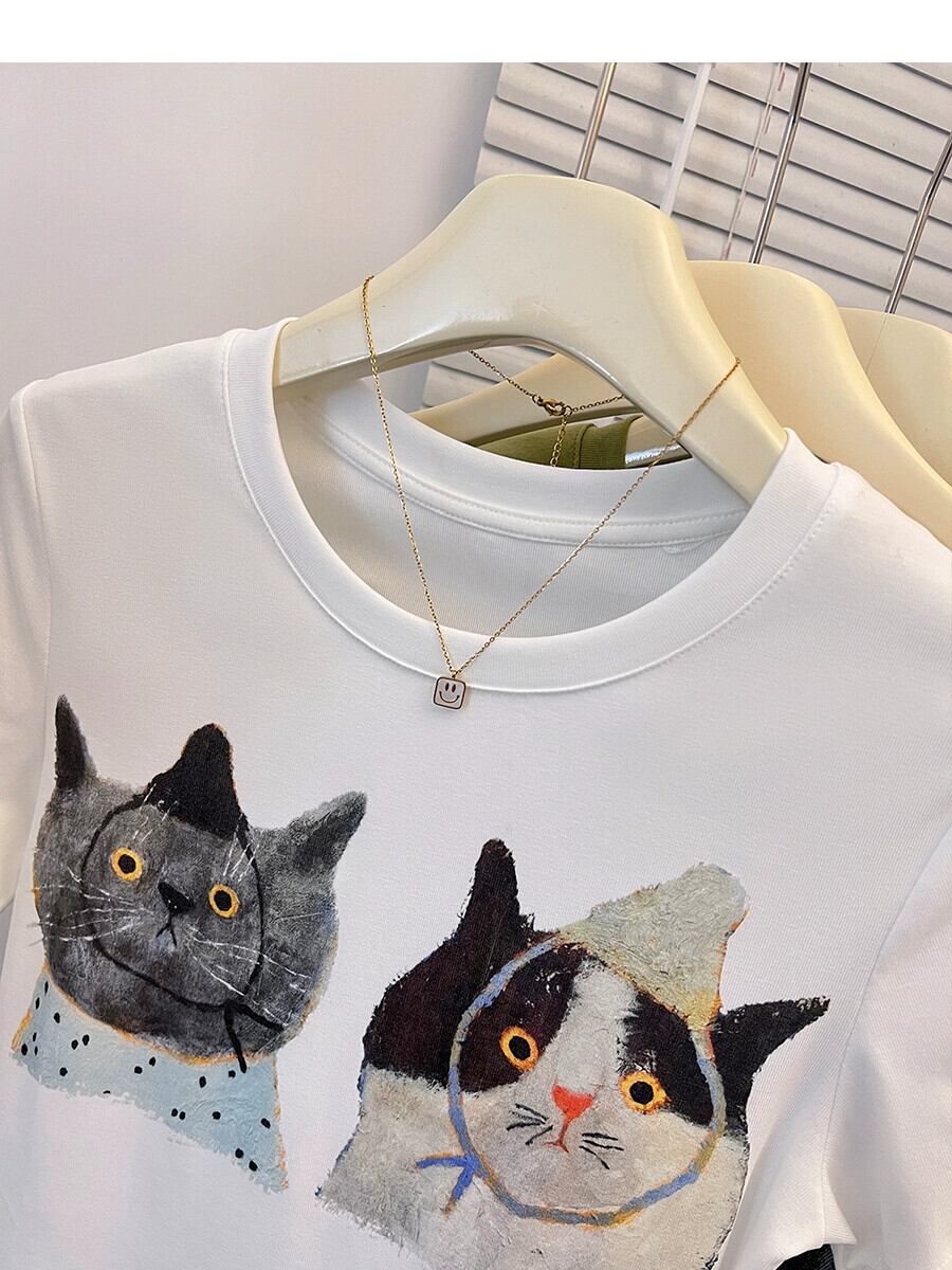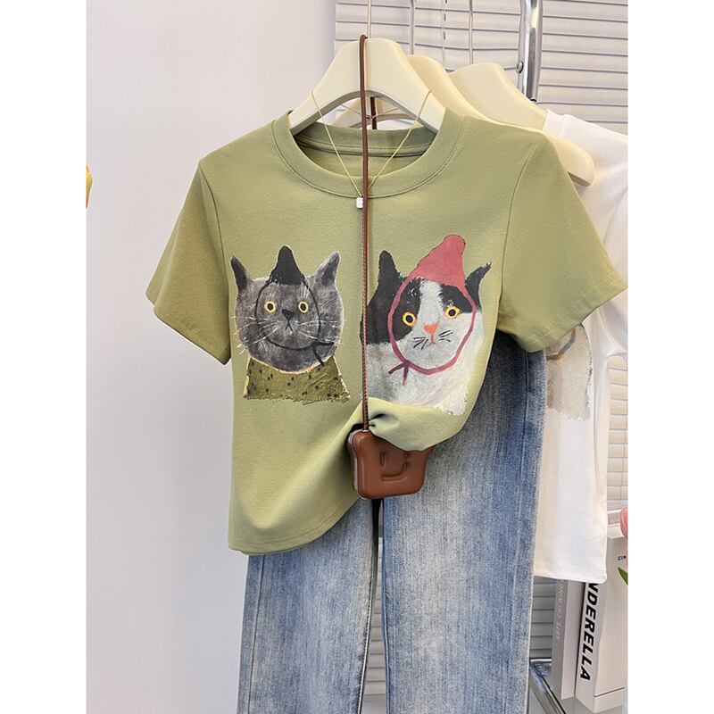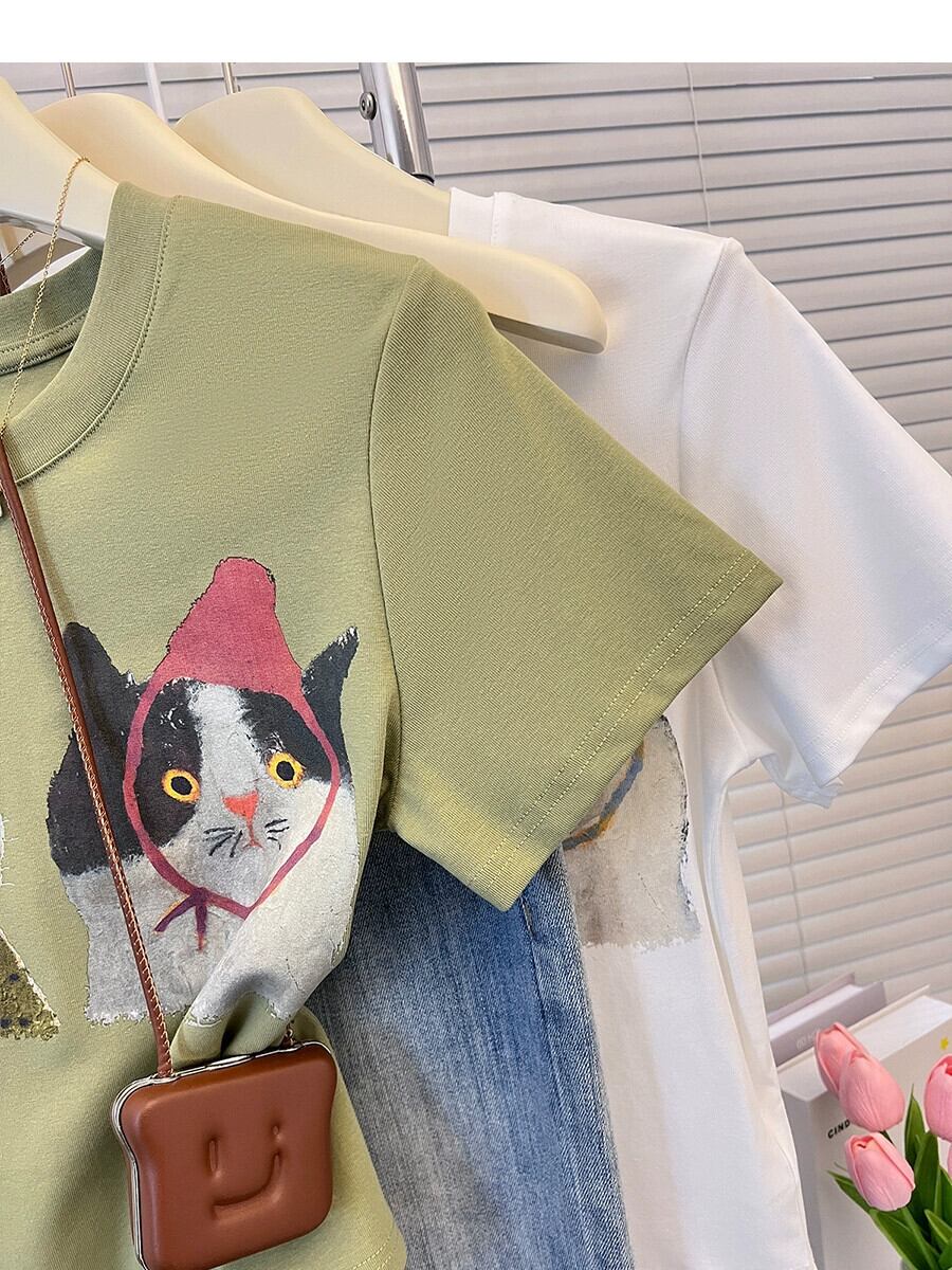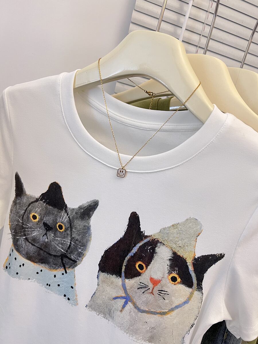 コットン漫画プリント半袖Tシャツレディース2023年夏新デザイン自己修養の感覚とスリムショルダーラウンドネックトップ サマー 夏物 Oネック 7460081744786193 | framboise21