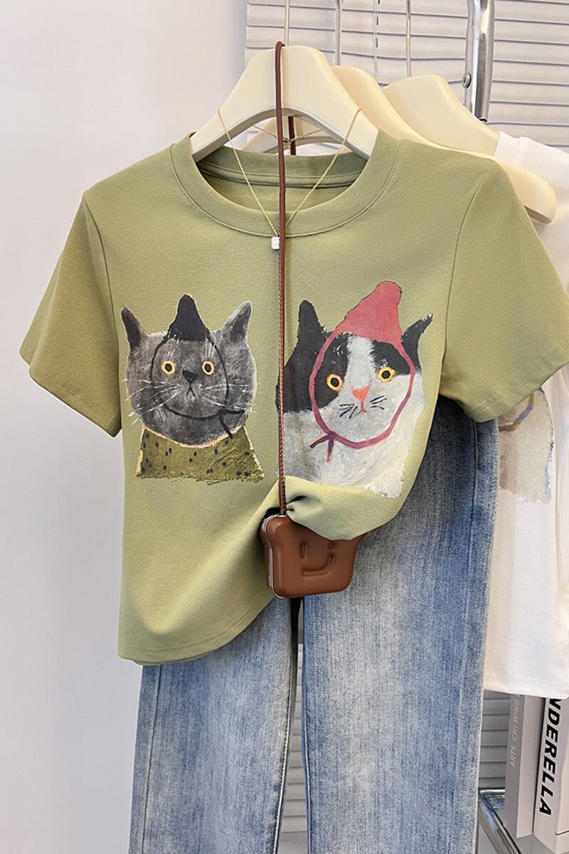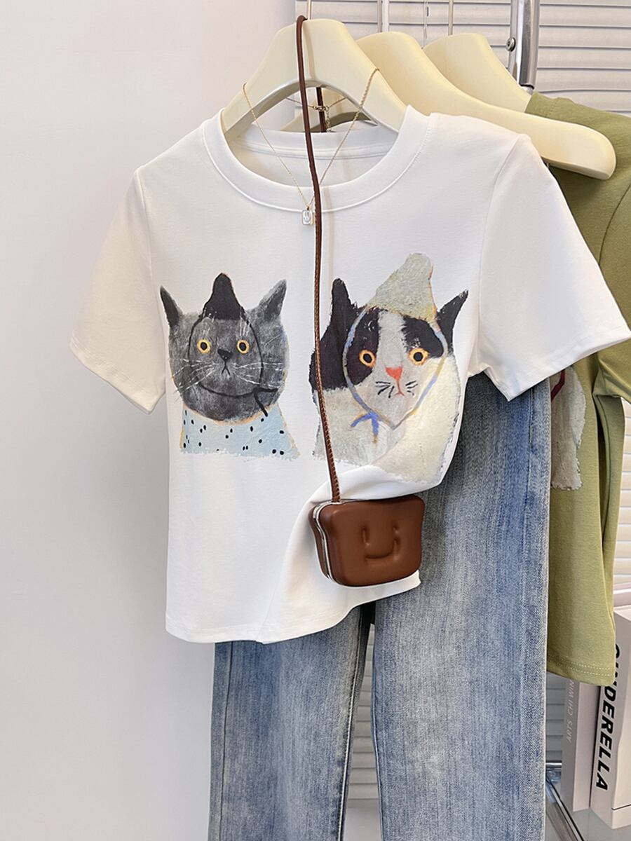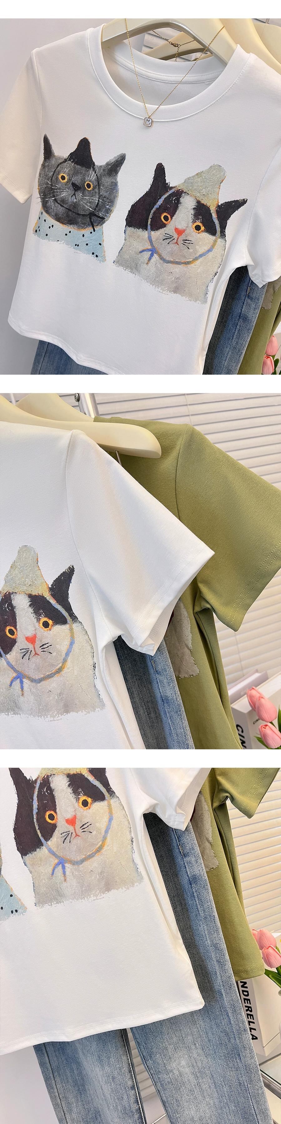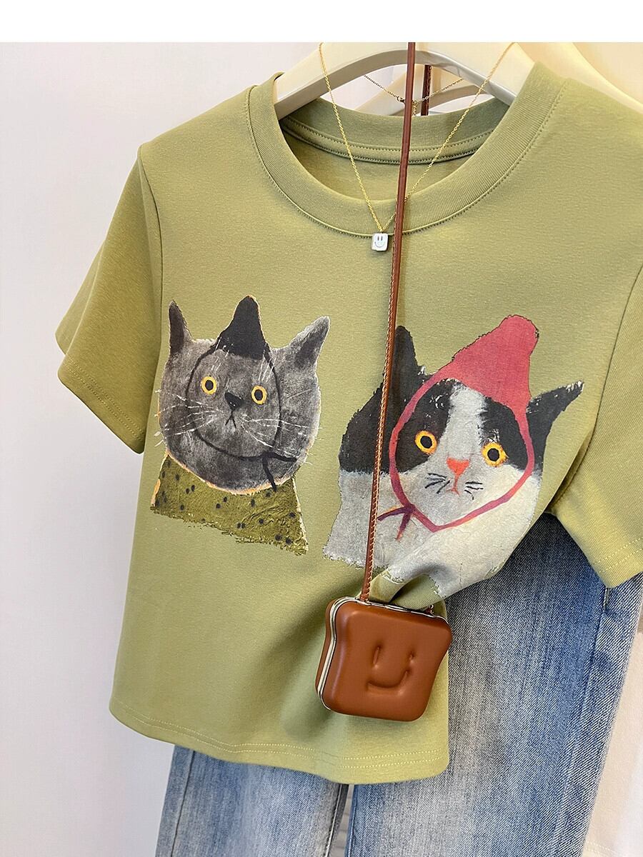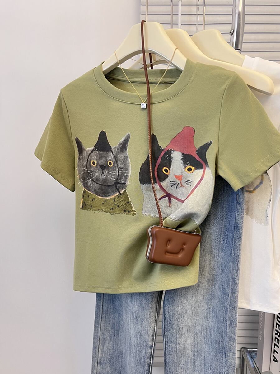 コットン漫画プリント半袖Tシャツレディース2023年夏新デザイン自己修養の感覚とスリムショルダーラウンドネックトップ サマー 夏物 Oネック 7460081744786193 | framboise21