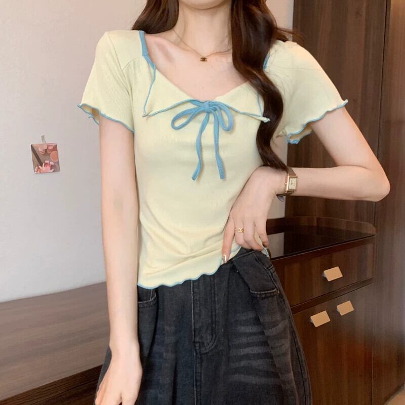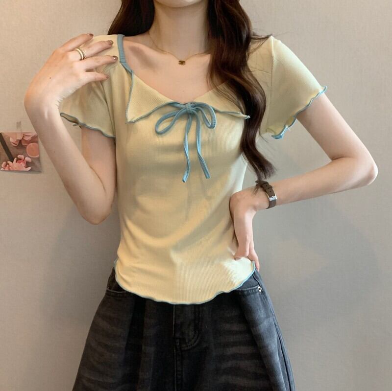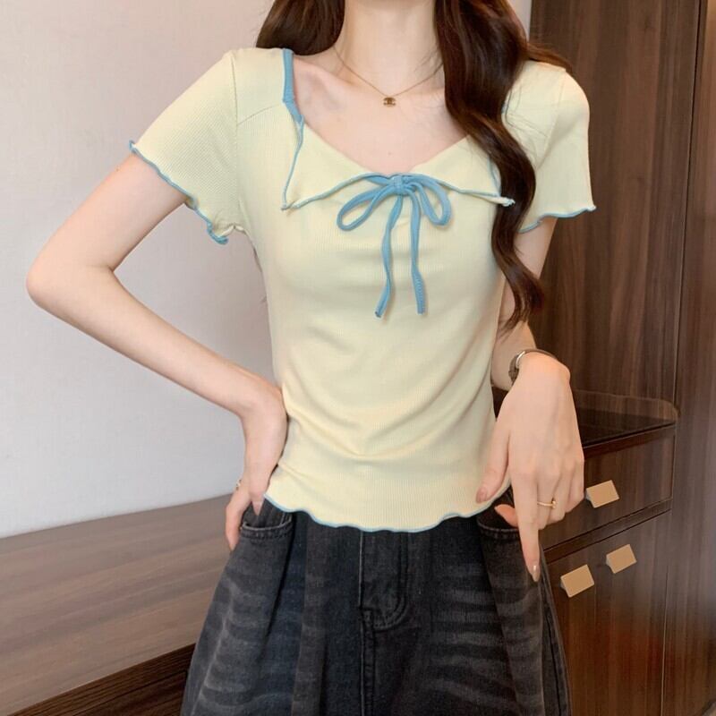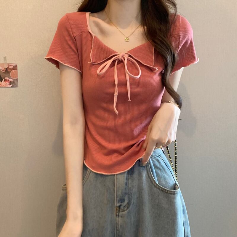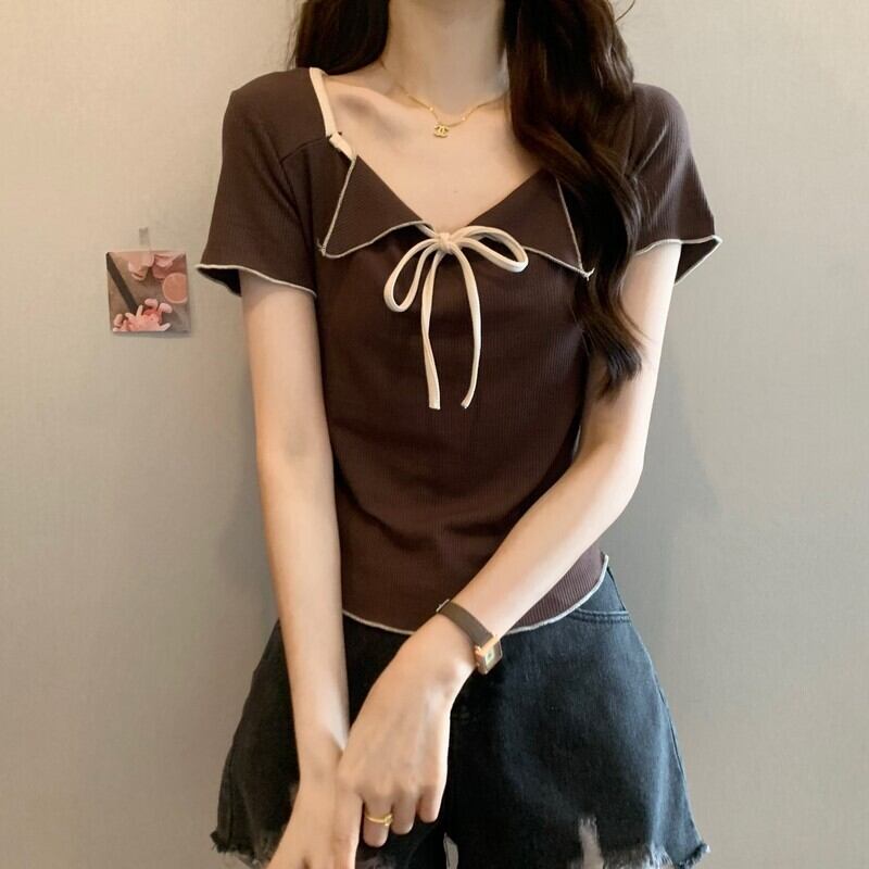 フロントショルダーラペル半袖Tシャツレディース夏フレンチデザイン自己修養感オールマッチイレギュラーショートタイVネックトップ サマー 夏物 7460090174900668 | framboise21