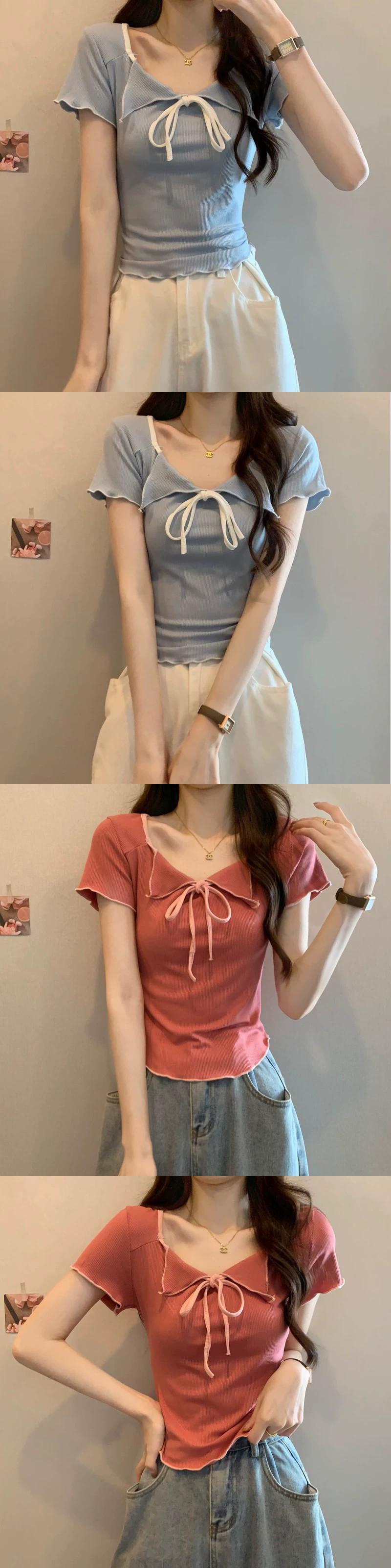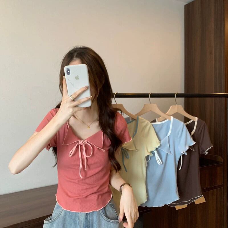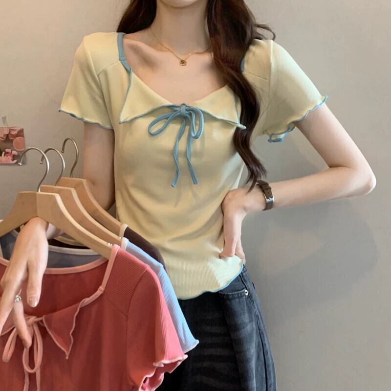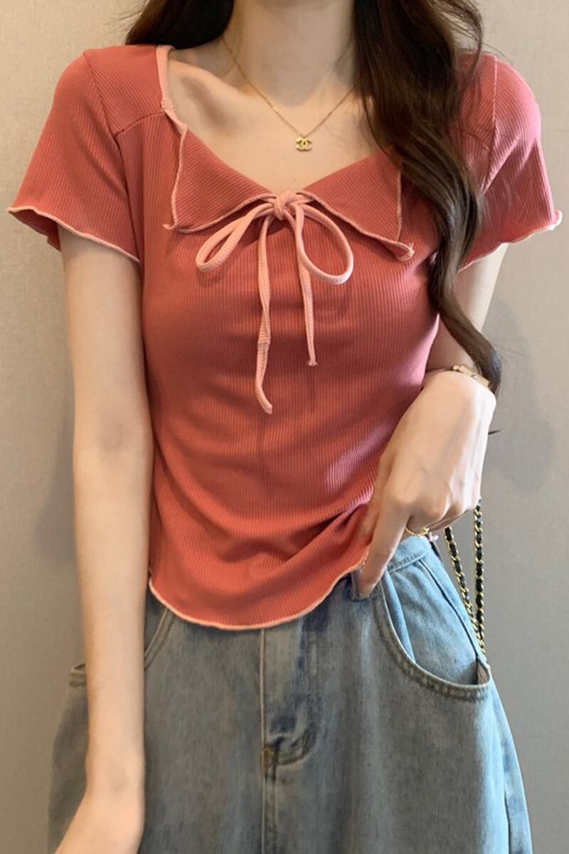 フロントショルダーラペル半袖Tシャツレディース夏フレンチデザイン自己修養感オールマッチイレギュラーショートタイVネックトップ サマー 夏物 7460090174900668 | framboise21