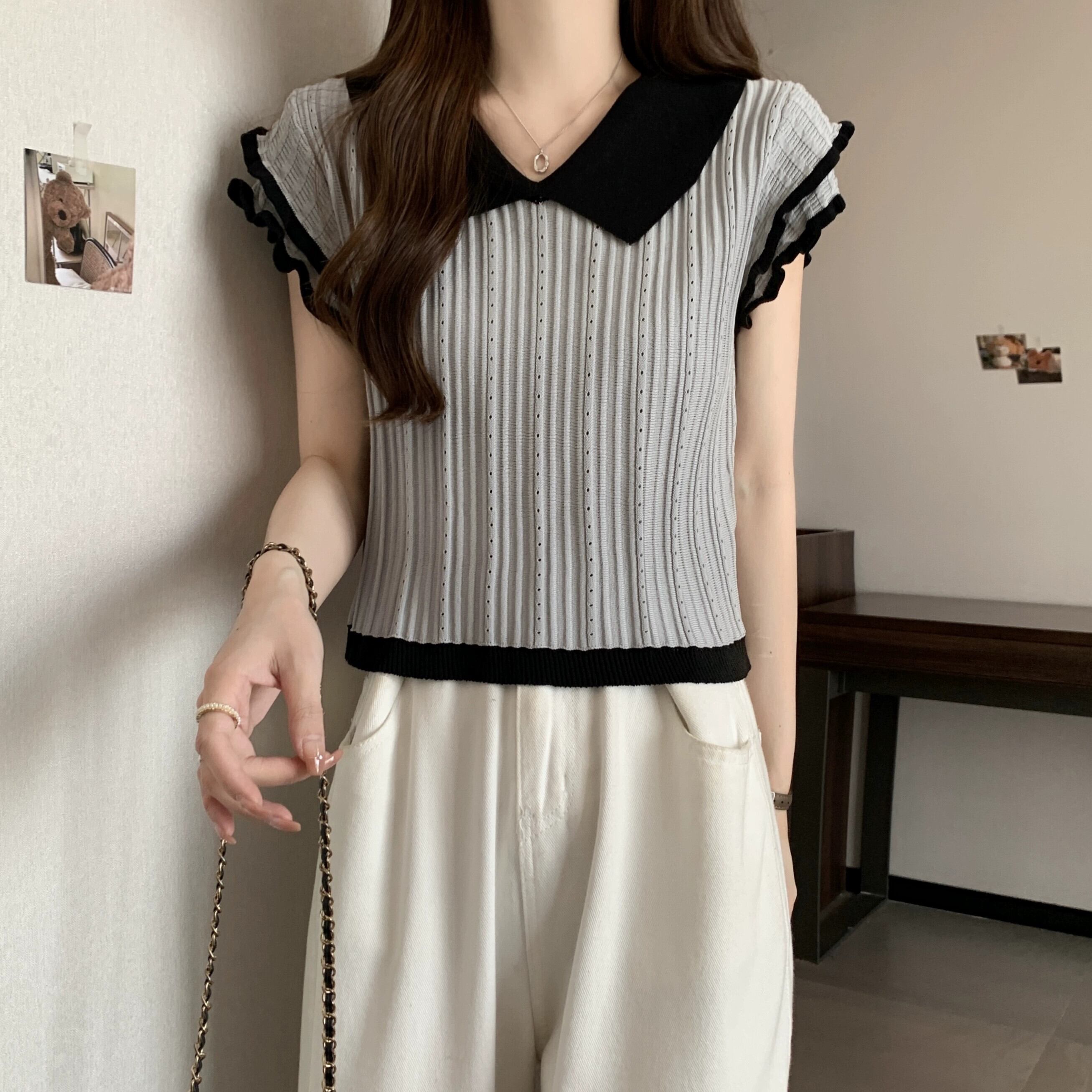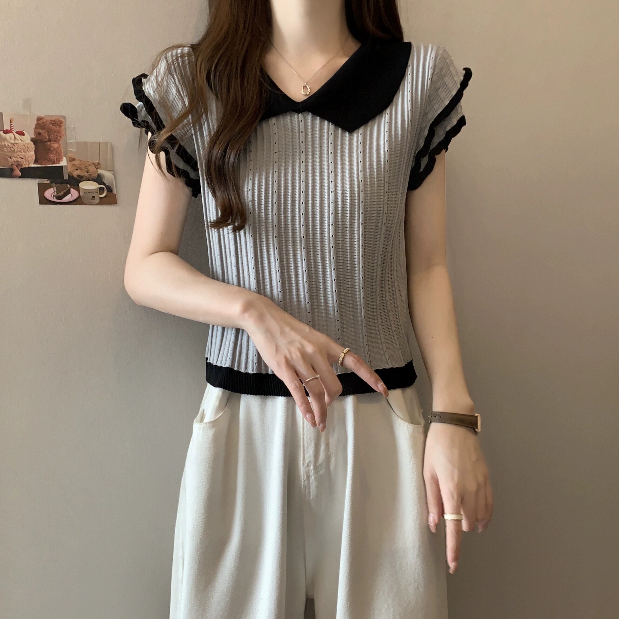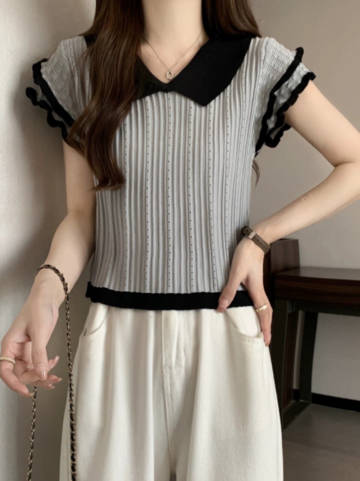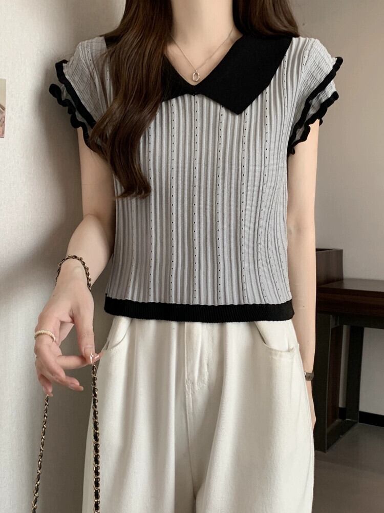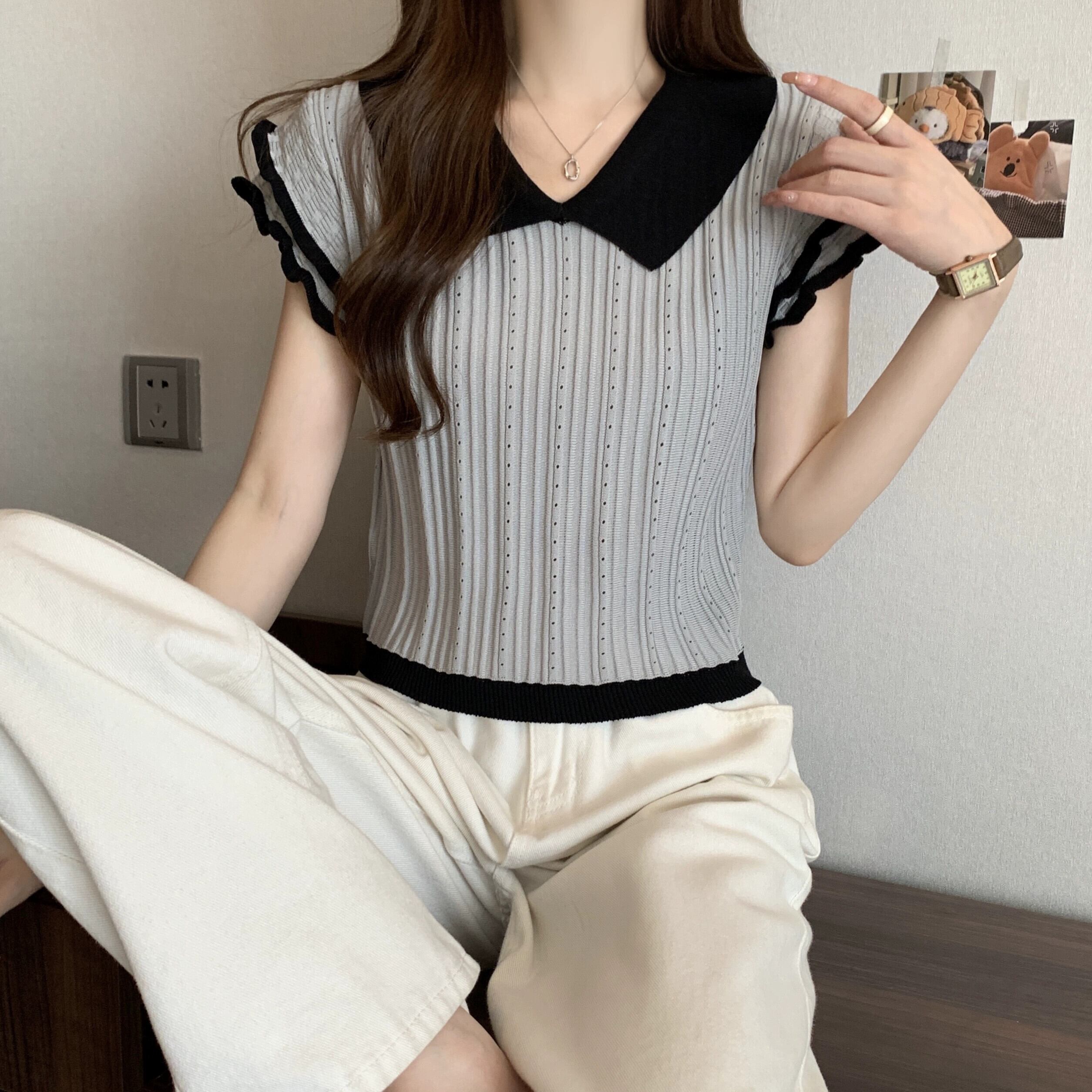アイスシルク半袖ニットセーター女性の夏の 2023 新しいフレンチデザイン自己修養の感覚オールマッチショートポロカラートップ サマー 夏物 7460030165458790 | framboise21