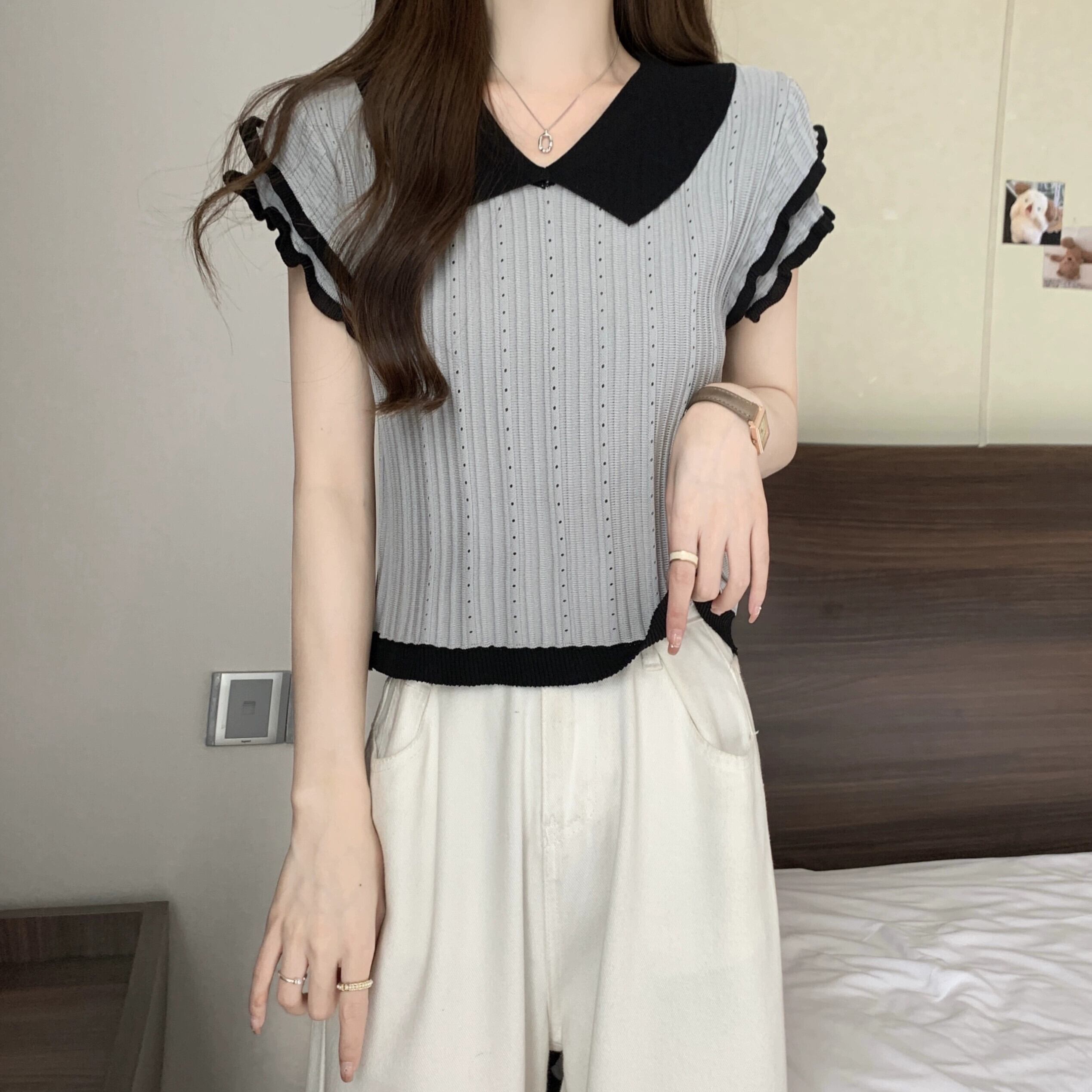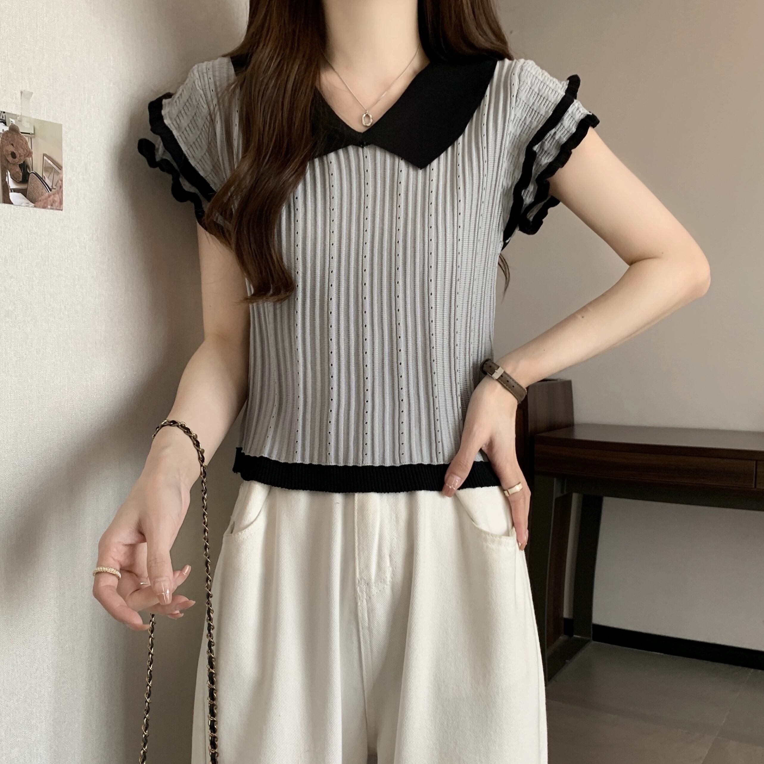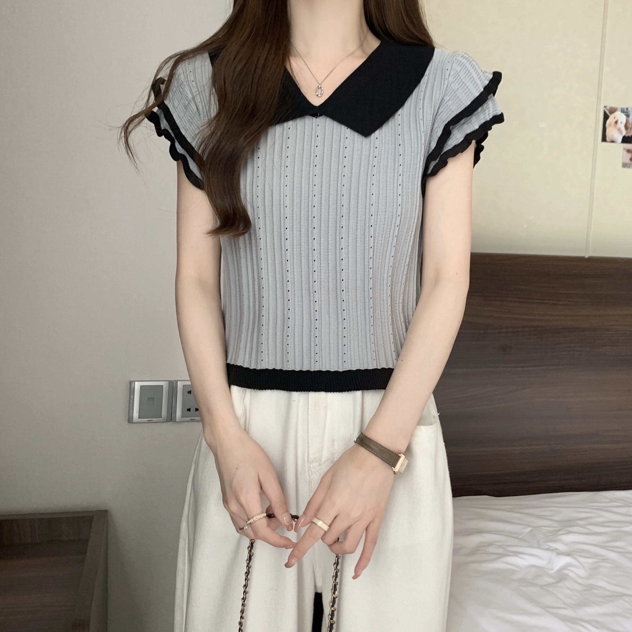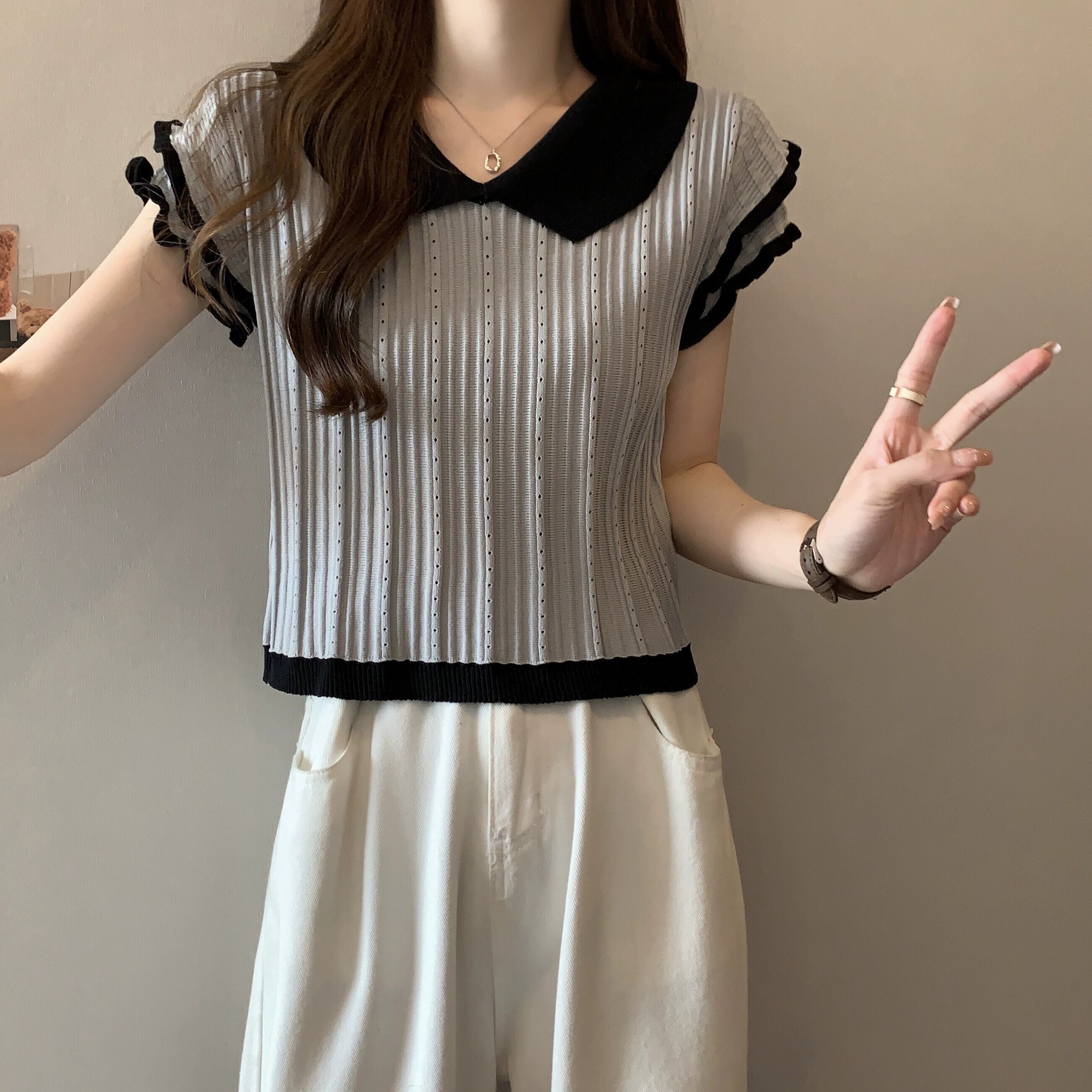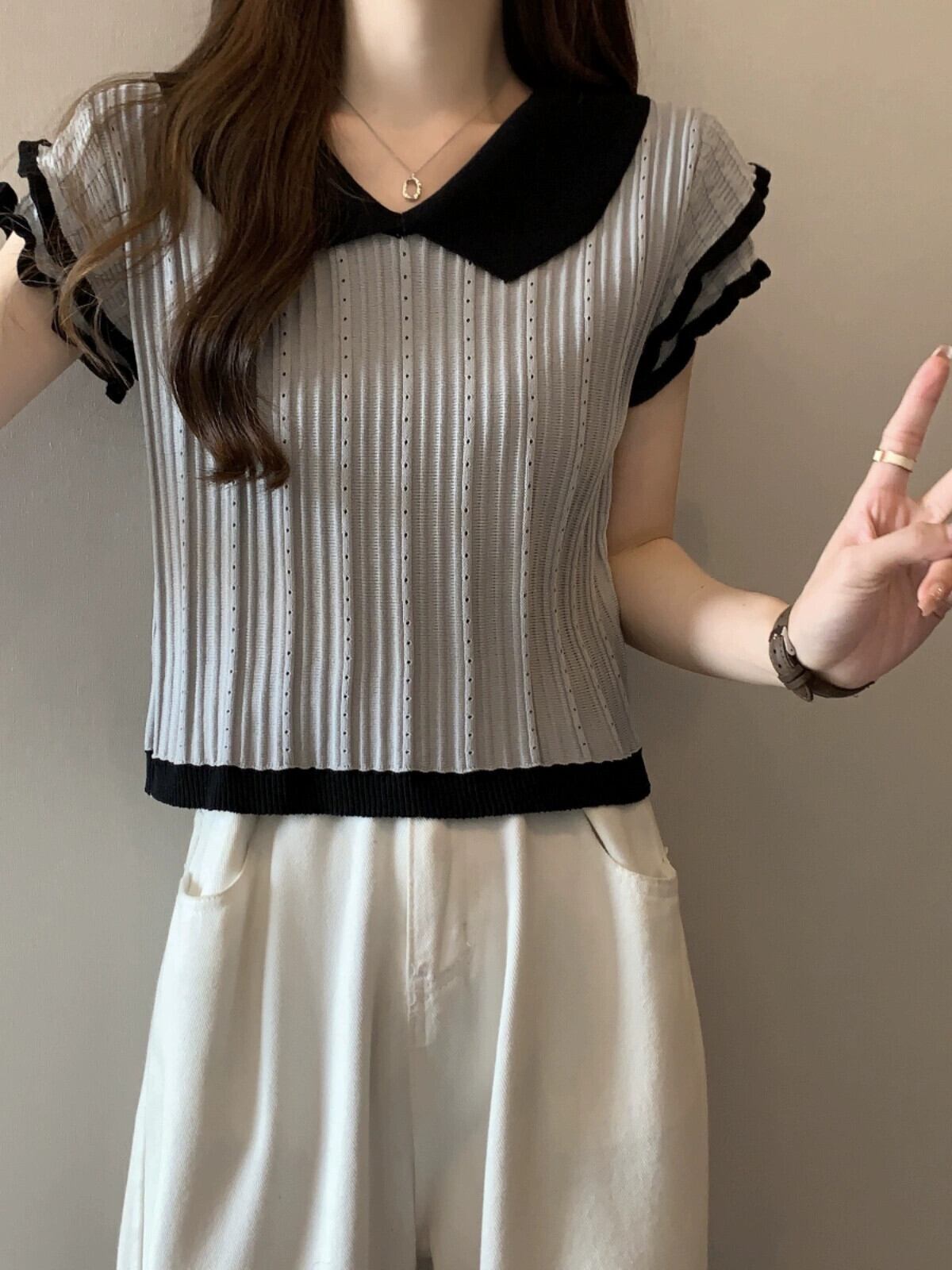 アイスシルク半袖ニットセーター女性の夏の 2023 新しいフレンチデザイン自己修養の感覚オールマッチショートポロカラートップ サマー 夏物 7460030165458790 | framboise21