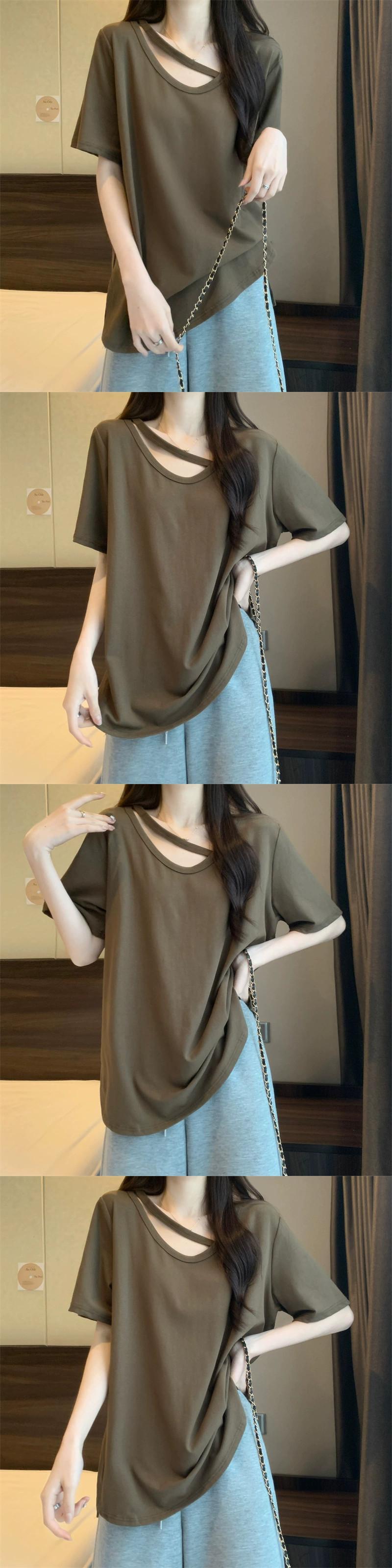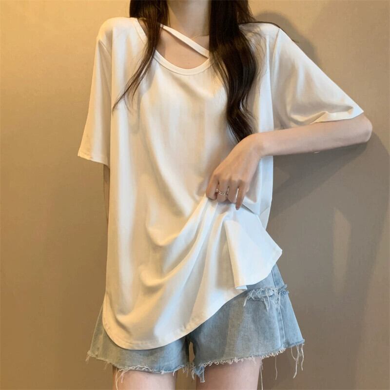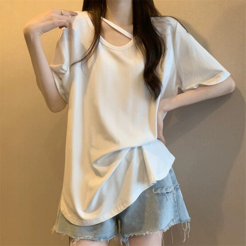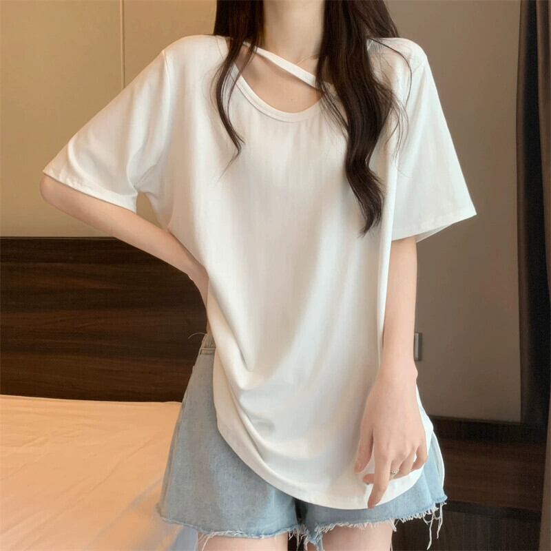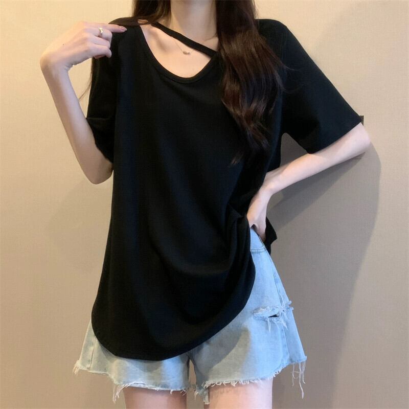ニッチルーズ半袖Tシャツレディース2023年夏新作ファッションデザインセンスミッドレングスラウンドネック半袖トップスブラック サマー 夏物 Oネック 7460040575659642 | framboise21
