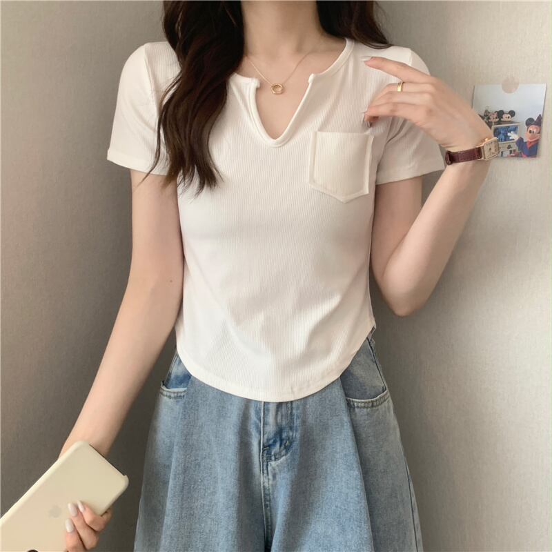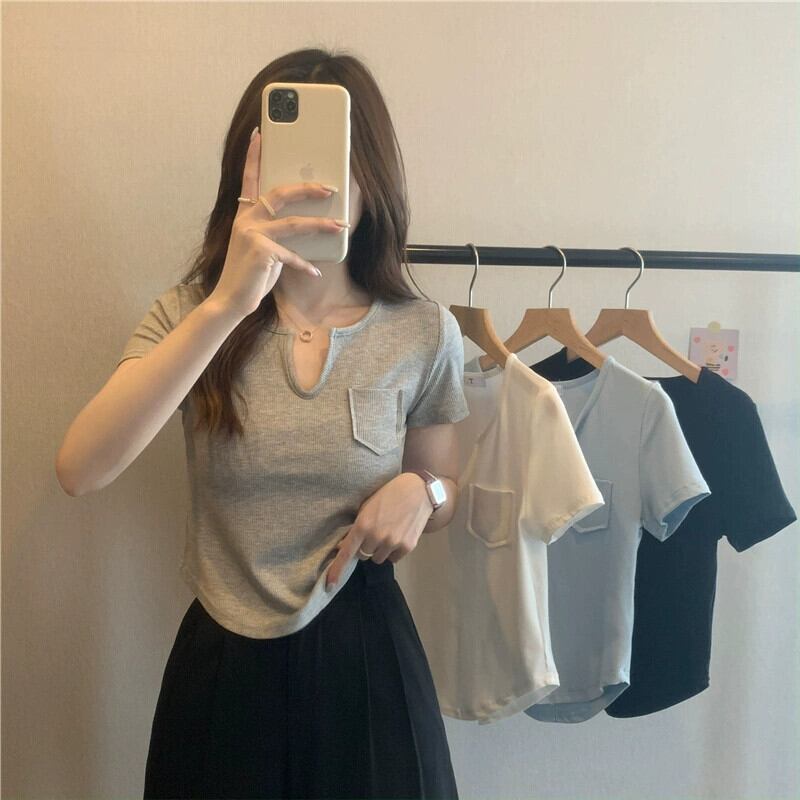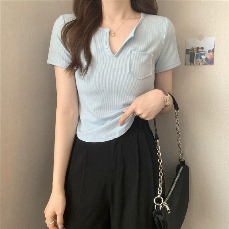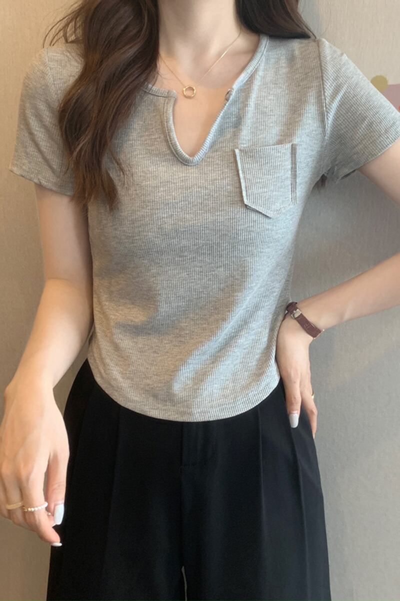 カーブヘムスリム半袖 Tシャツレディース 2023 夏の新しいファッションスリムグレーショルダー V ネックショートトップ サマー 夏物 Vネック 7460028788598779 | framboise21