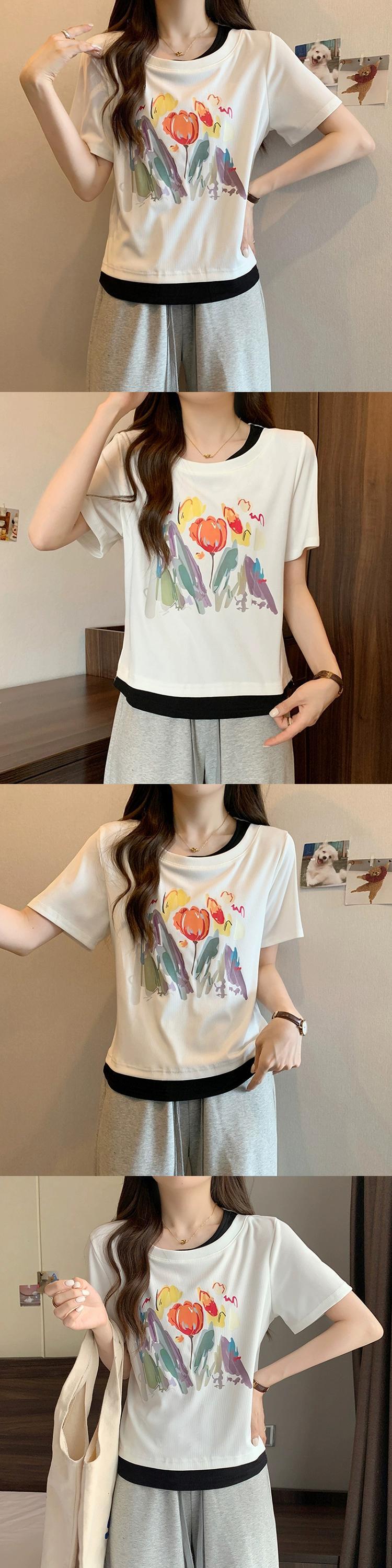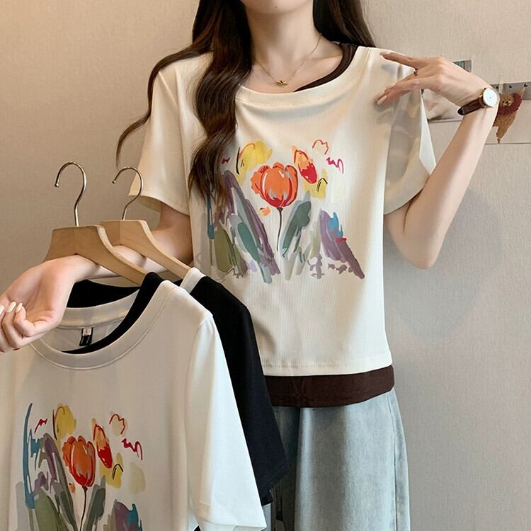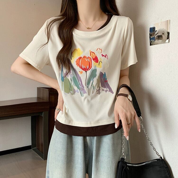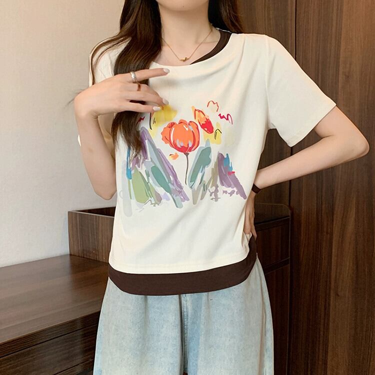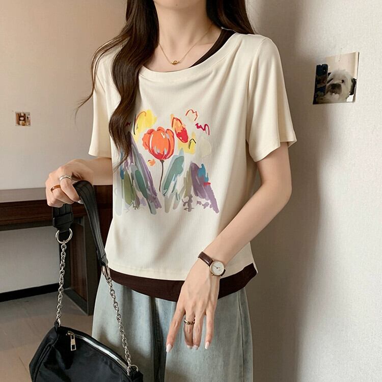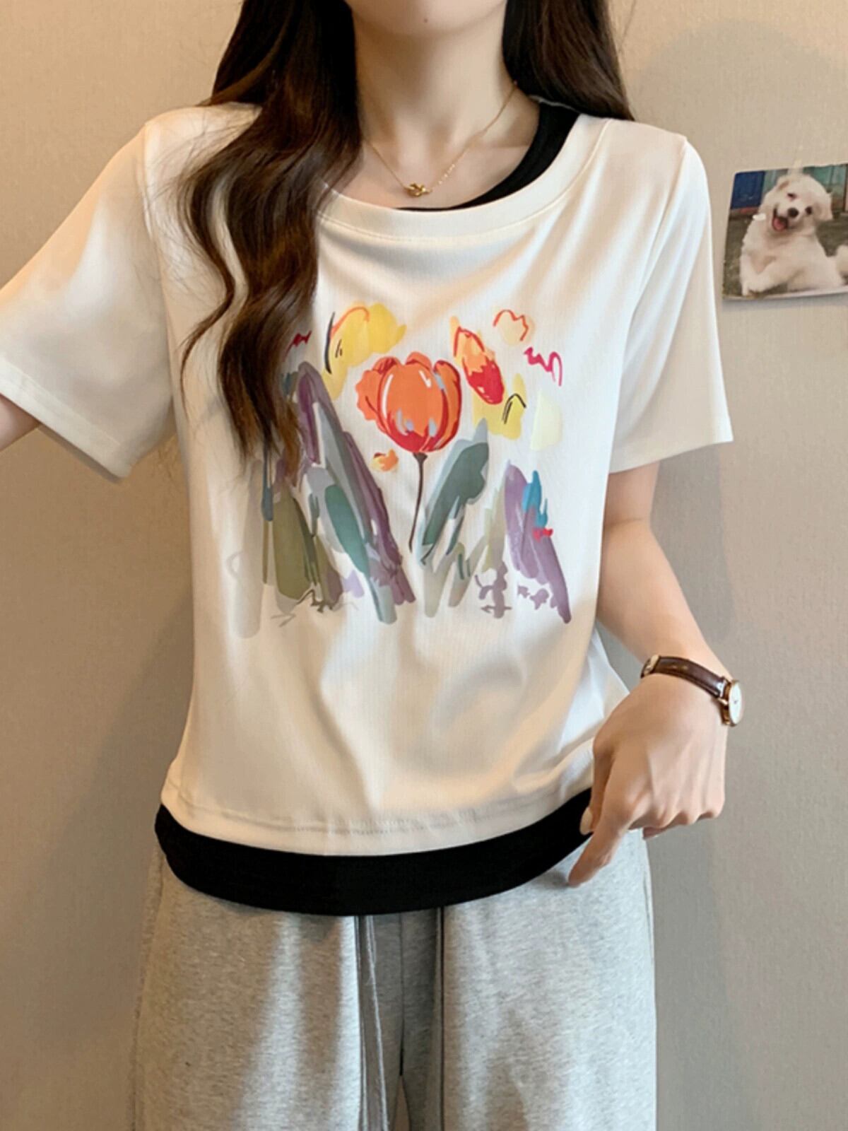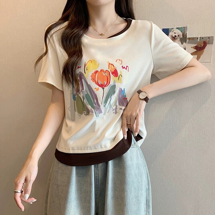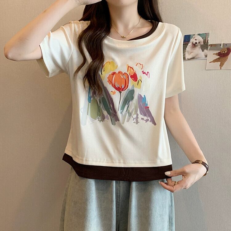 フェイクツーピースラウンドネック半袖Tシャツレディース2023年夏新作アメリカンデザインセンスルーズで万能なフロントショルダープリントトップス サマー 夏物 Oネック 7460091131004104 | framboise21