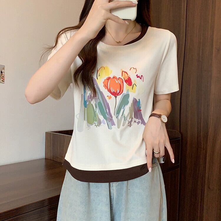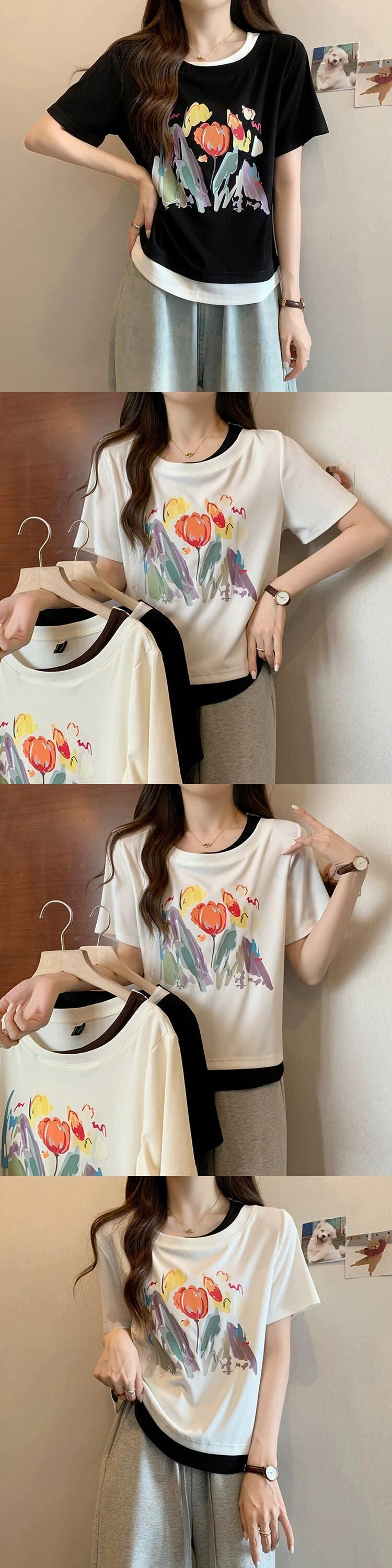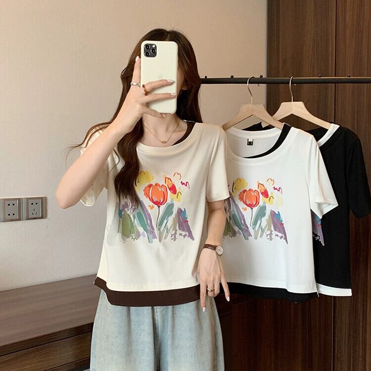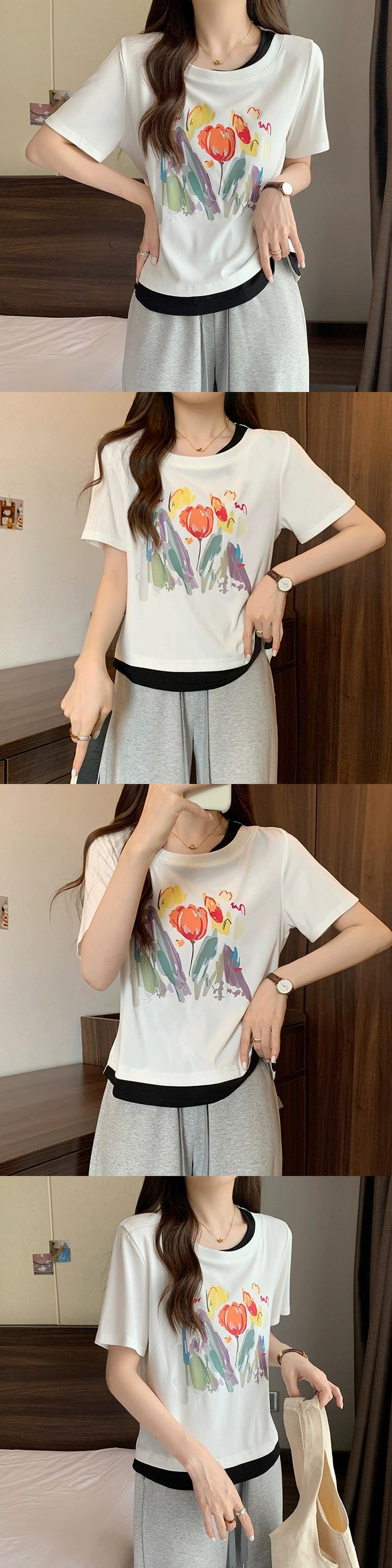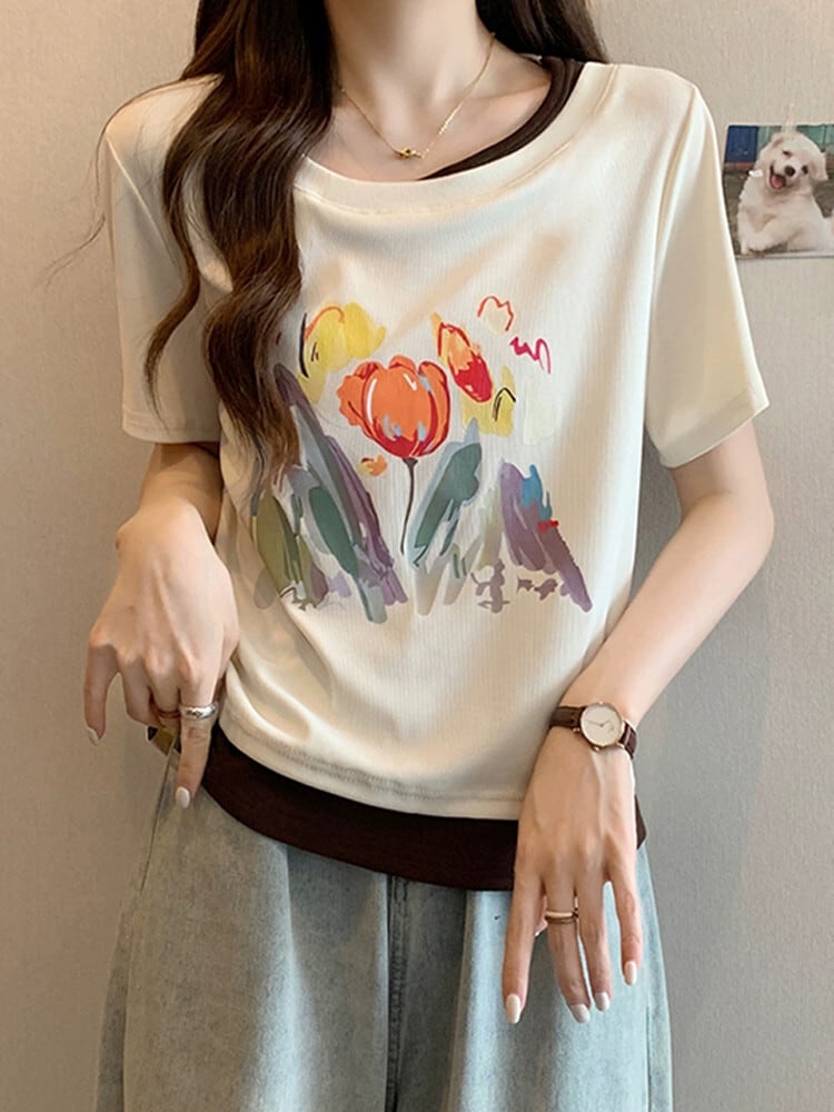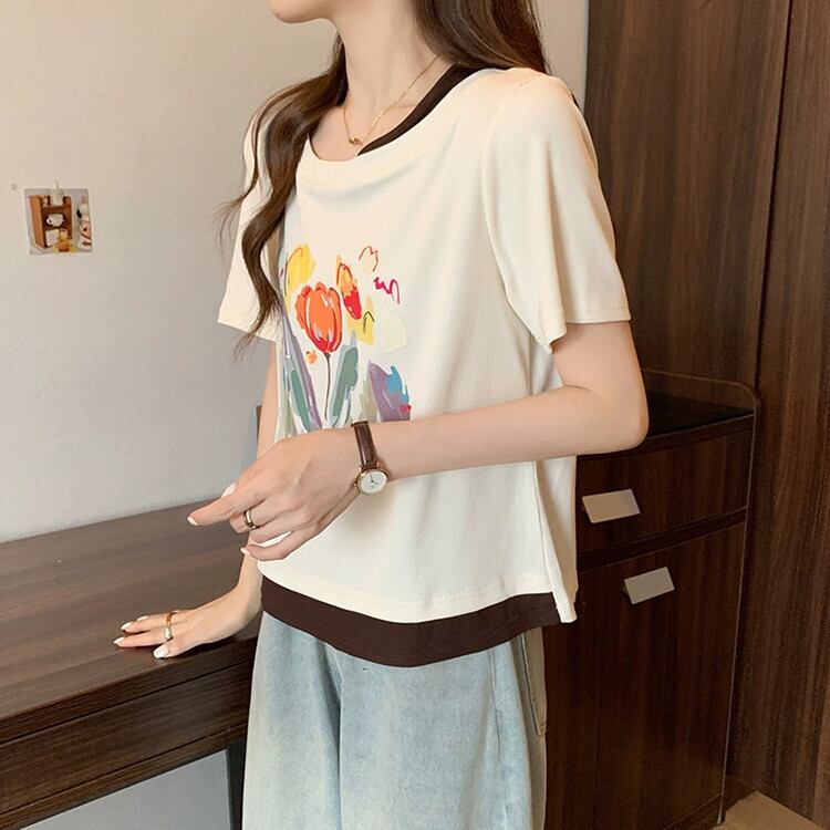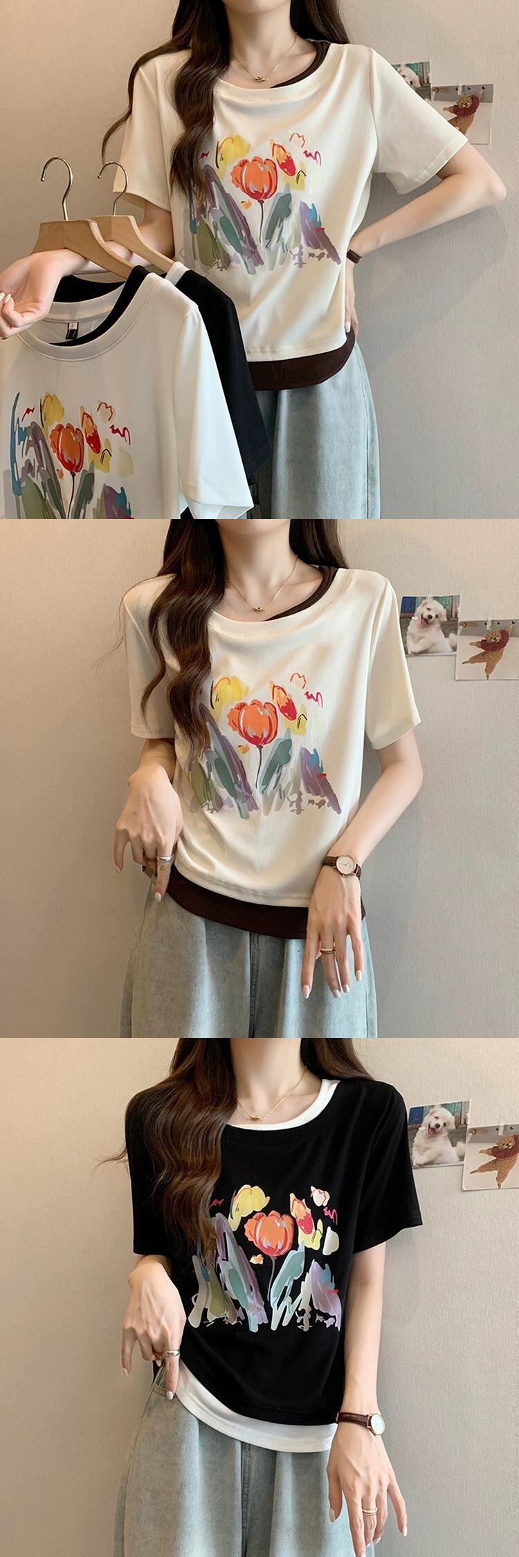 フェイクツーピースラウンドネック半袖Tシャツレディース2023年夏新作アメリカンデザインセンスルーズで万能なフロントショルダープリントトップス サマー 夏物 Oネック 7460091131004104 | framboise21