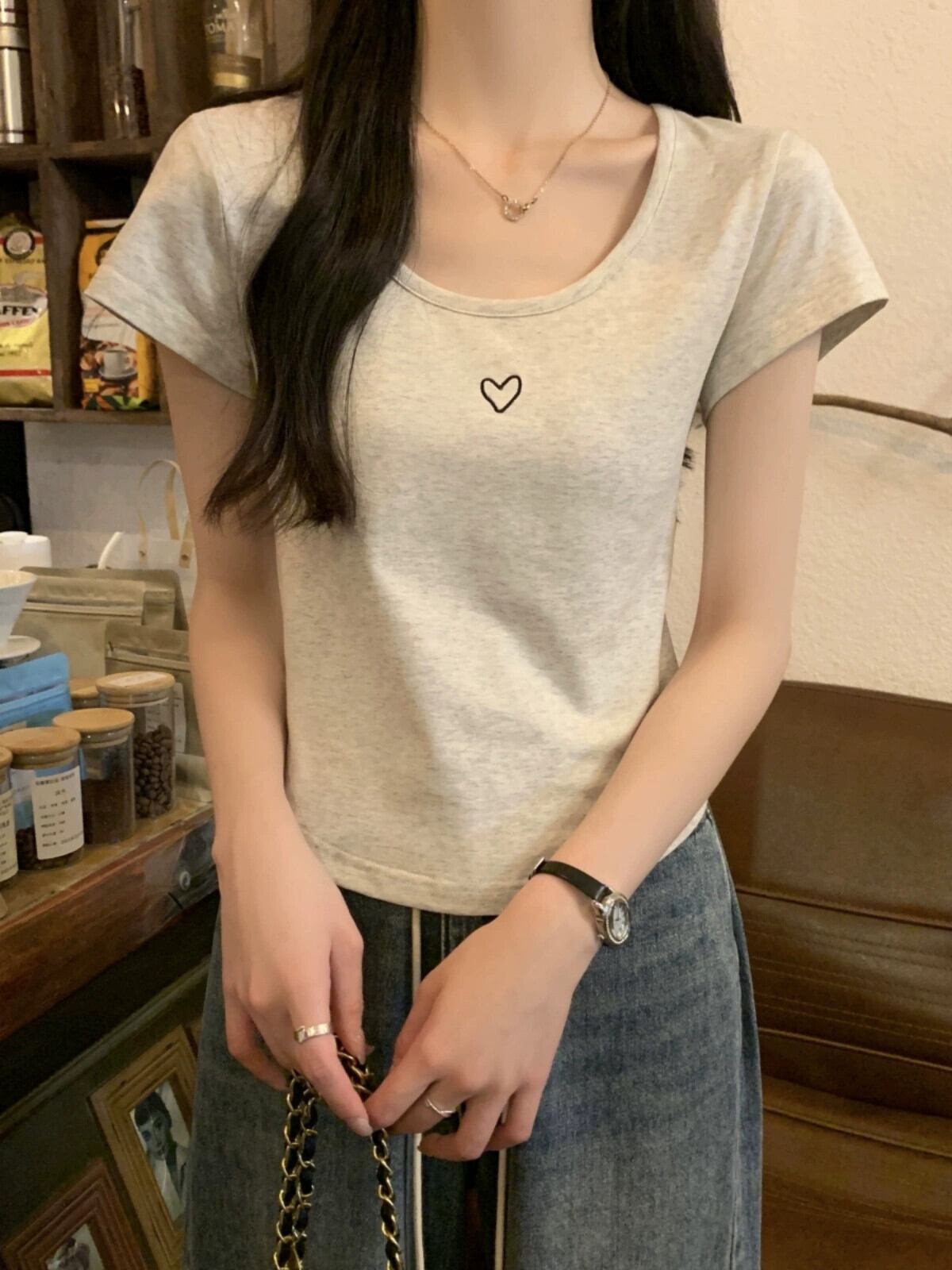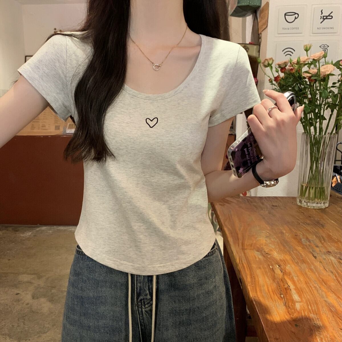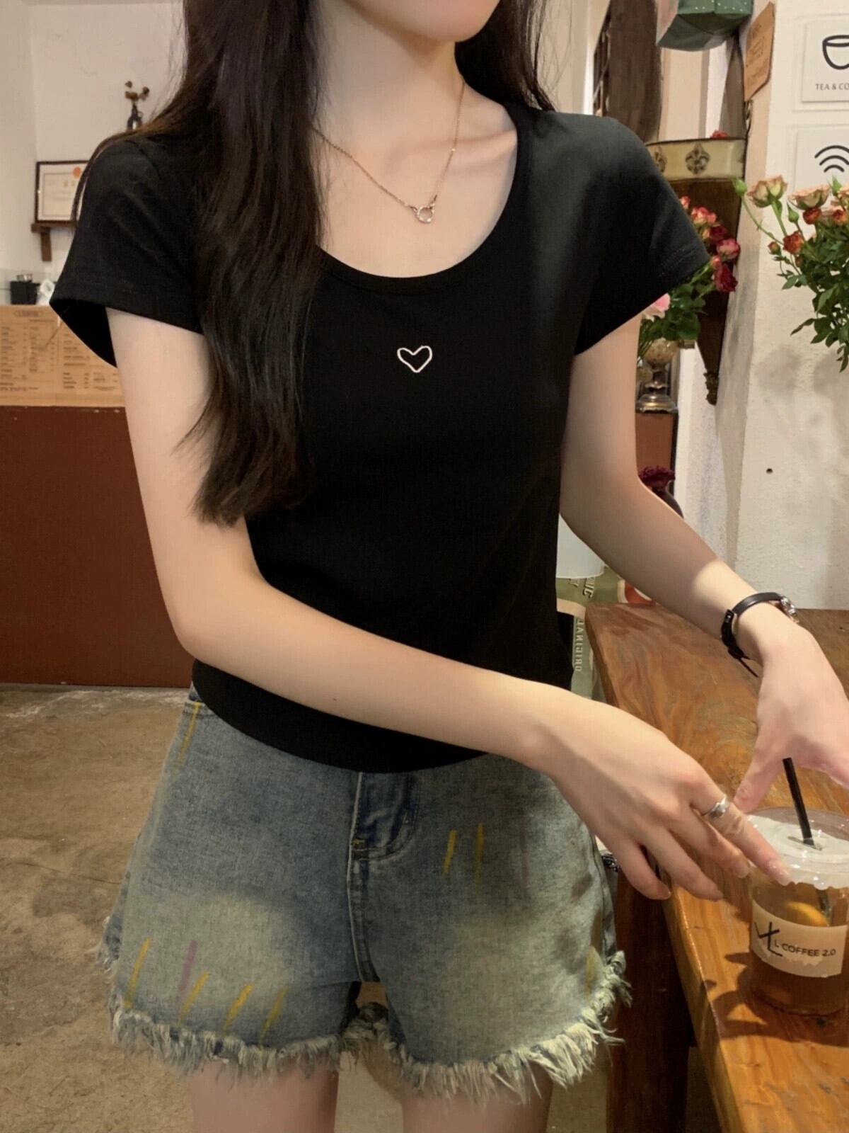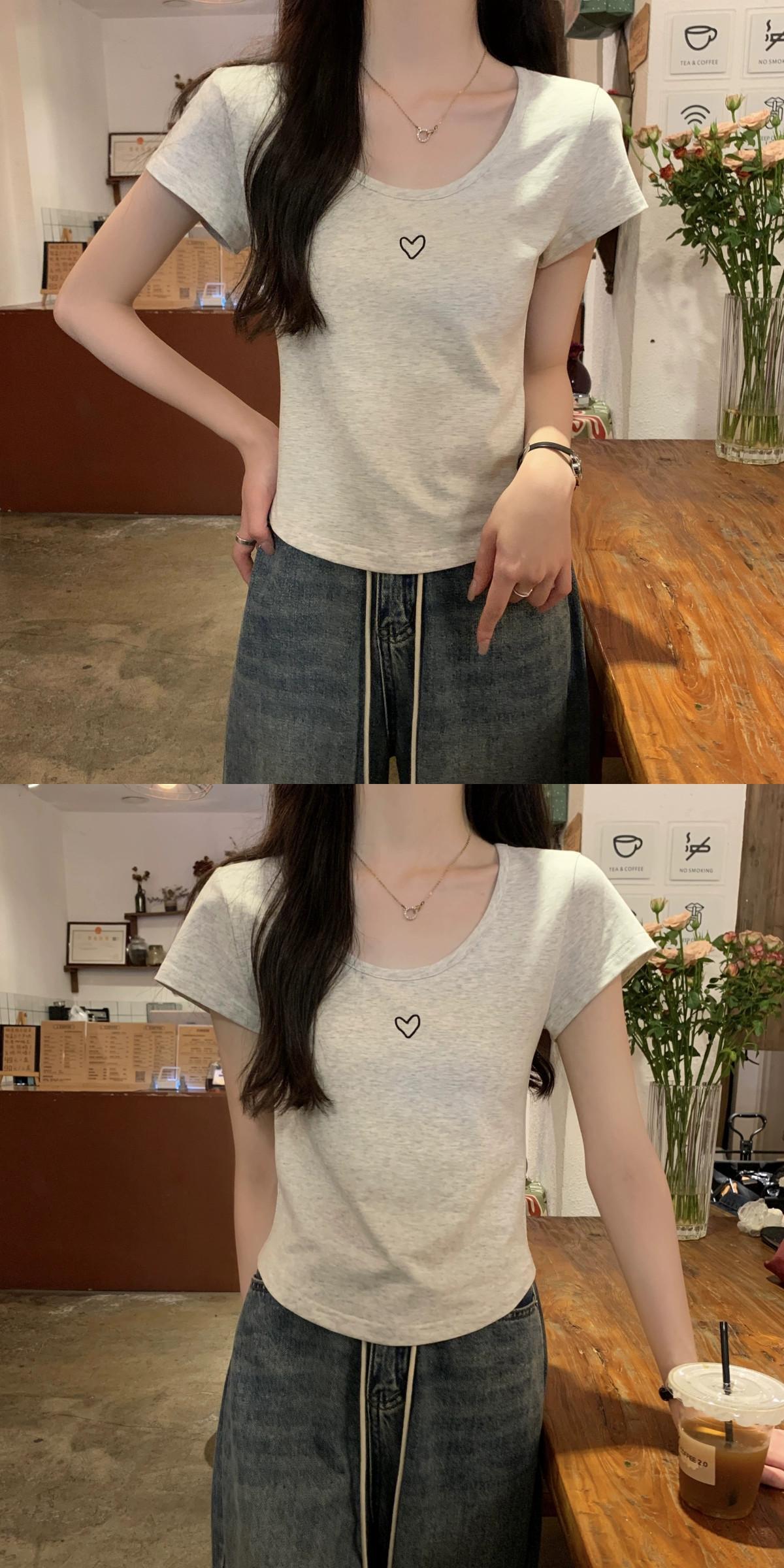 フロントショルダー純綿半袖Tシャツレディース2023年夏新デザインセンススリムフィットと薄いショート刺繍ラウンドネックトップ コットン サマー 夏物 Oネック ピュア 7460066709851580 | framboise21