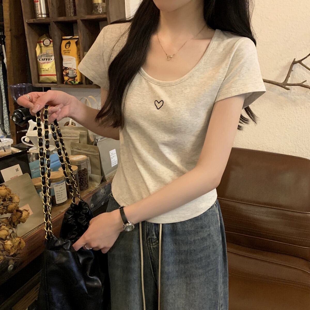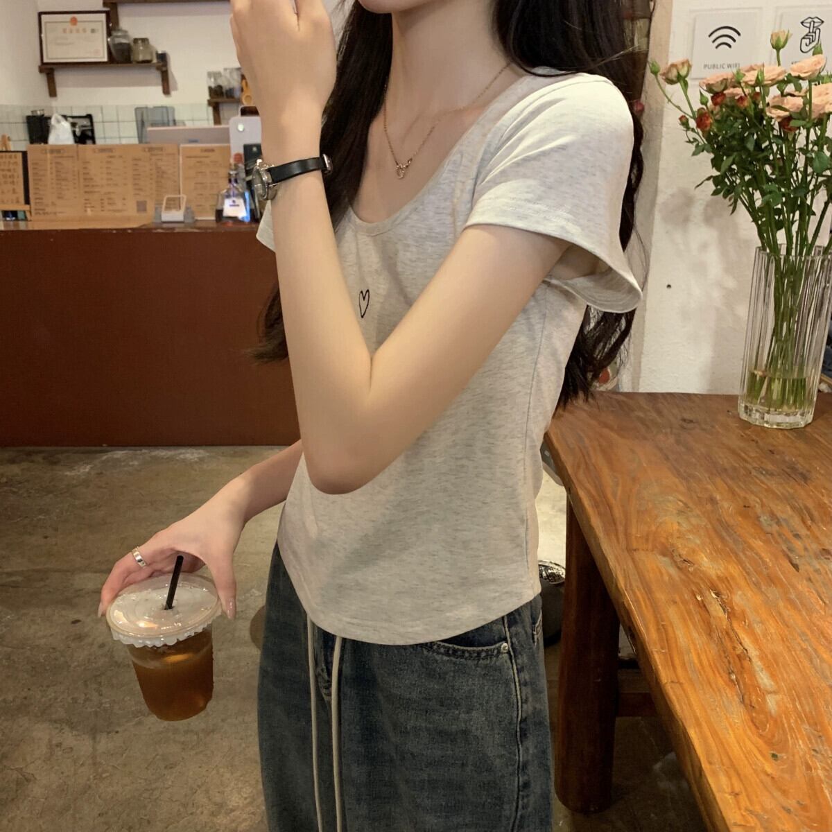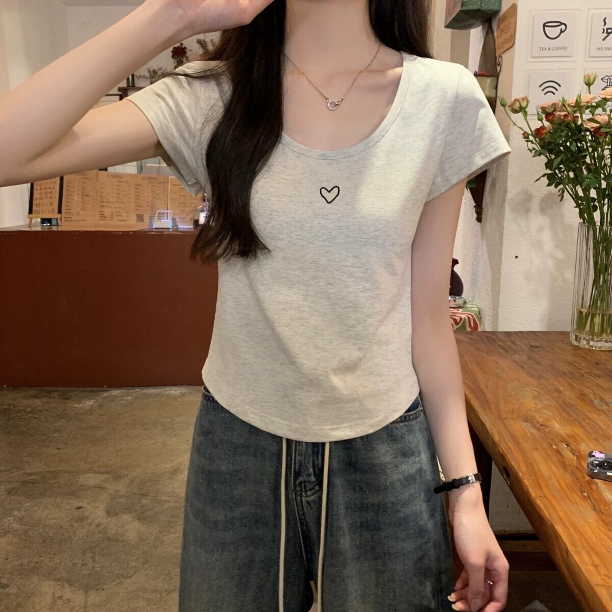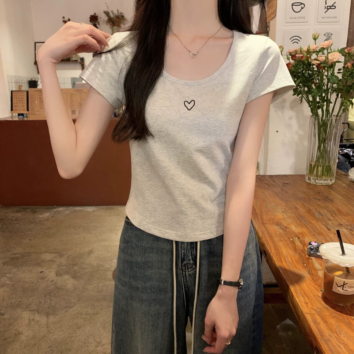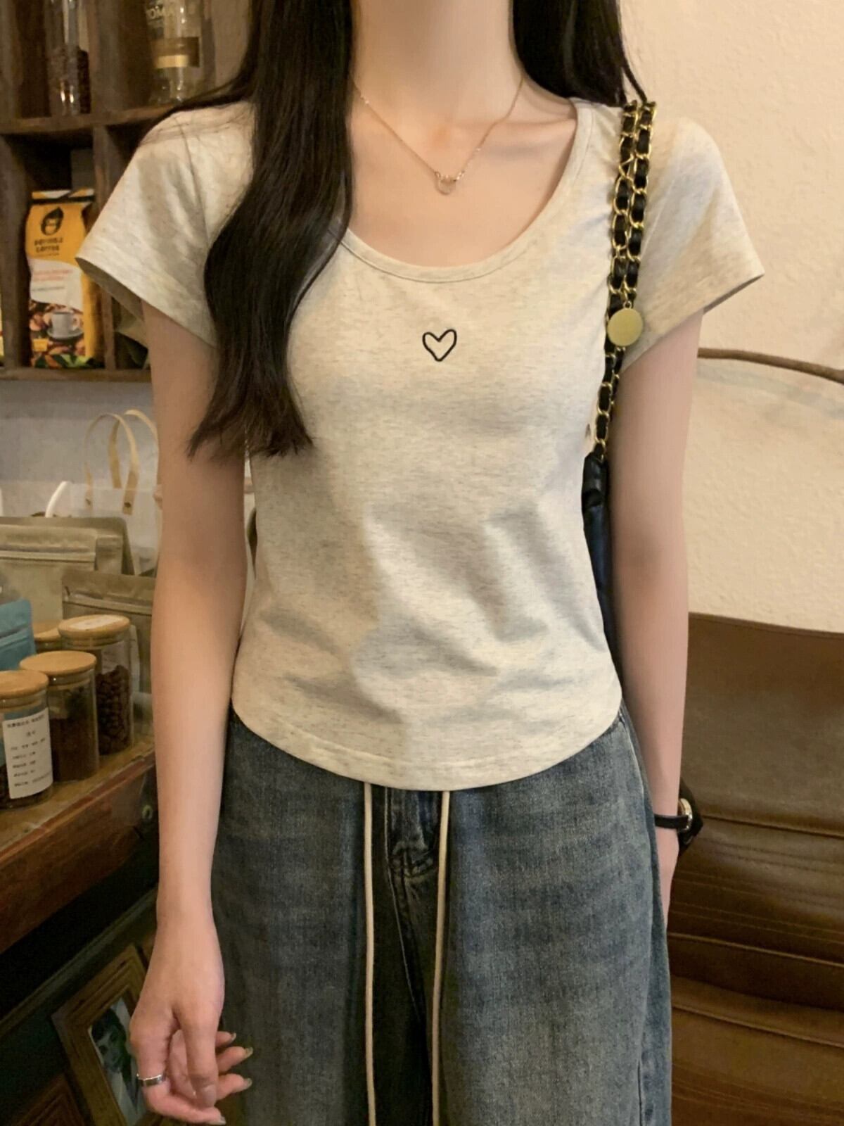 フロントショルダー純綿半袖Tシャツレディース2023年夏新デザインセンススリムフィットと薄いショート刺繍ラウンドネックトップ コットン サマー 夏物 Oネック ピュア 7460066709851580 | framboise21