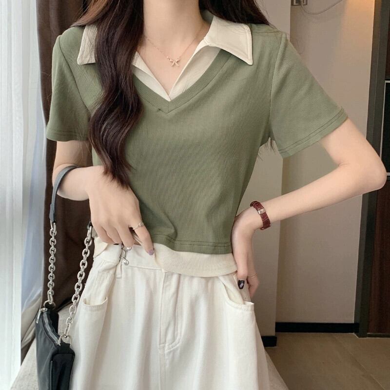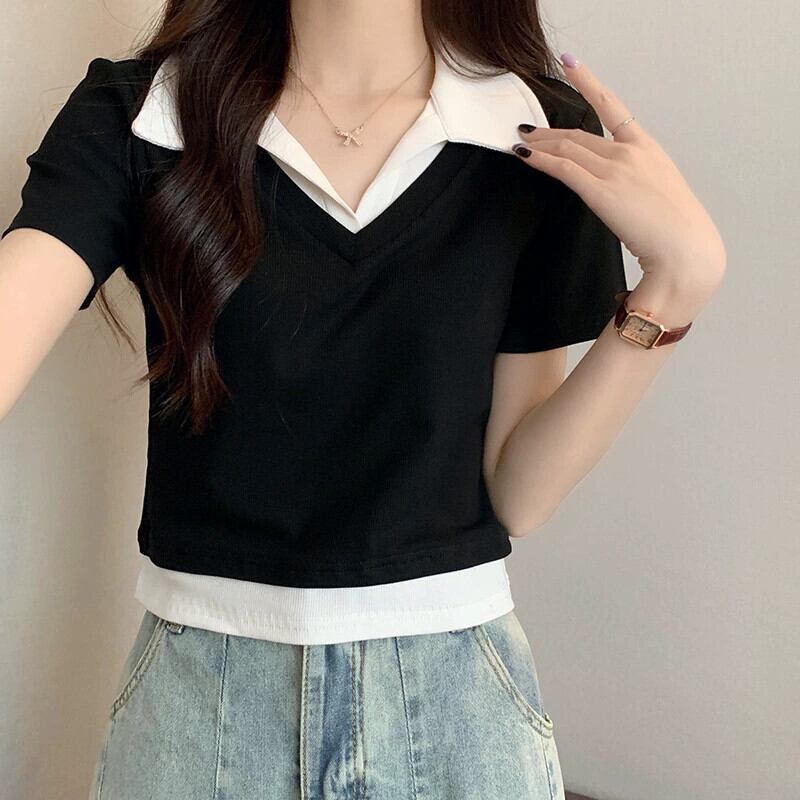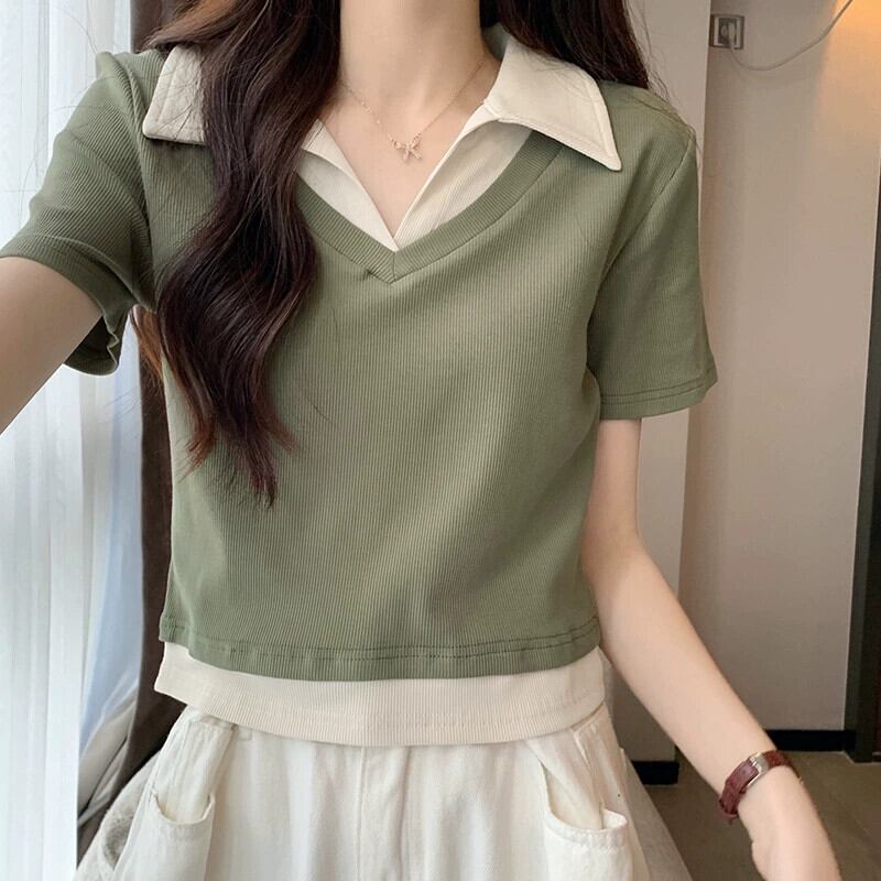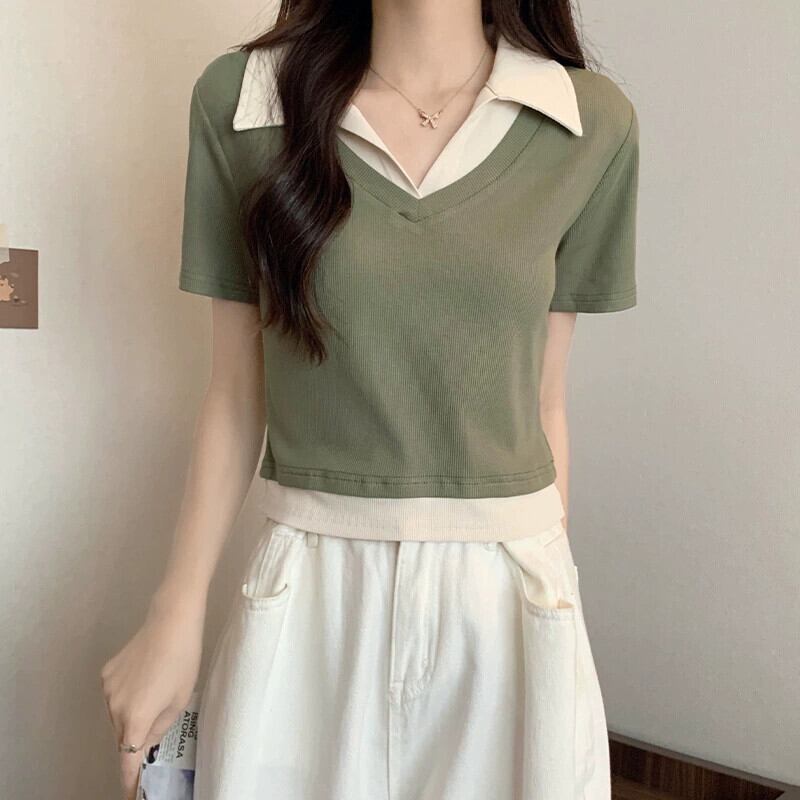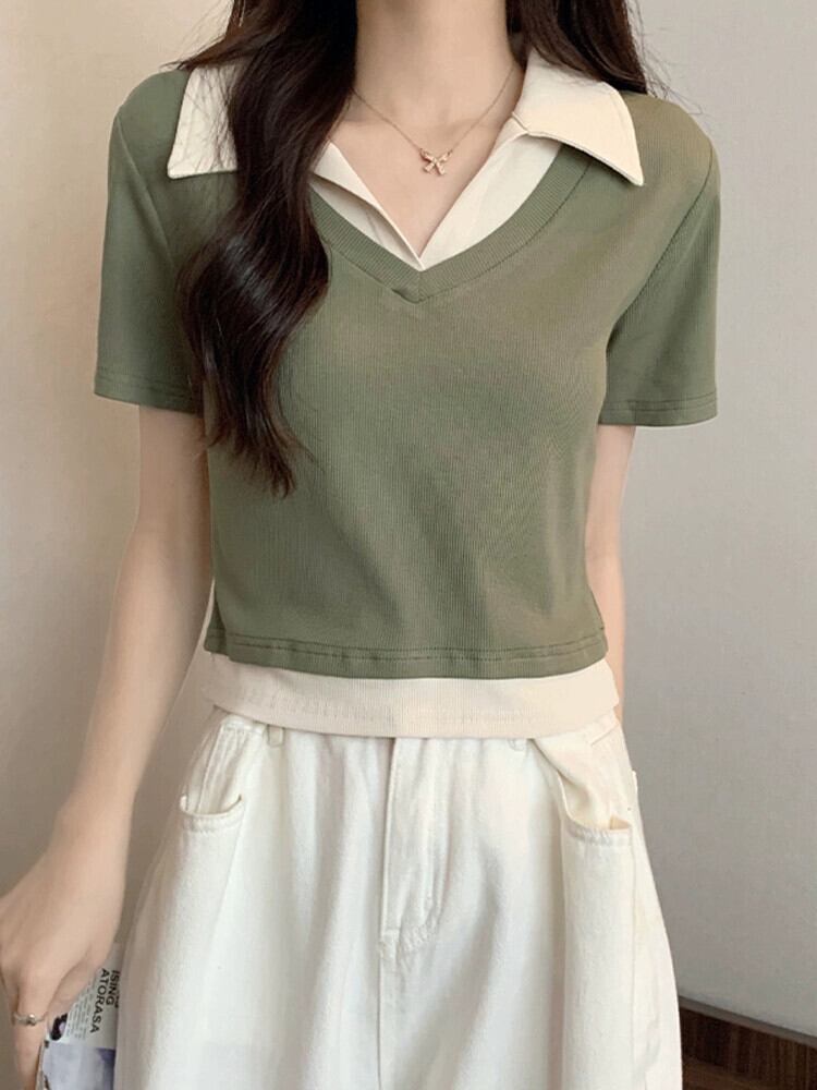 ステッチフェイクツーピースコントラストカラー半袖Tシャツレディース夏のレトロデザイン自己修養の感覚ショートポロカラーショルダートップ サマー 夏物 7460071890292080 | framboise21