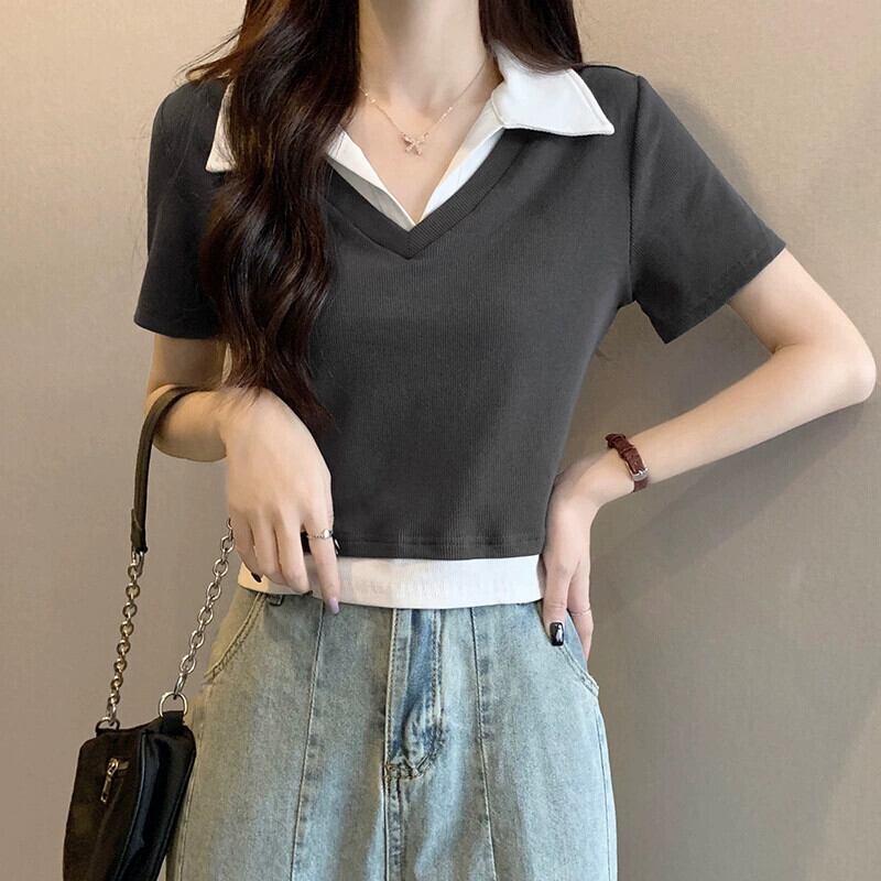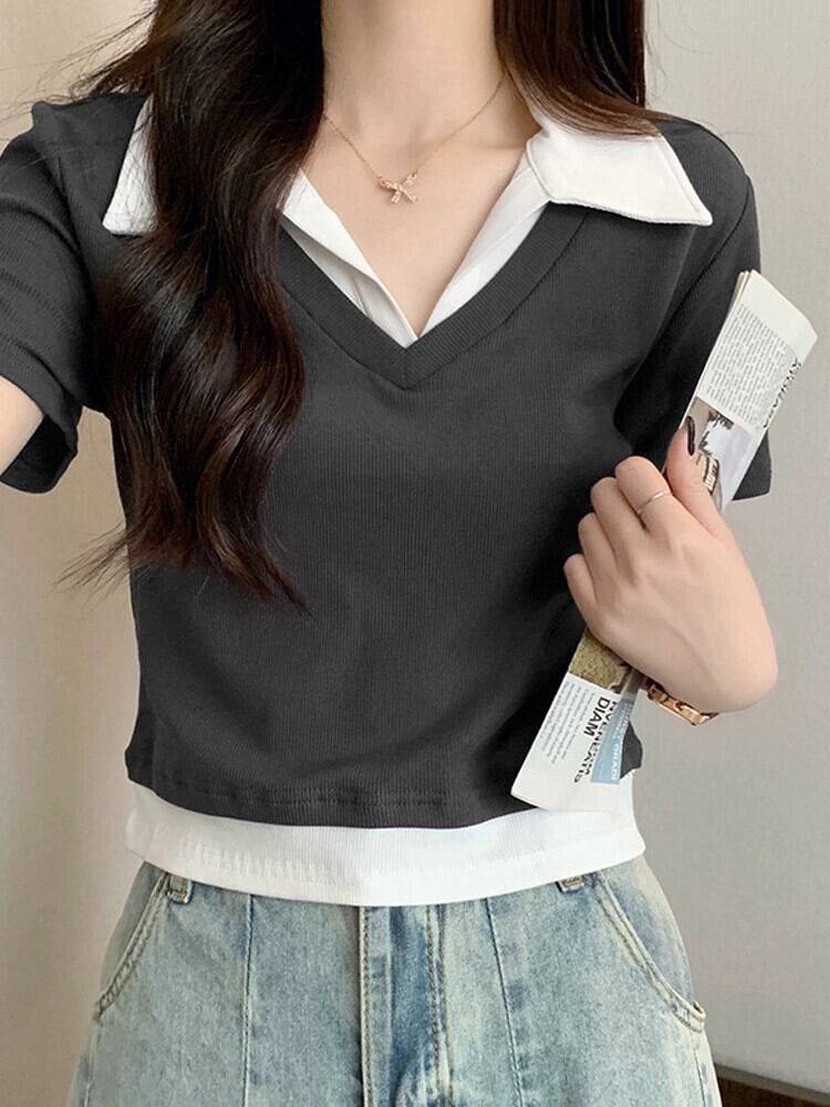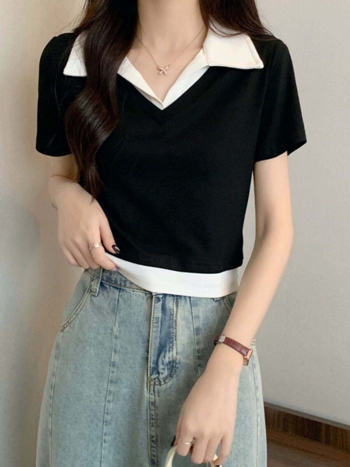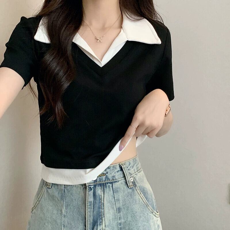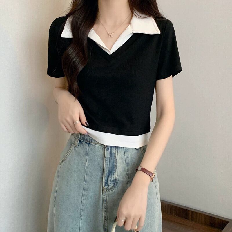 ステッチフェイクツーピースコントラストカラー半袖Tシャツレディース夏のレトロデザイン自己修養の感覚ショートポロカラーショルダートップ サマー 夏物 7460071890292080 | framboise21